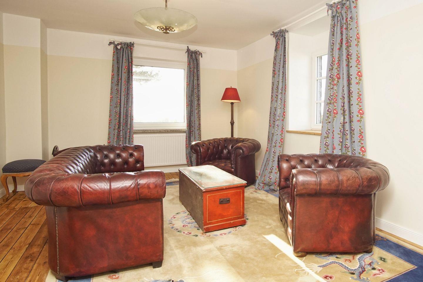 WOHNEN // Wohnzimmer im Obergeschoss mit bequemer Ledercouch und Ledersessel, Flachbild-TV, Meerblick ++