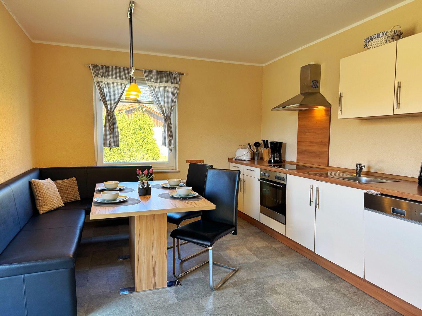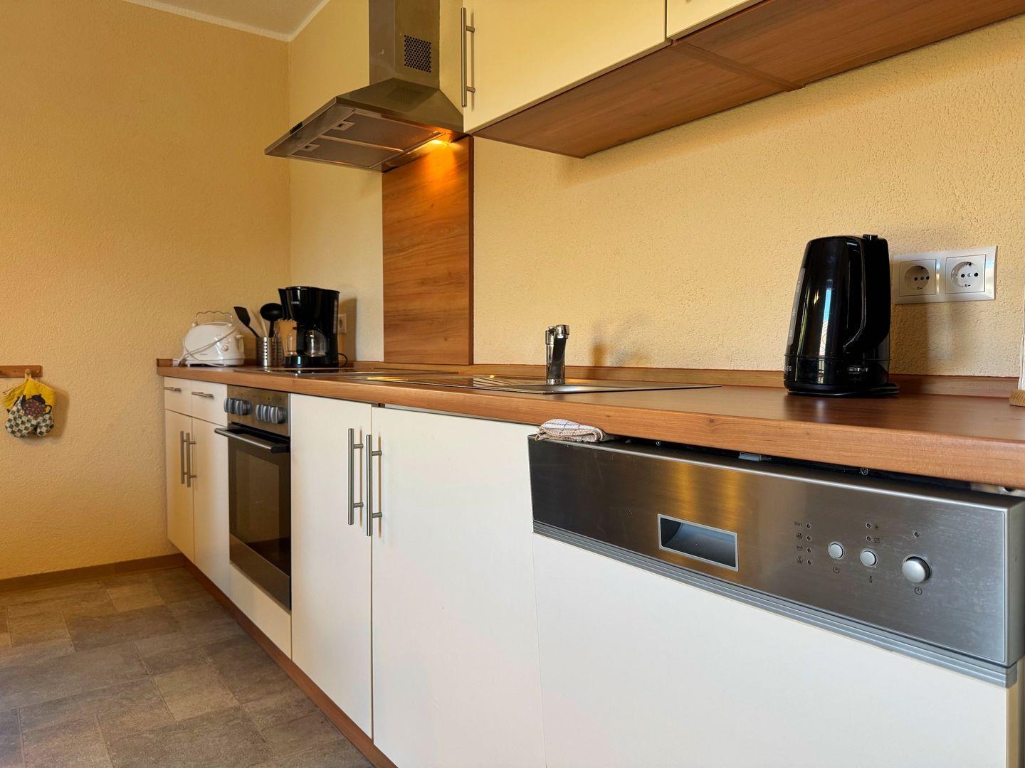 Küchenausstattung: Herd, Backofen, Kühlschrank, Gefrierfach, Spülmaschine, Kaffeemaschine, Toaster, Wasserkocher