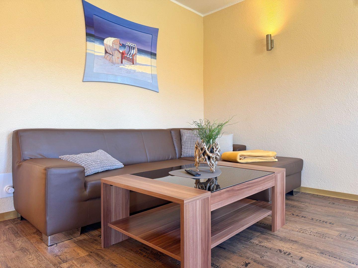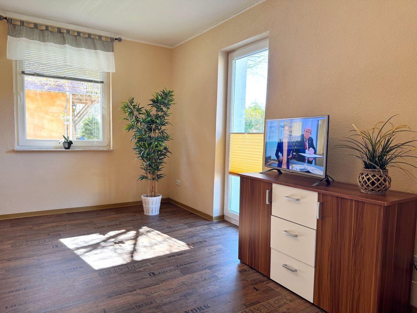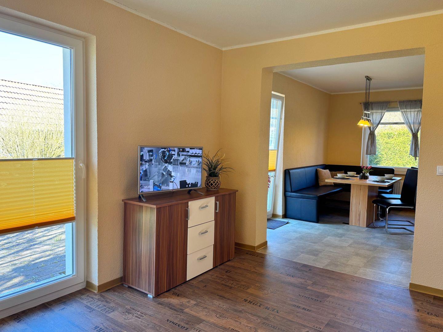 Wohnzimmer mit integrierter Küchenzeile, Esstisch, Couchgarnitur, Flachbild-TV, Radio, WLAN