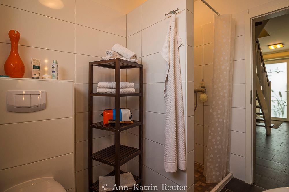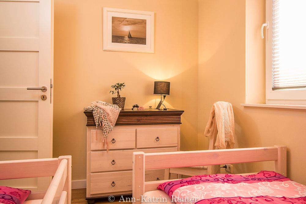 Über einen separaten Eingang gelangen Sie in die untere Ebene der modern eingerichteten Ferienwohnung. Hier finden Sie das Elternschlafzimmer mit Doppelbett, das Kinderschlafzimmer mit 2 Einzelbetten (bzw. mit Doppelstockbetten in den Wohnungen Fischmöwe und Silbermöwe) sowie das Badezimmer mit Dusche und WC.