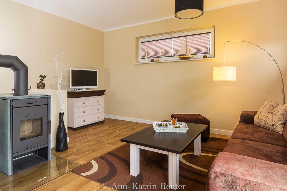Über eine Treppe gelangen Sie in den großen und modern eingerichteten Wohnbereich mit offener Küche. Eine behagliche Sitzecke mit Flachbildfernseher und Kamin lädt zum Verweilen ein. In der komplett ausgestatteten Küchenzeile finden Sie unter anderem einen Ceranherd mit Backofen, eine Geschirrspülmaschine sowie eine Mikrowelle.