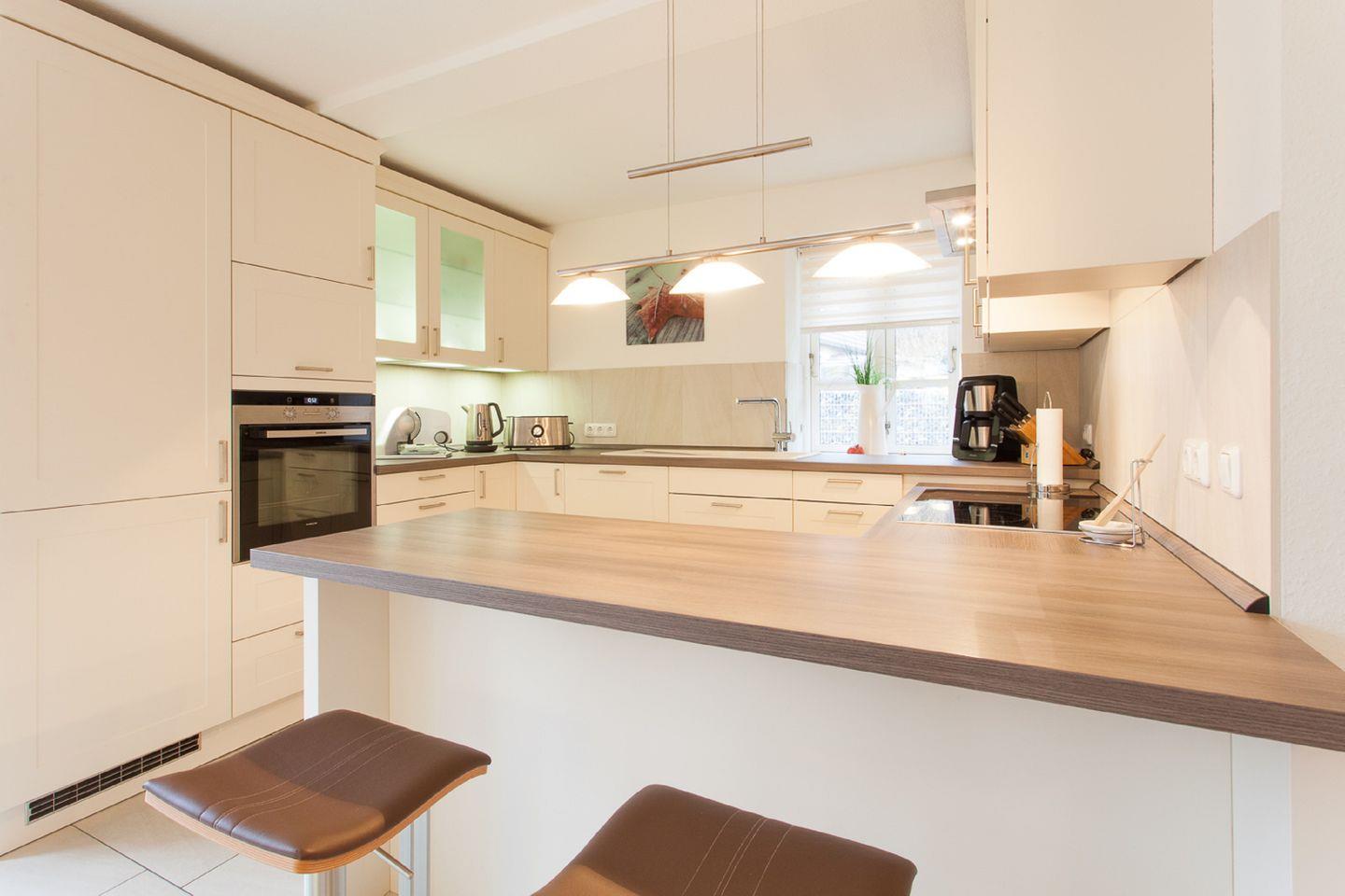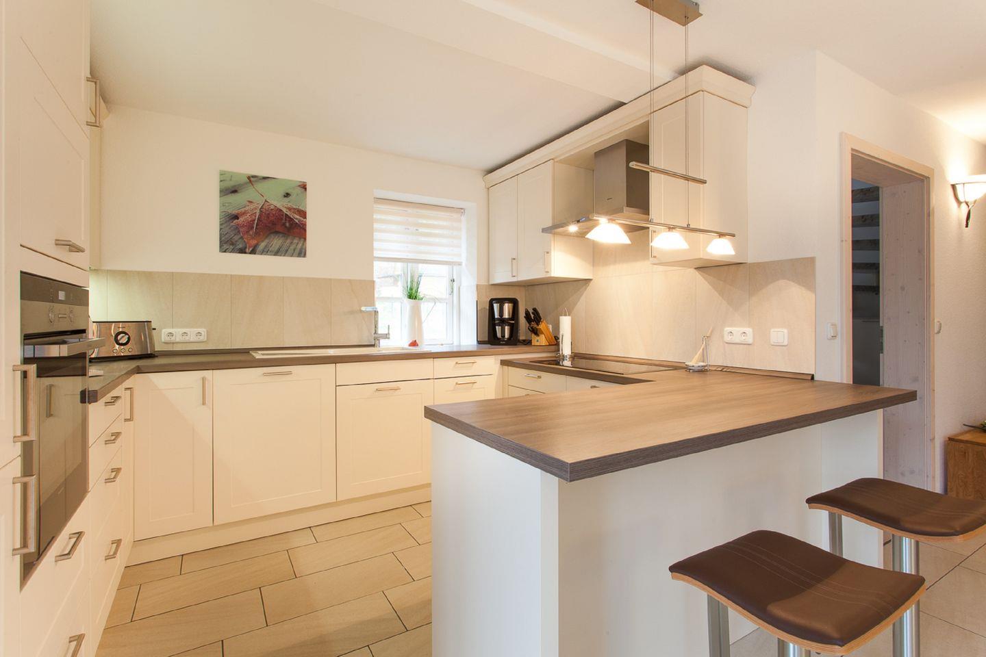 KÜCHE // offene Küche mit Induktionsfeld und Sitztresen, Spülmaschine, Kühlschrank mit Gefrierfach, Backofen, Toaster, Wasserkocher, Kaffeemaschine, reichlich Besteck, Geschirr und Küchenutensilien ++