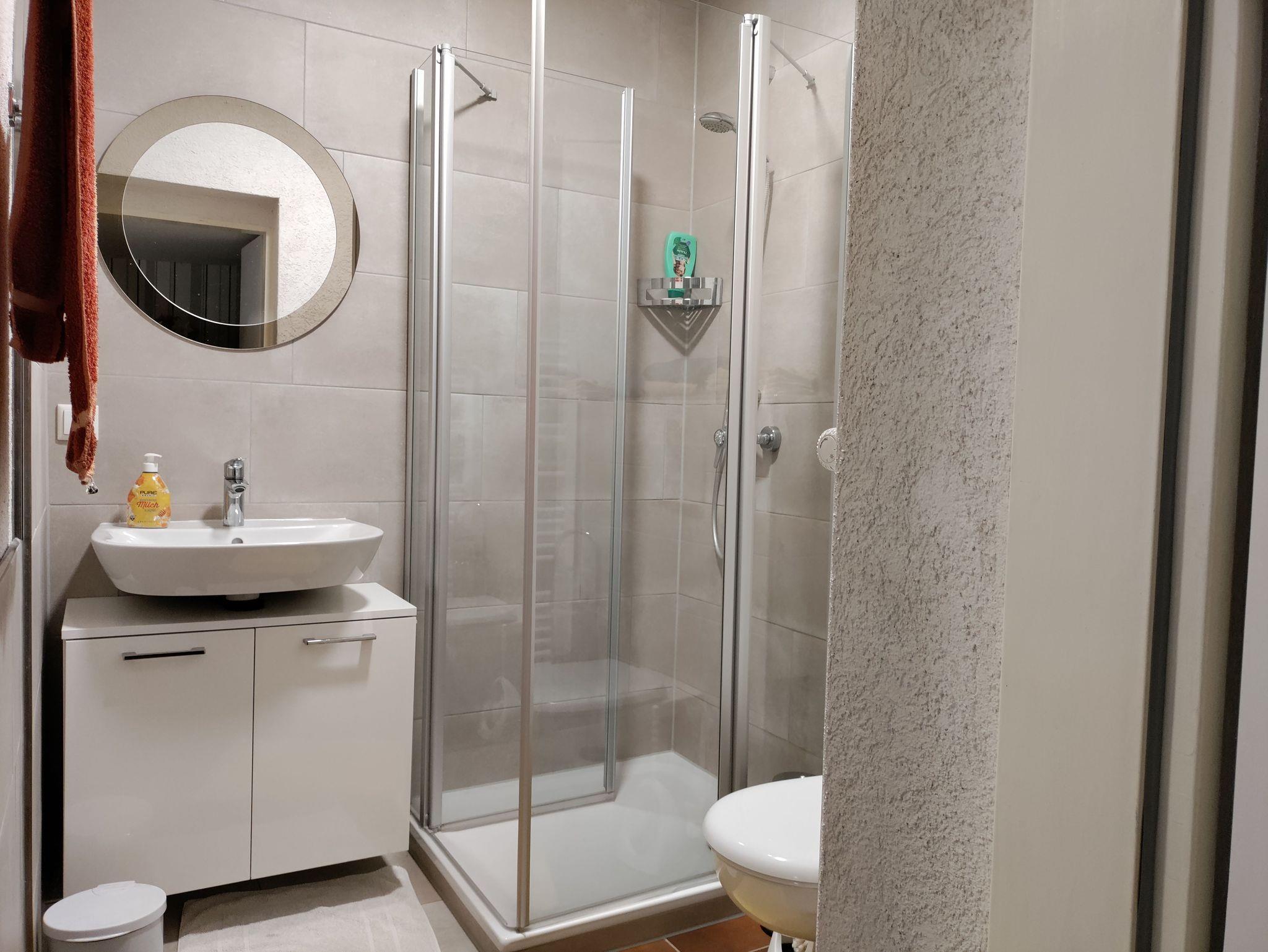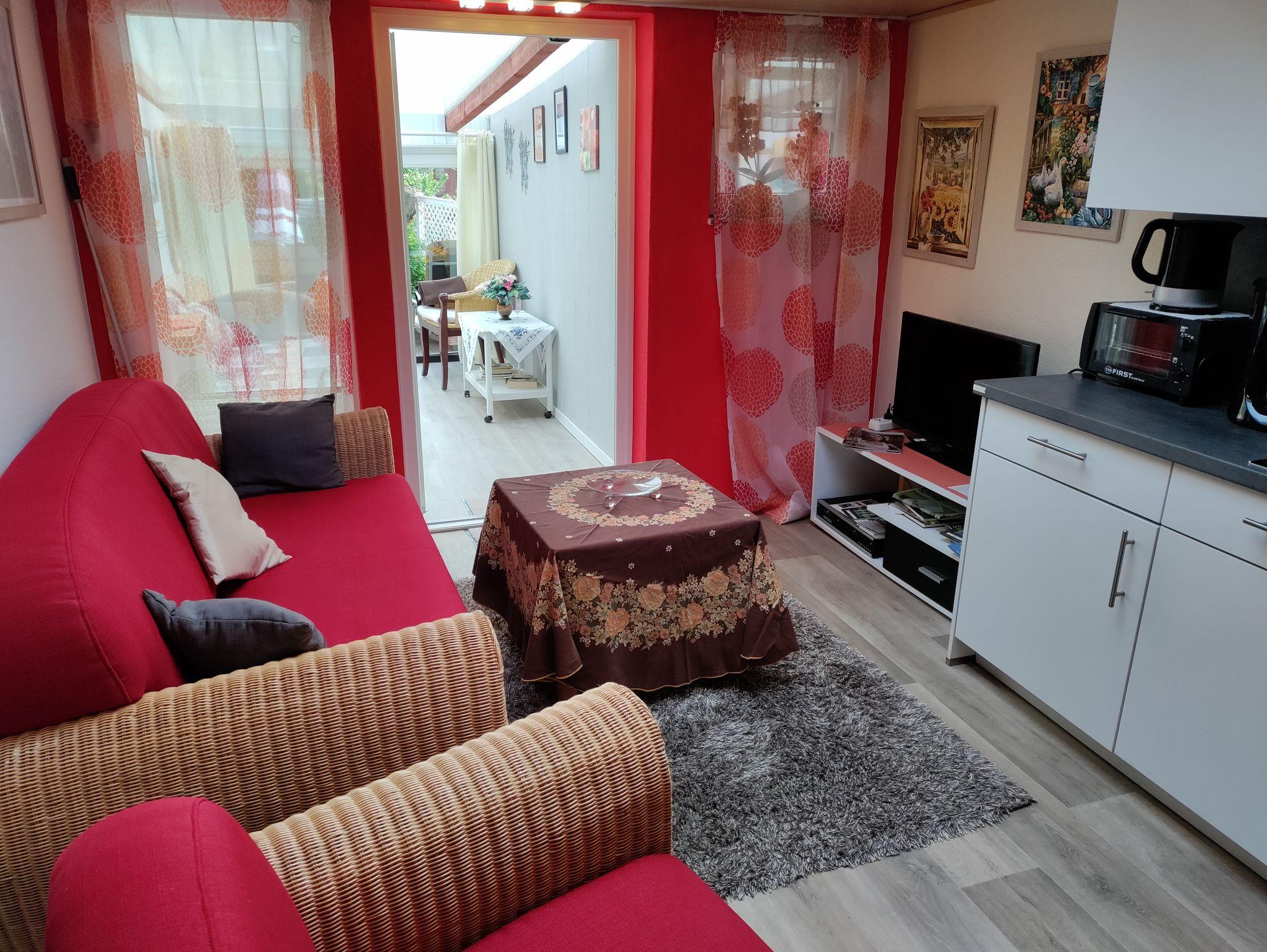 Das Apartment ist ca. 40 qm groß. Über einen Windfang erreicht man den Flur, rechts befindet sich das Duschbad und geradeaus, hinter einem Vorhang steht ein komfortables Einzelbett. Der Wohnraum mit offener Küchenzeile ist mit einem Schlafsofa ausgestattet. Von dort erreicht man den kleinen Wintergarten und dann die Terrasse.