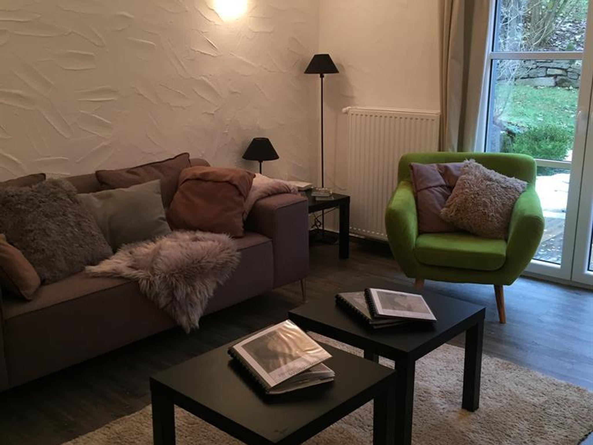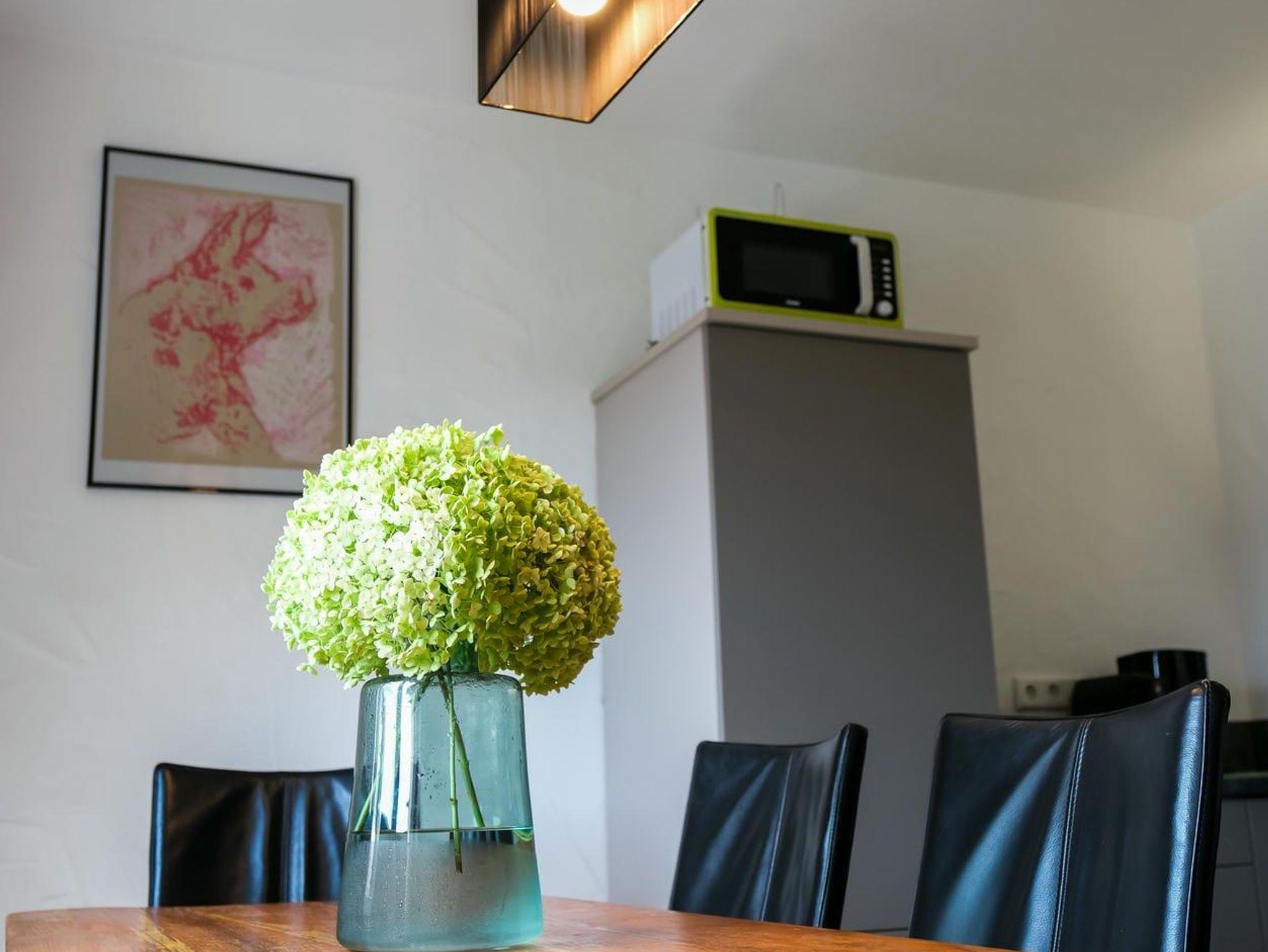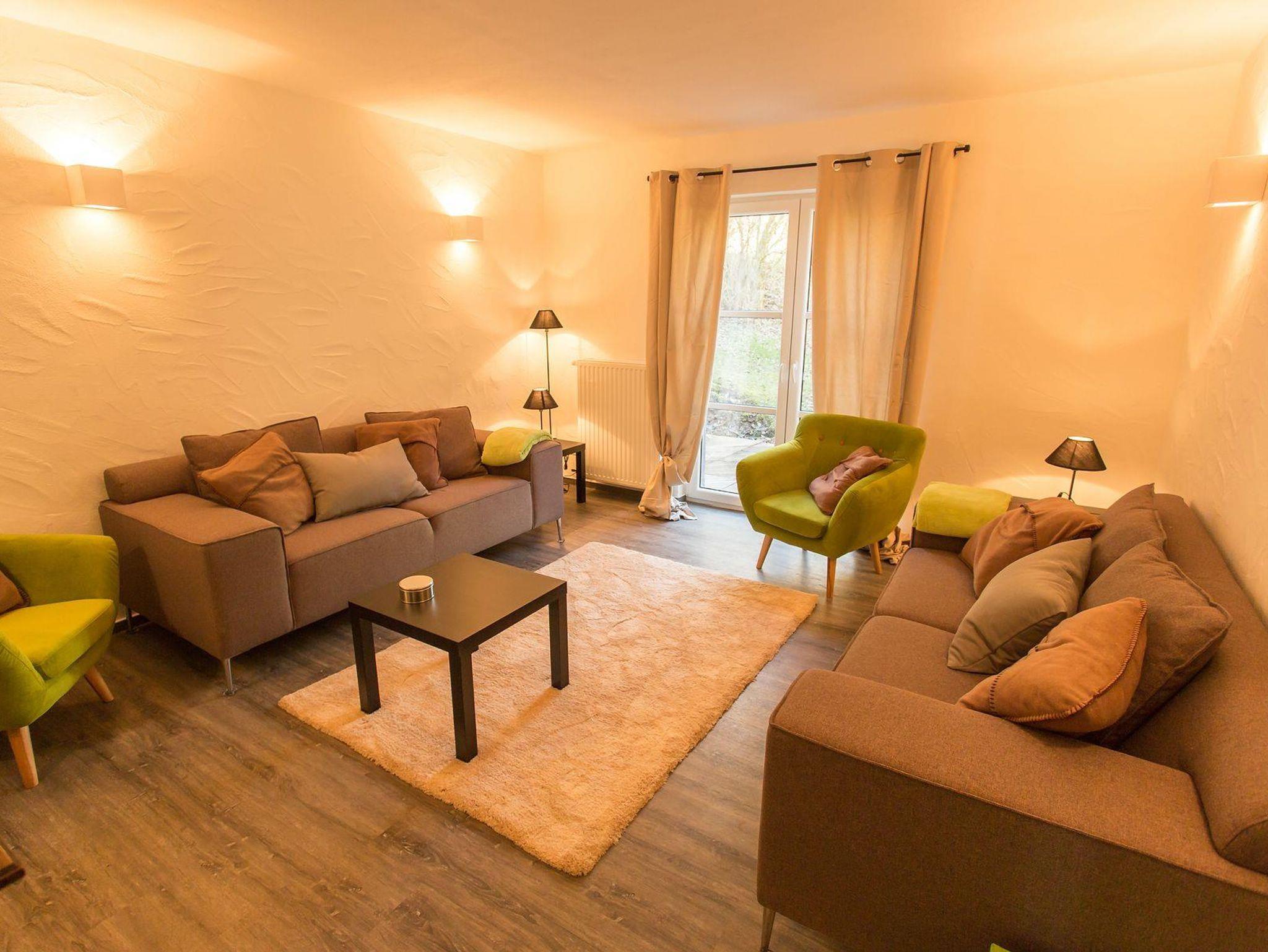 Küche und Esszimmer für bis zu 8 Personen mit: Backofen, Elektroherd, Kühlschrank, Spülmaschine, Wasserkocher, Pad-Kaffeemaschine und Mikrowelle. Wohnzimmer mit gemütlicher Sitzecke, Gartenausgang zur Terrasse.
