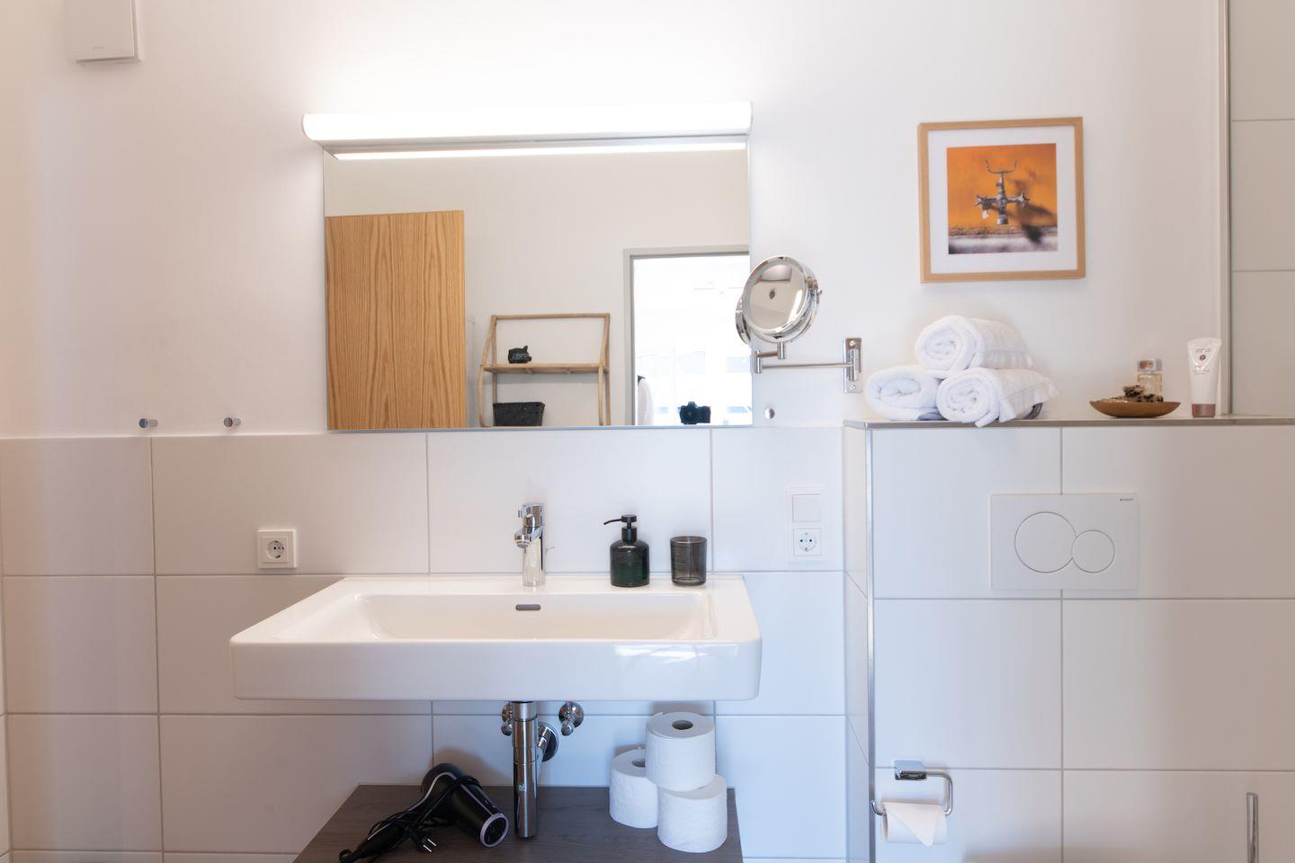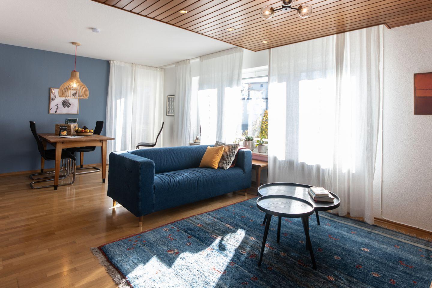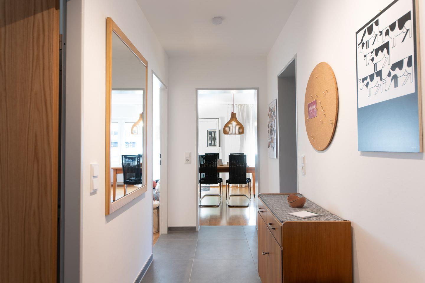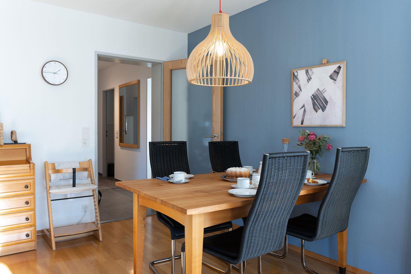 Beim Betreten der Ferienwohnung werden Sie von einem freundlichen und lichtdurchfluteten Ambiente begrüßt. Die Verwendung von Holz in der Möblierung vermittelt eine natürliche und gemütliche Atmosphäre. Die geschmackvolle Einrichtung zieht sich durch alle Räume der Ferienwohnung und schafft ein harmonisches Gesamtbild.