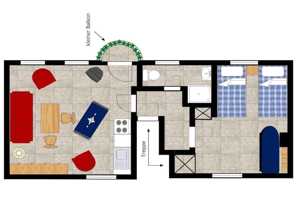 Die Wohnung befindet sich im 2. OG eines Altstadthauses aus dem 18. Jahrhundert. Sie ist komplett möbliert und besteht aus Wohnzimmer, Schlafzimmer sowie Bad mit Dusche und WC. Zur Ausstattung gehört u.a. ein Doppelbett, eine Sitzecke und eine Küchenzeile. Letztere verfügt über ein reichhaltiges Geschirrsortiment, außerdem Herd, Backofen, Kühlschrank, Kaffeemaschine und diverse Kochutensilien TV und kostenloses WLAN sind ebenfalls vorhanden. Die Ausstattung umfasst somit alles Nötige, um sich selbst zu versorgen. Durch die Lage direkt auf der Insel sind es von hier aus nur wenige Minuten, um die Lindauer Sehenswürdigkeiten zu erreichen.