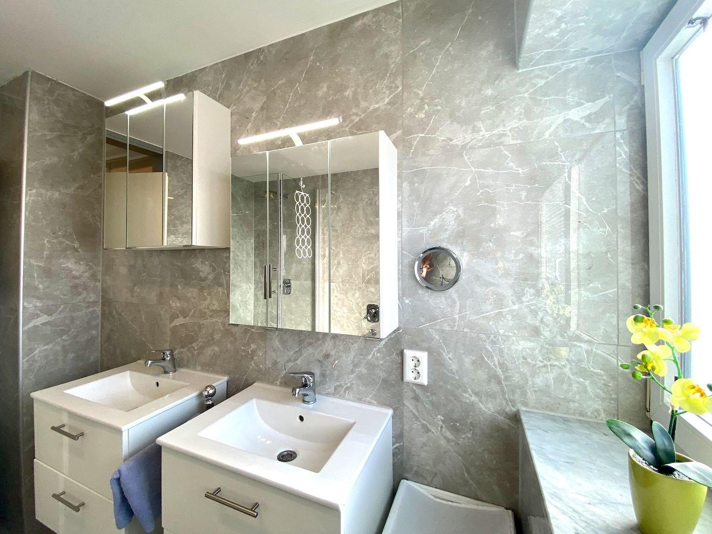 Das exklusive Marmor-Bad mit Badewanne und separater Dusche bedient auch hohe Ansprüche. Ein separates WC befindet sich nebenan. Die gesamte Unterkunft ist mit Fußbodenheizung ausgestattet.