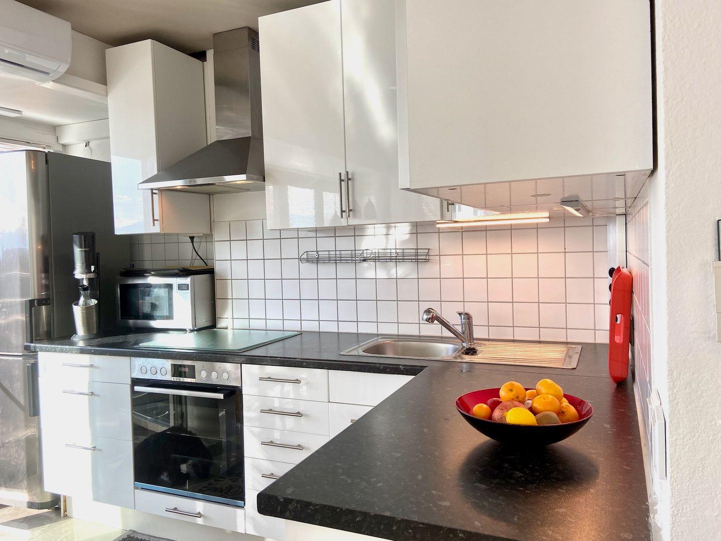 Die Wohnung verfügt über einen großzügigen Wohn-Essbereich im Obergeschoss der Wohnung und hat direkten Zugang zum sonnigen Balkon. Die sehr gut ausgestattete Küche bietet Ihnen neben Ceran-Kochfeld, Spülmaschine, Kühl-/Gefrierkombination und Mikrowelle auch ein Soda-Stream-Gerät für frisches kohlensäurehaltiges Wasser. Ebenso steht Ihnen bei Bedarf ein Klimagerät im das Obergeschoss zur Verfügung.