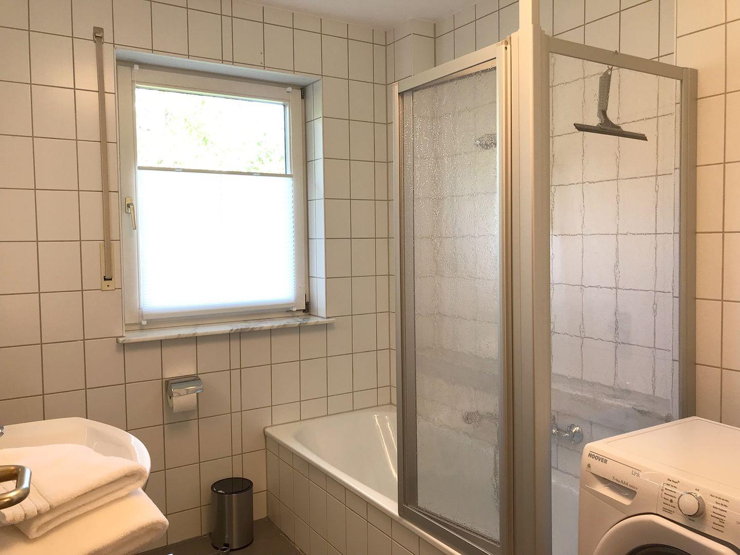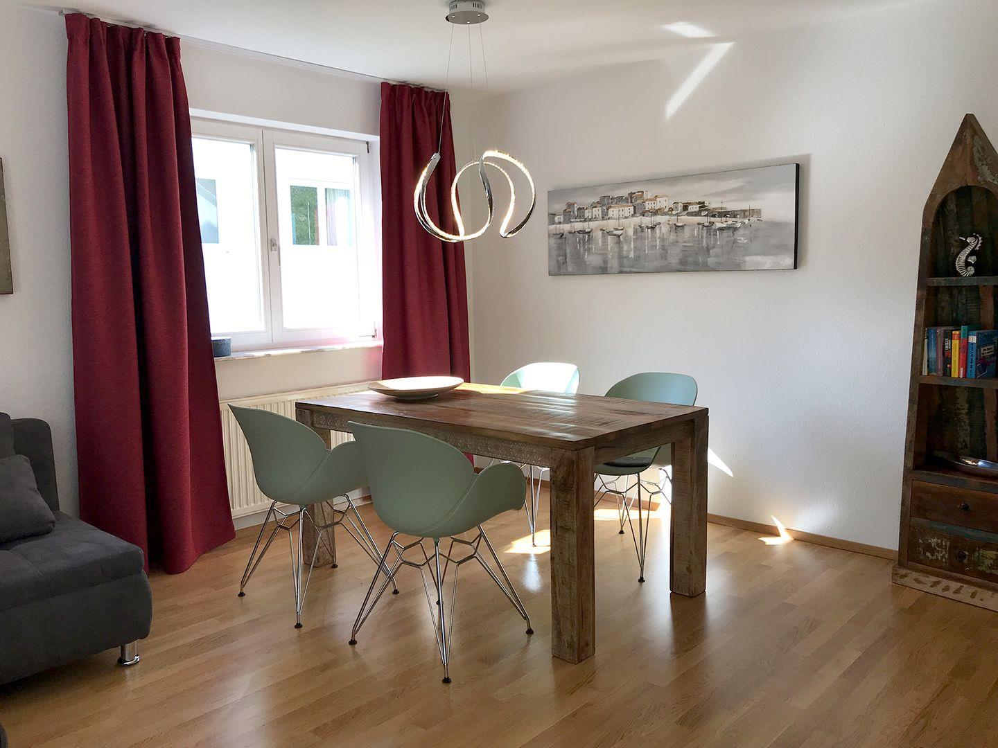 Vom Wohn- und Esszimmer mit Essplatz für 4 Personen und Schlafcouch geht es direkt auf den großen Süd-Balkon. Als Bodenbeläge wurden Parkett und Fliesen gewählt, daher ist die Wohnung Allergiker freundlich. WLAN und Waschtrockner werden kostenfrei angeboten.