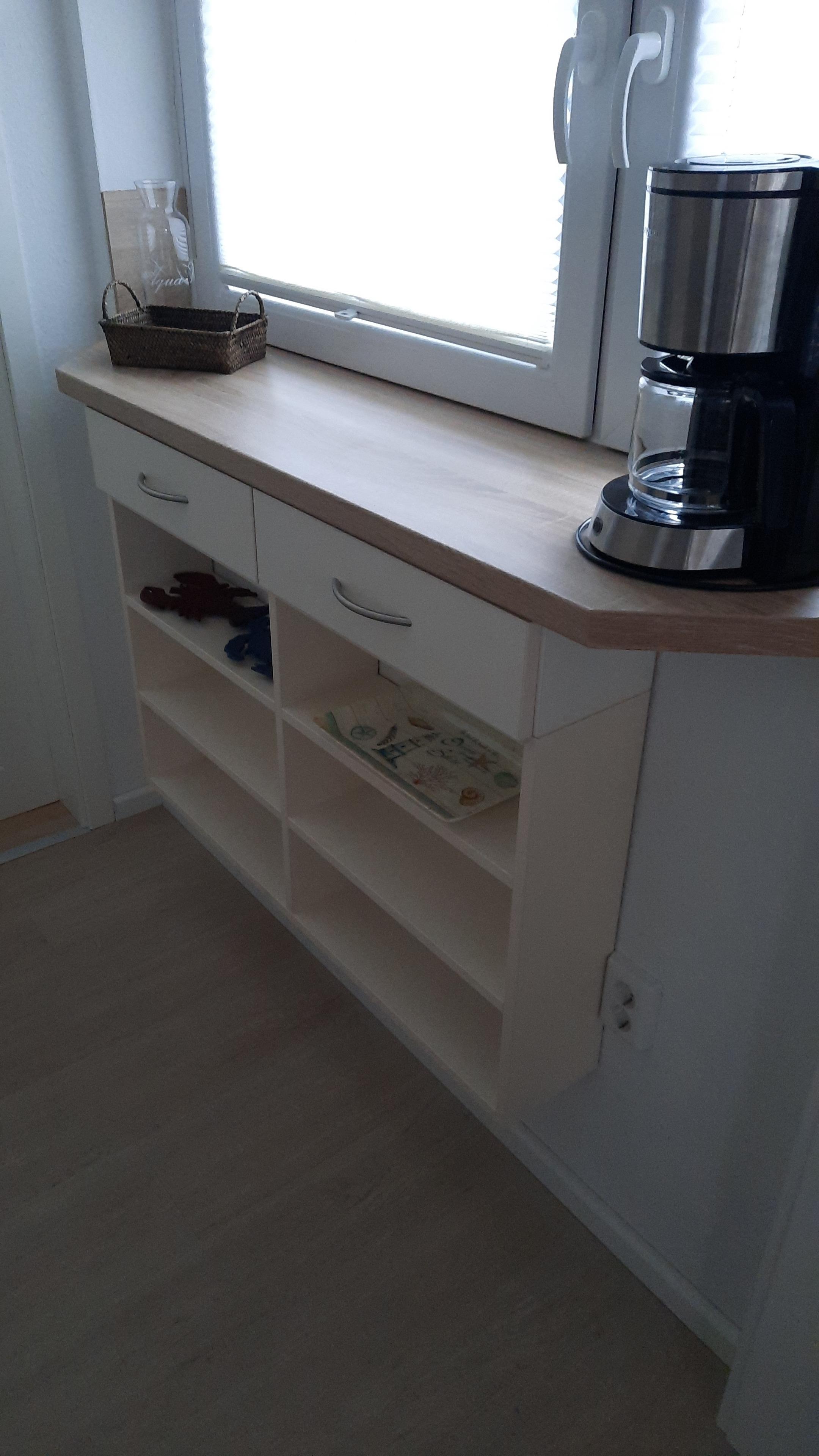 Pantryküche: voll ausgestattet mit Kaffeemaschine, Wasserkocher, Toaster, Eierkocher, Backofen mit Cerankochfeld, Kühlschrank mit kleinem Kühlfach, Töpfe, Geschirr, Besteck usw.
