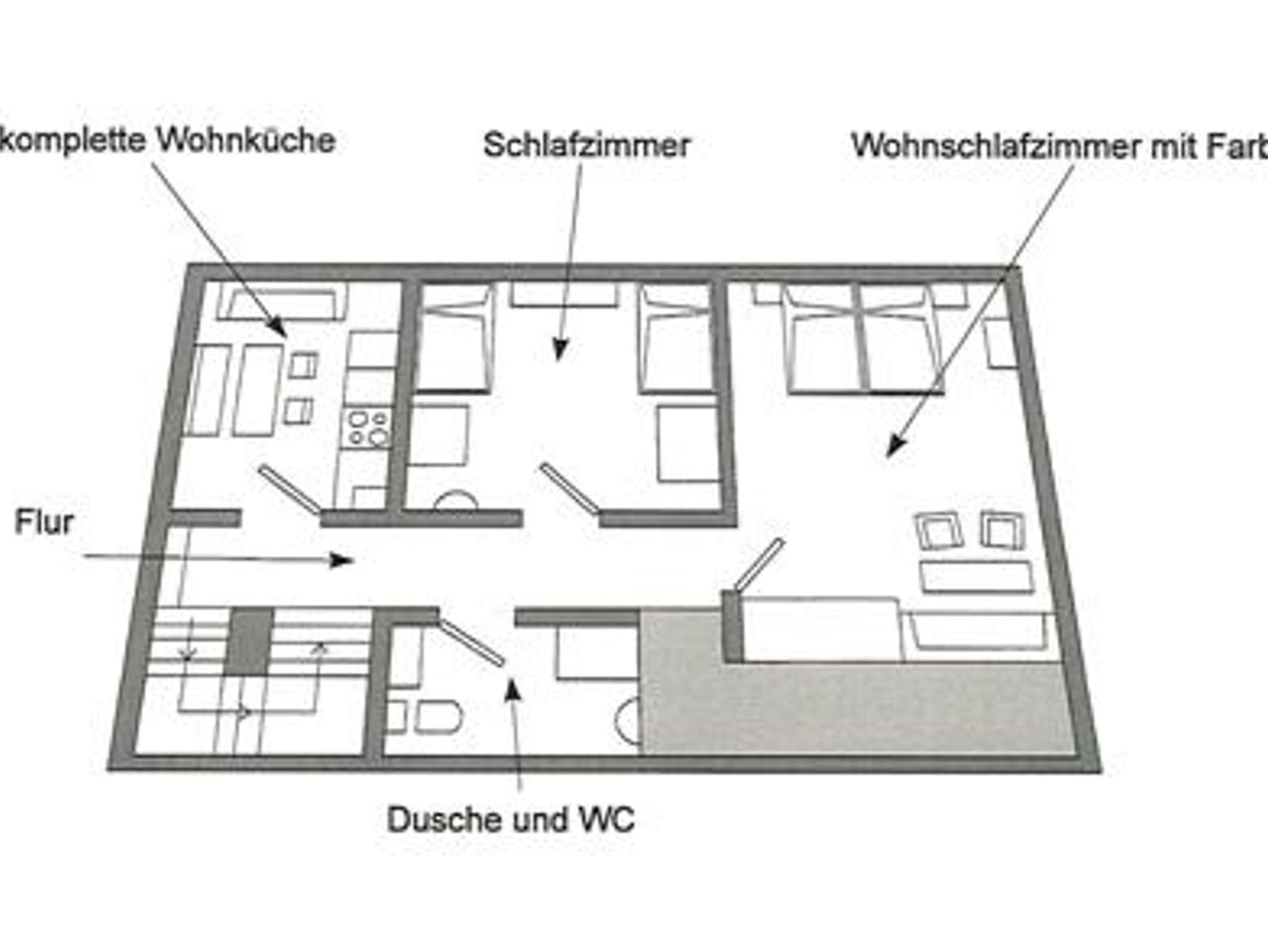 Die Ferienwohnung befindet sich im Dachgeschoss und ist bestens geeignet für bis zu 4 Personen. Im Wohn-Schlafraum befinden sich 1 Doppelbett (2 x 2 m) und 1 gemütliche Sitzecke. Im zweiten Schlafraum stehen 2 Einzelbetten und ein Waschbecken zur Verfügung. Die separate Küche ist voll ausgestattet mit Geschirrspülmaschine, Backofen, Mikrowelle, Kaffeemaschine, Wasserkocher und einer Essecke. Das Badezimmer mit Dusche und WC rundet das Gesamtbild ab.