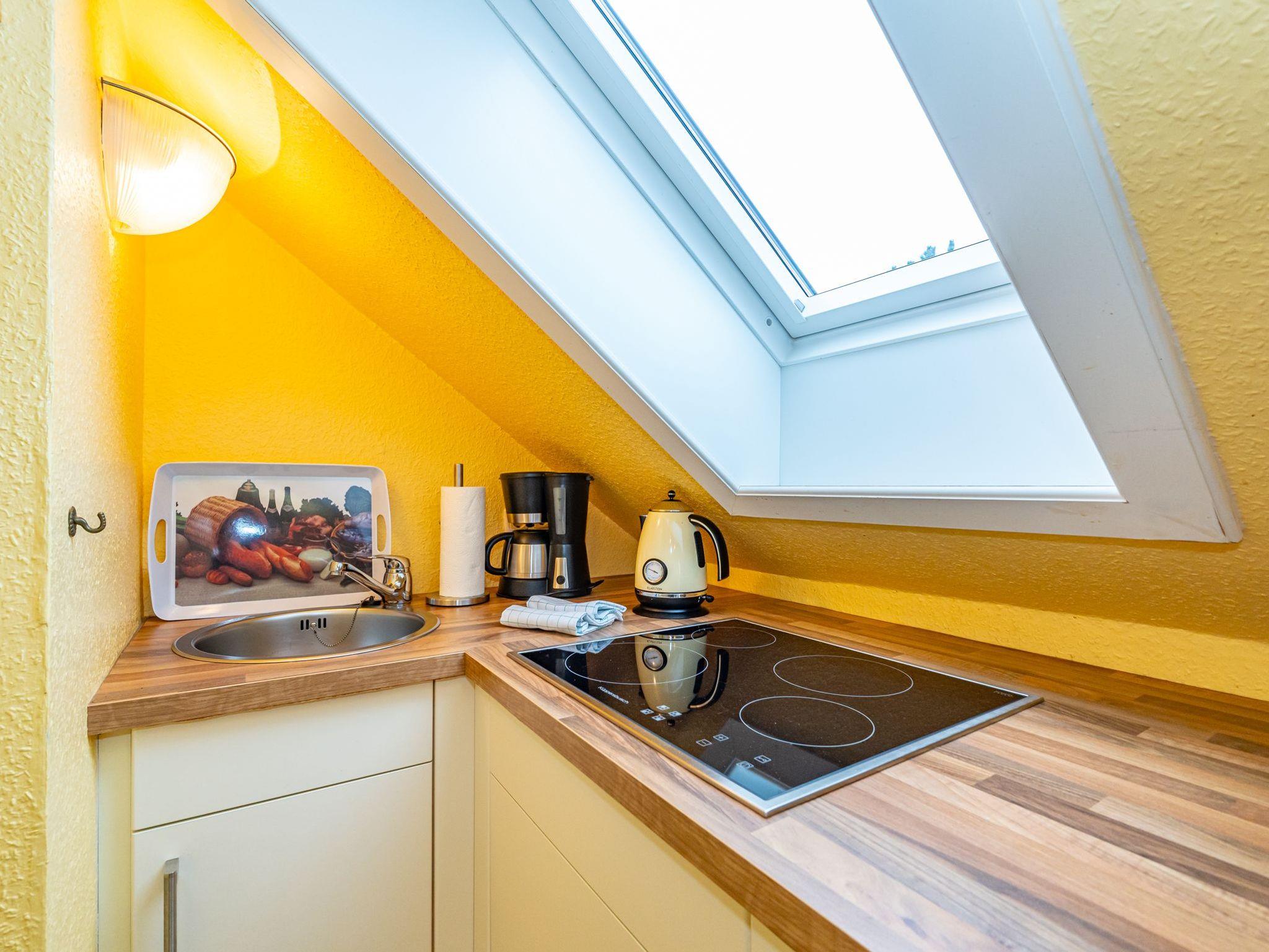 Im Giebel des 2. Obergeschosses liegt das achte Apartment. Die in edlen Cremetönen eingerichteten 30 Quadratmeter bieten Platz für 2 Personen. Der offen gestaltete Wohn- und Essbereich verfügt über 2 Einzelbetten und Sitzmöglichkeiten. Das Bad ist ausgestattet mit Dusche, WC und Waschbecken.