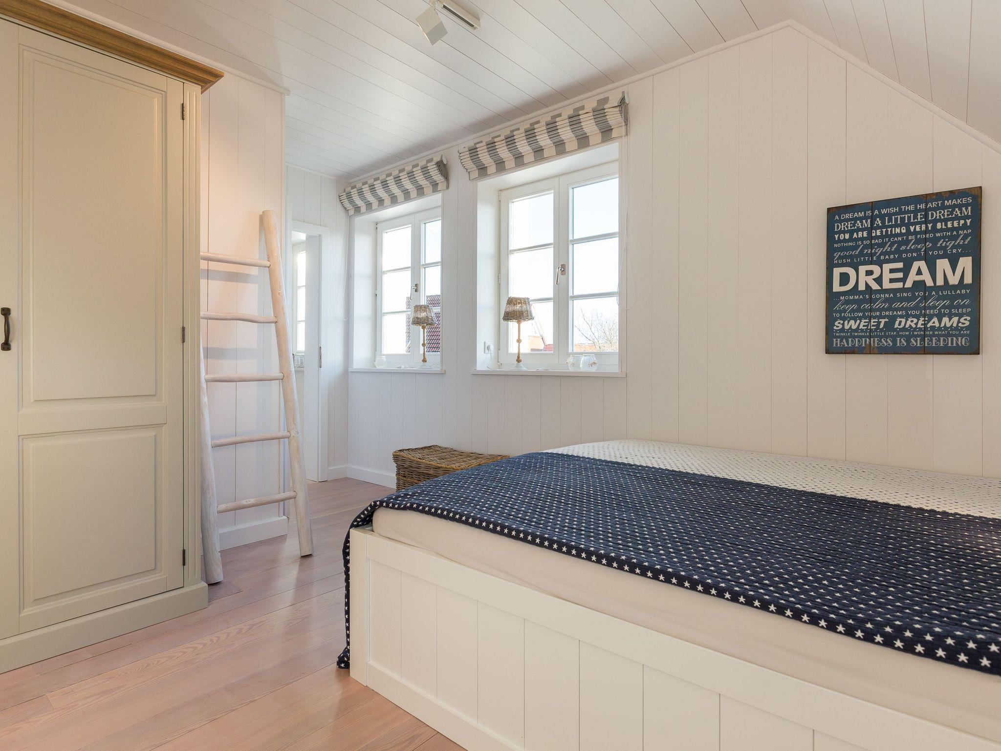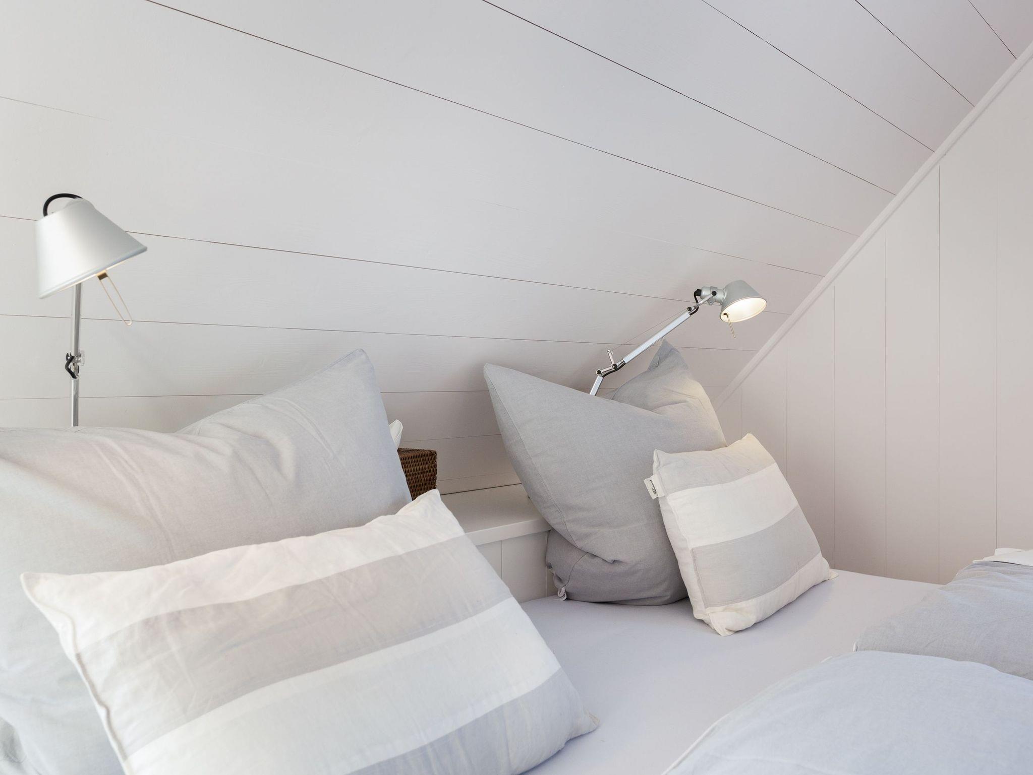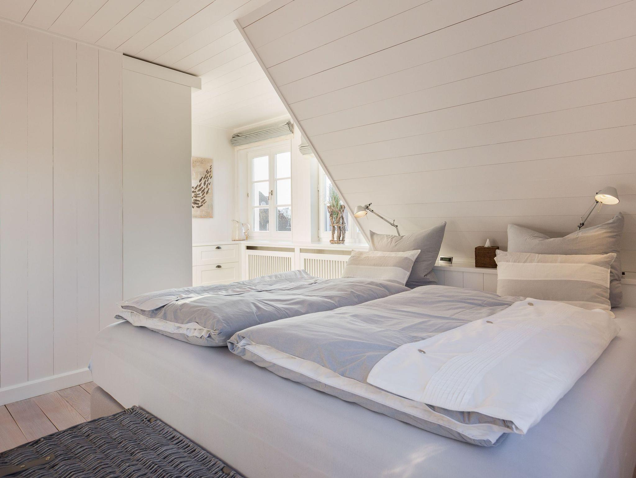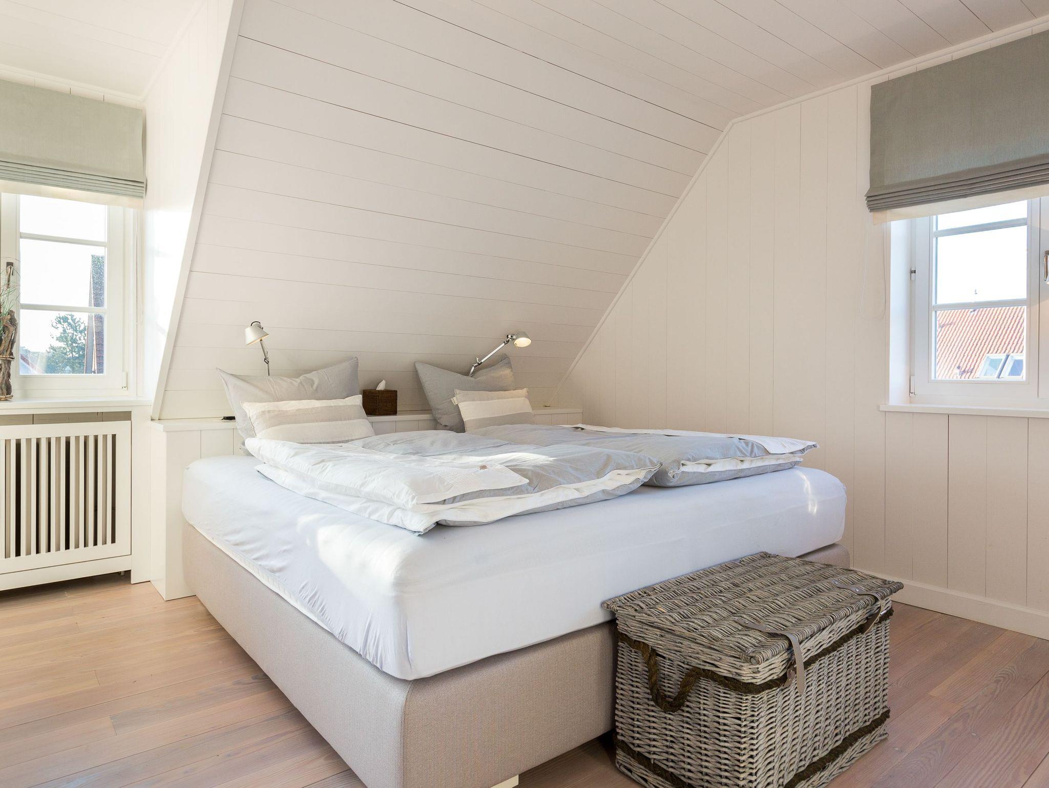 Das Obergeschoss bietet eine edle Optik mit weißer Holzvertäfelung. Oben befindet sich ein großes, helles Badezimmer mit Badewanne und geräumiger Duschkabine, zwei Waschbecken und WC. Im ersten Schlafzimmer findet sich ein 2 x 2 Meter großes Boxspringbett. Das zweite Schlafzimmer hat ein 1,60 x 2,00 Meter großes Doppelbett, einen kleinen Schreibtisch und ein eigenes Duschbad mit WC und separatem Waschraum mit Waschmaschine. Das dritte Schlafzimmer verfügt über ein ausziehbares Bett für ein bis zwei Personen, einen Schreibtisch und einen Fernseher. Alle Schlafzimmer sind mit Einbauschränken ausgestattet und bieten einen traumhaften Blick auf Meer und Natur.
