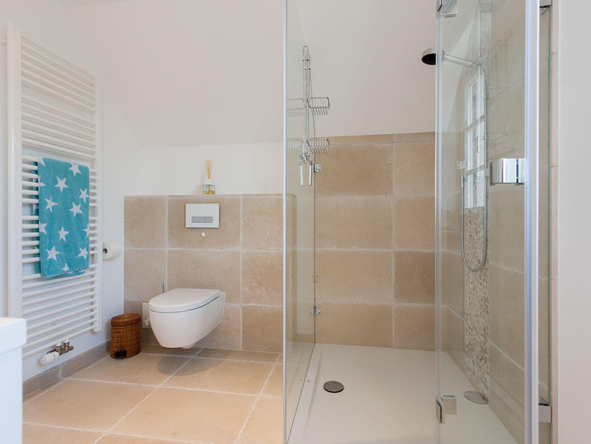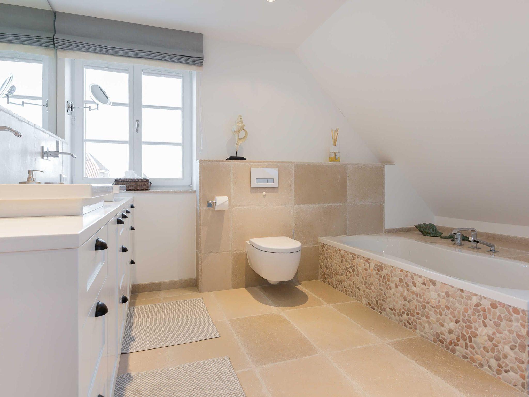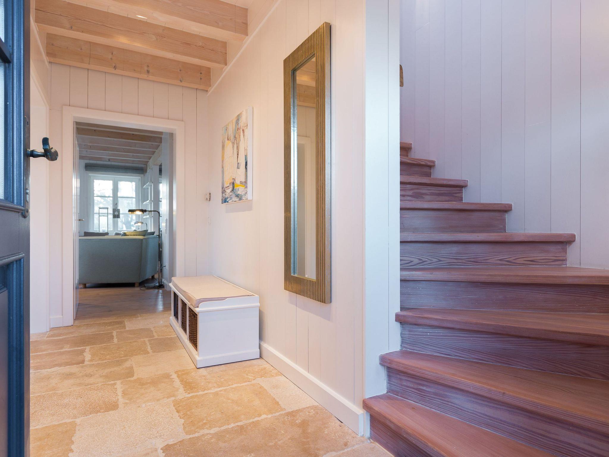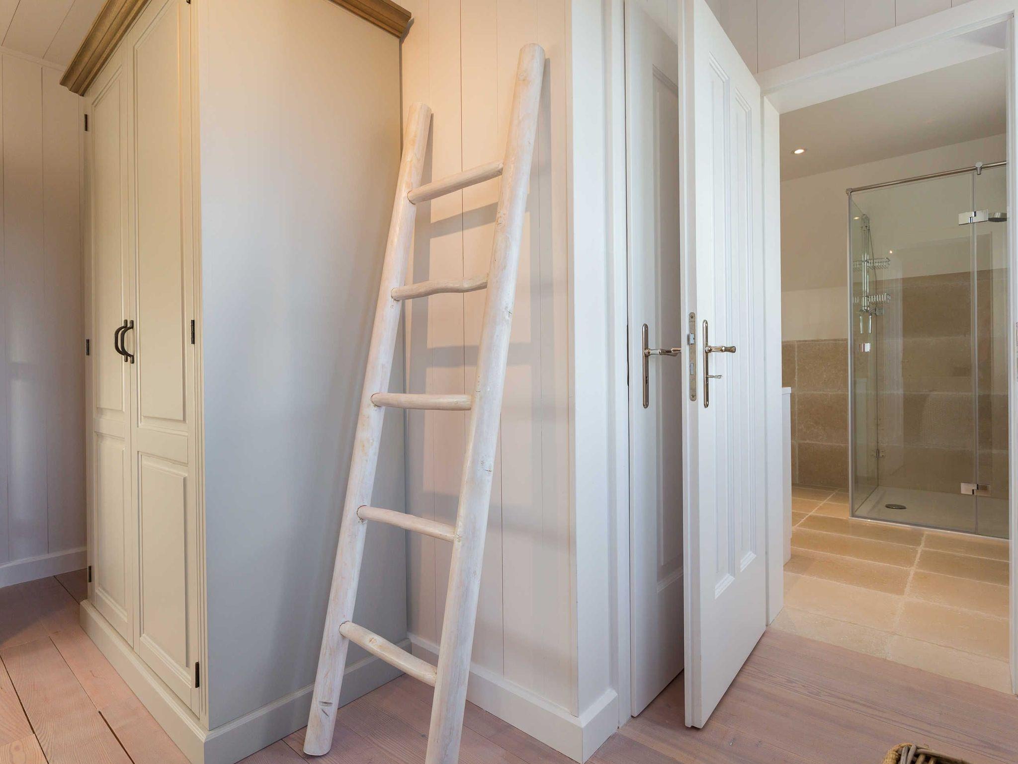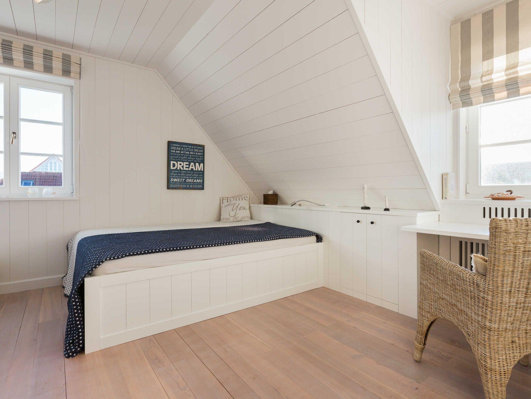 Das Obergeschoss bietet eine edle Optik mit weißer Holzvertäfelung. Oben befindet sich ein großes, helles Badezimmer mit Badewanne und geräumiger Duschkabine, zwei Waschbecken und WC. Im ersten Schlafzimmer findet sich ein 2 x 2 Meter großes Boxspringbett. Das zweite Schlafzimmer hat ein 1,60 x 2,00 Meter großes Doppelbett, einen kleinen Schreibtisch und ein eigenes Duschbad mit WC und separatem Waschraum mit Waschmaschine. Das dritte Schlafzimmer verfügt über ein ausziehbares Bett für ein bis zwei Personen, einen Schreibtisch und einen Fernseher. Alle Schlafzimmer sind mit Einbauschränken ausgestattet und bieten einen traumhaften Blick auf Meer und Natur.