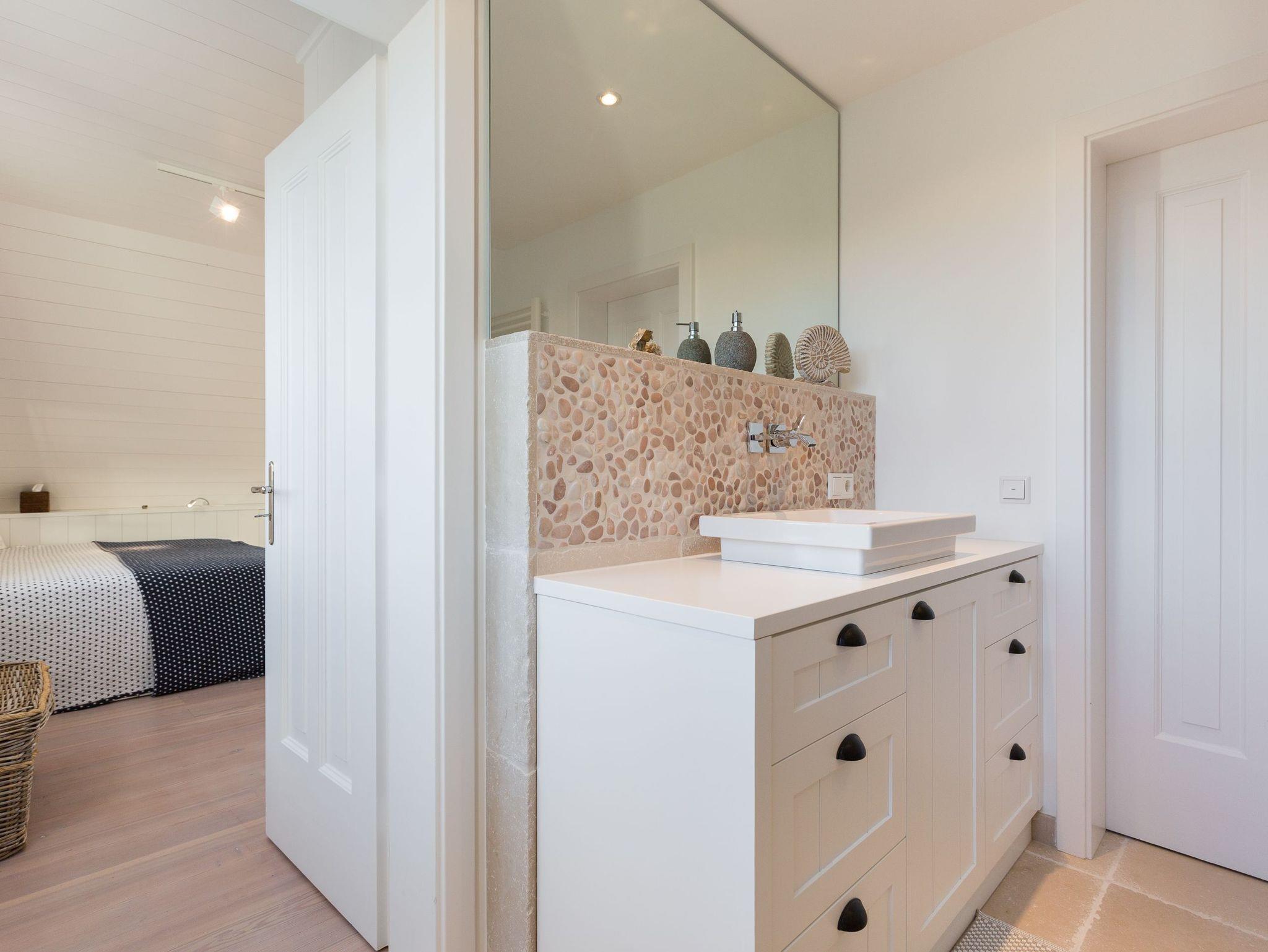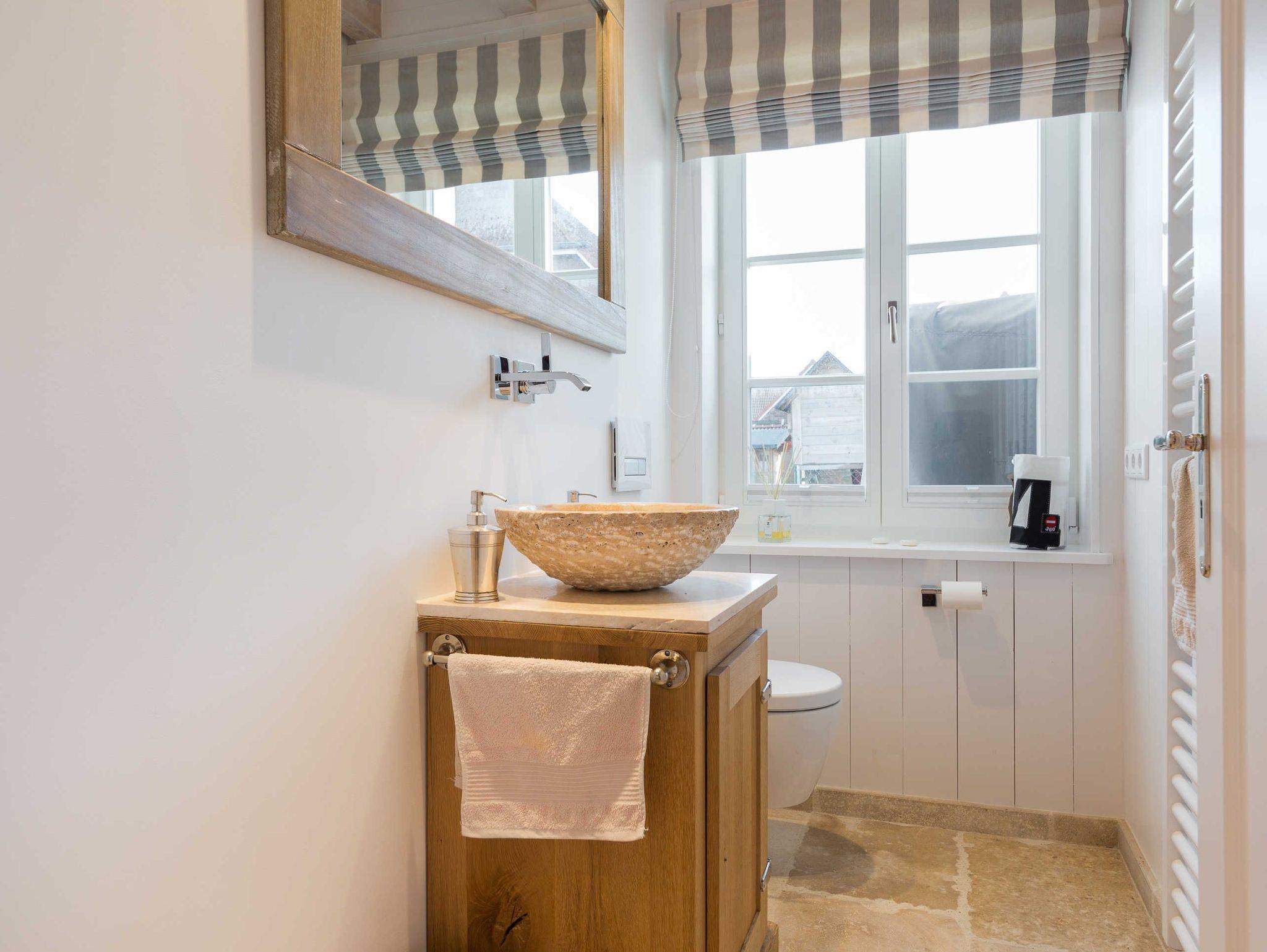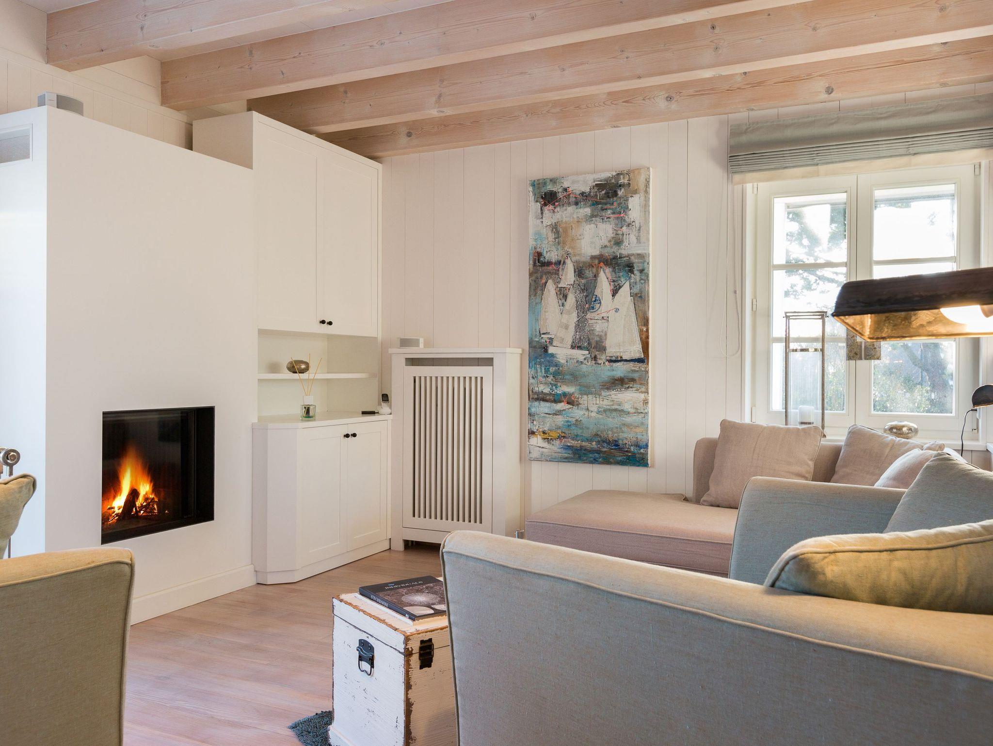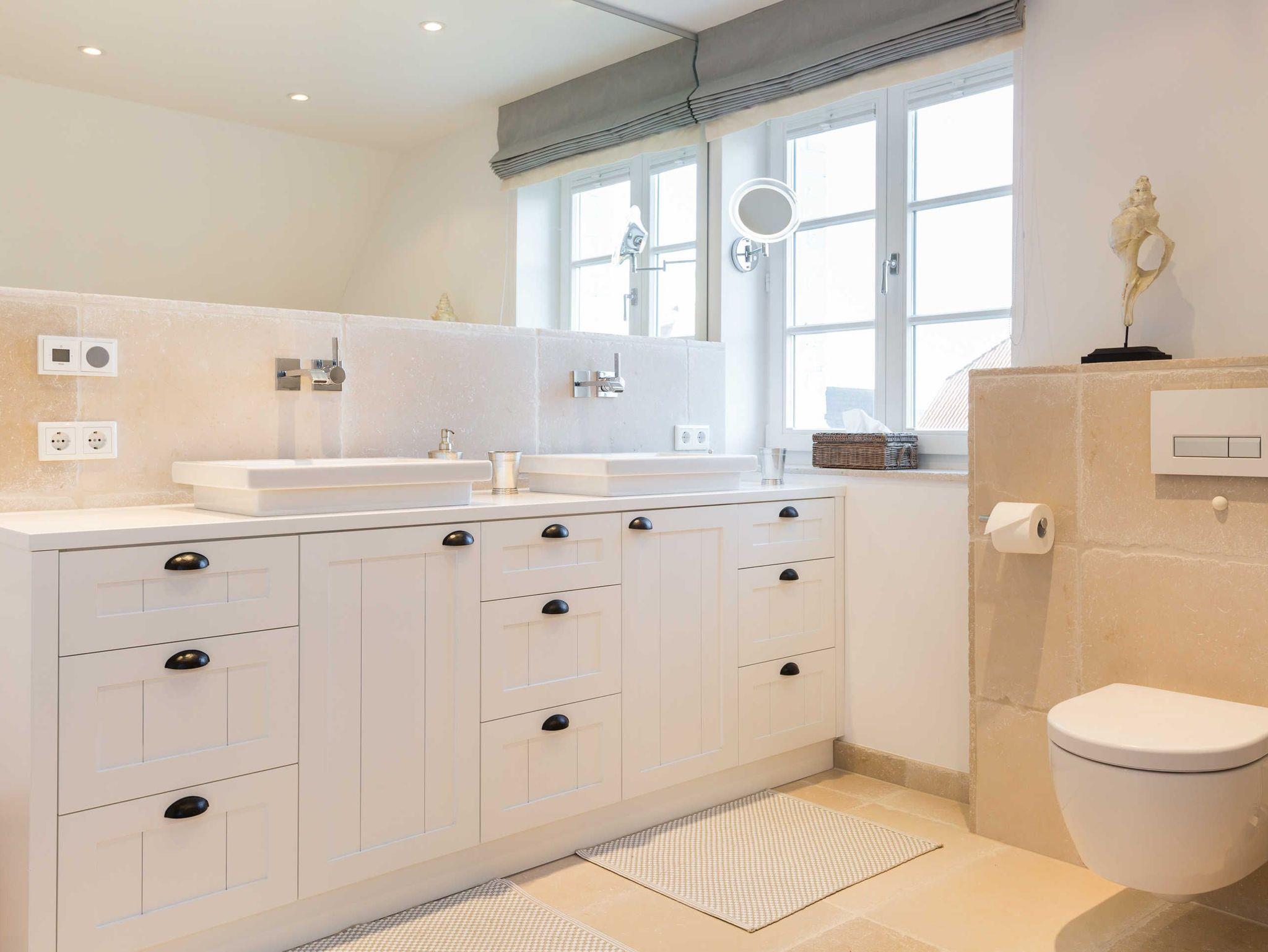 Das Obergeschoss bietet eine edle Optik mit weißer Holzvertäfelung. Oben befindet sich ein großes, helles Badezimmer mit Badewanne und geräumiger Duschkabine, zwei Waschbecken und WC. Im ersten Schlafzimmer findet sich ein 2 x 2 Meter großes Boxspringbett. Das zweite Schlafzimmer hat ein 1,60 x 2,00 Meter großes Doppelbett, einen kleinen Schreibtisch und ein eigenes Duschbad mit WC und separatem Waschraum mit Waschmaschine. Das dritte Schlafzimmer verfügt über ein ausziehbares Bett für ein bis zwei Personen, einen Schreibtisch und einen Fernseher. Alle Schlafzimmer sind mit Einbauschränken ausgestattet und bieten einen traumhaften Blick auf Meer und Natur.