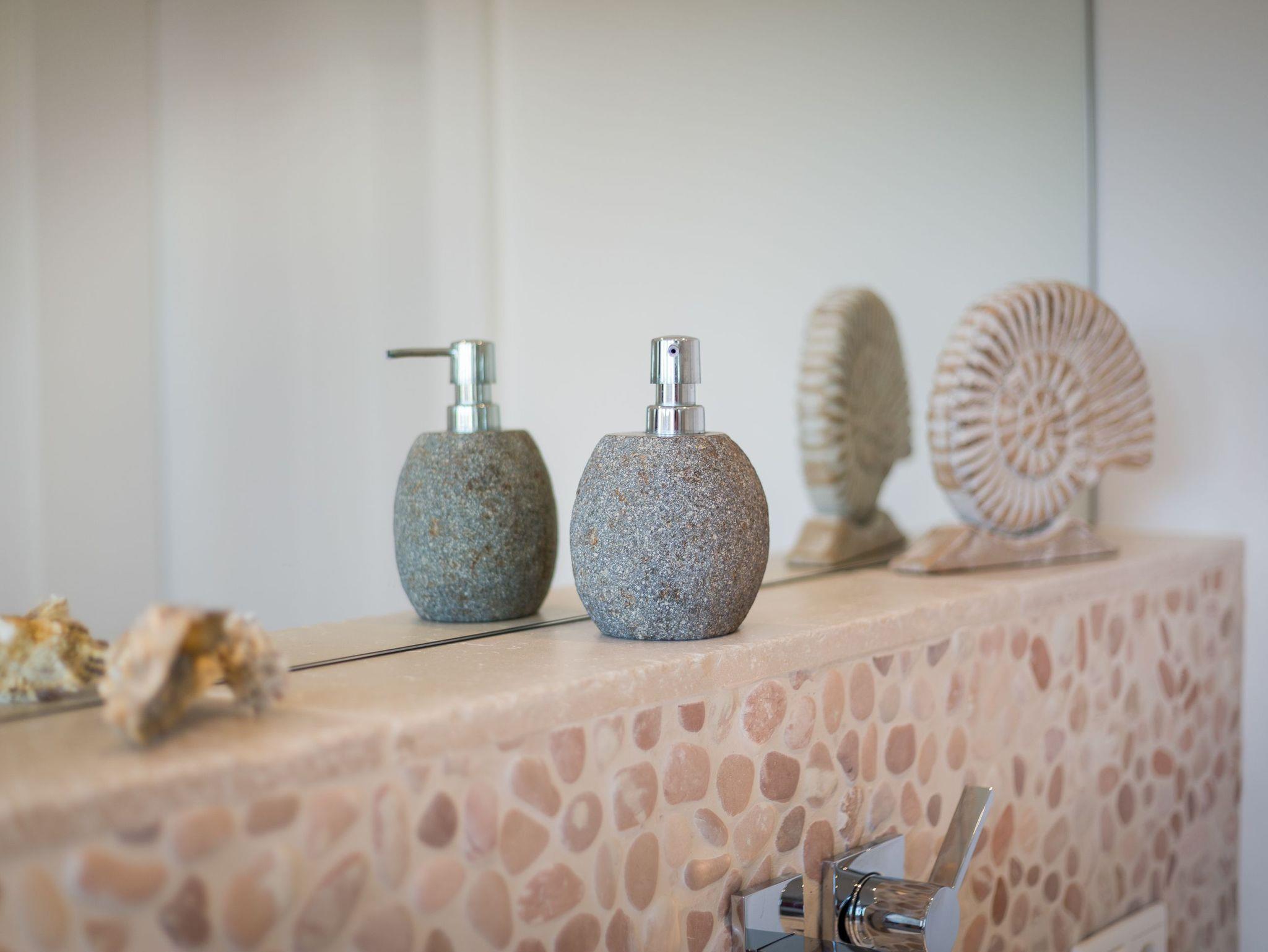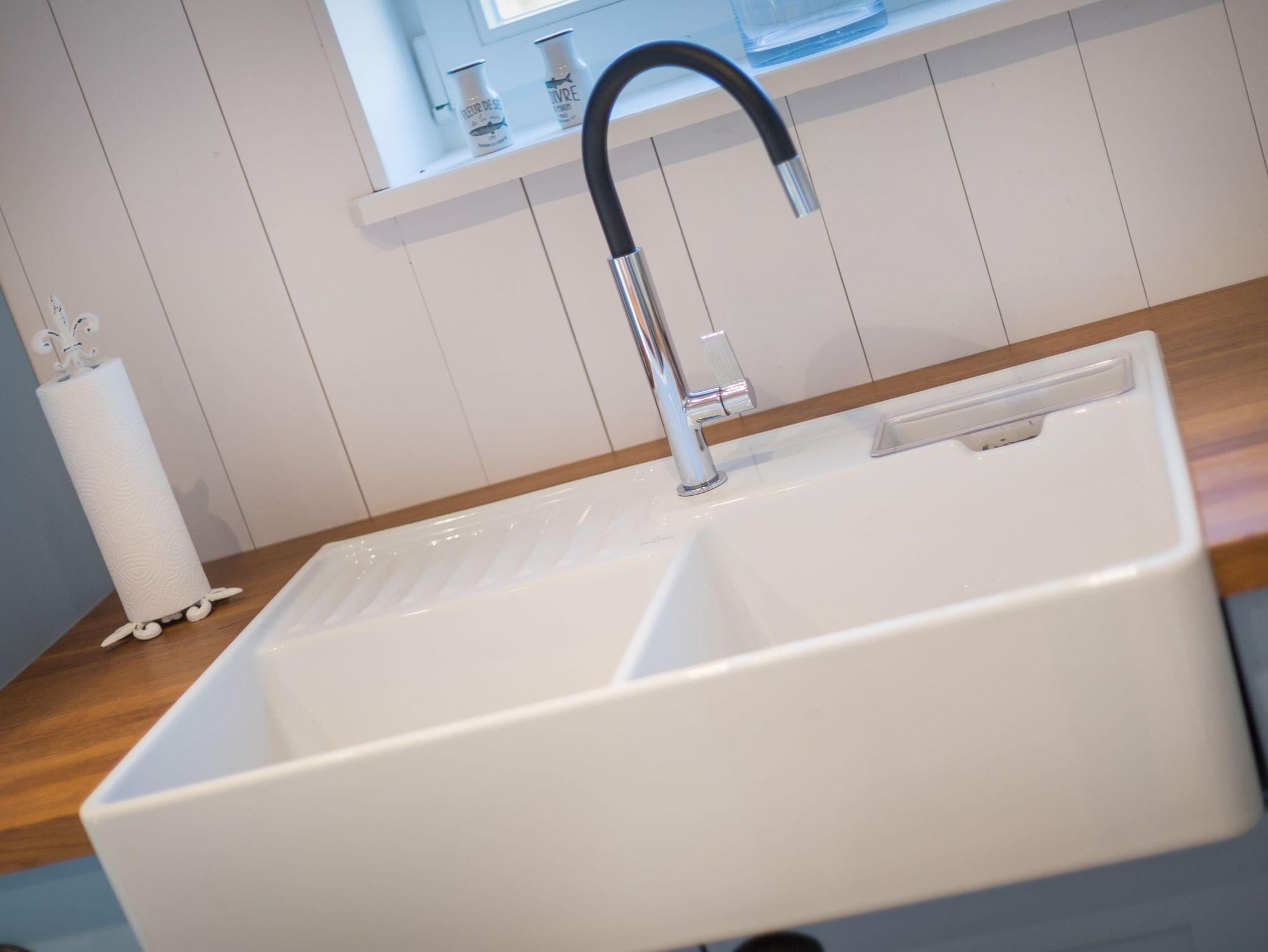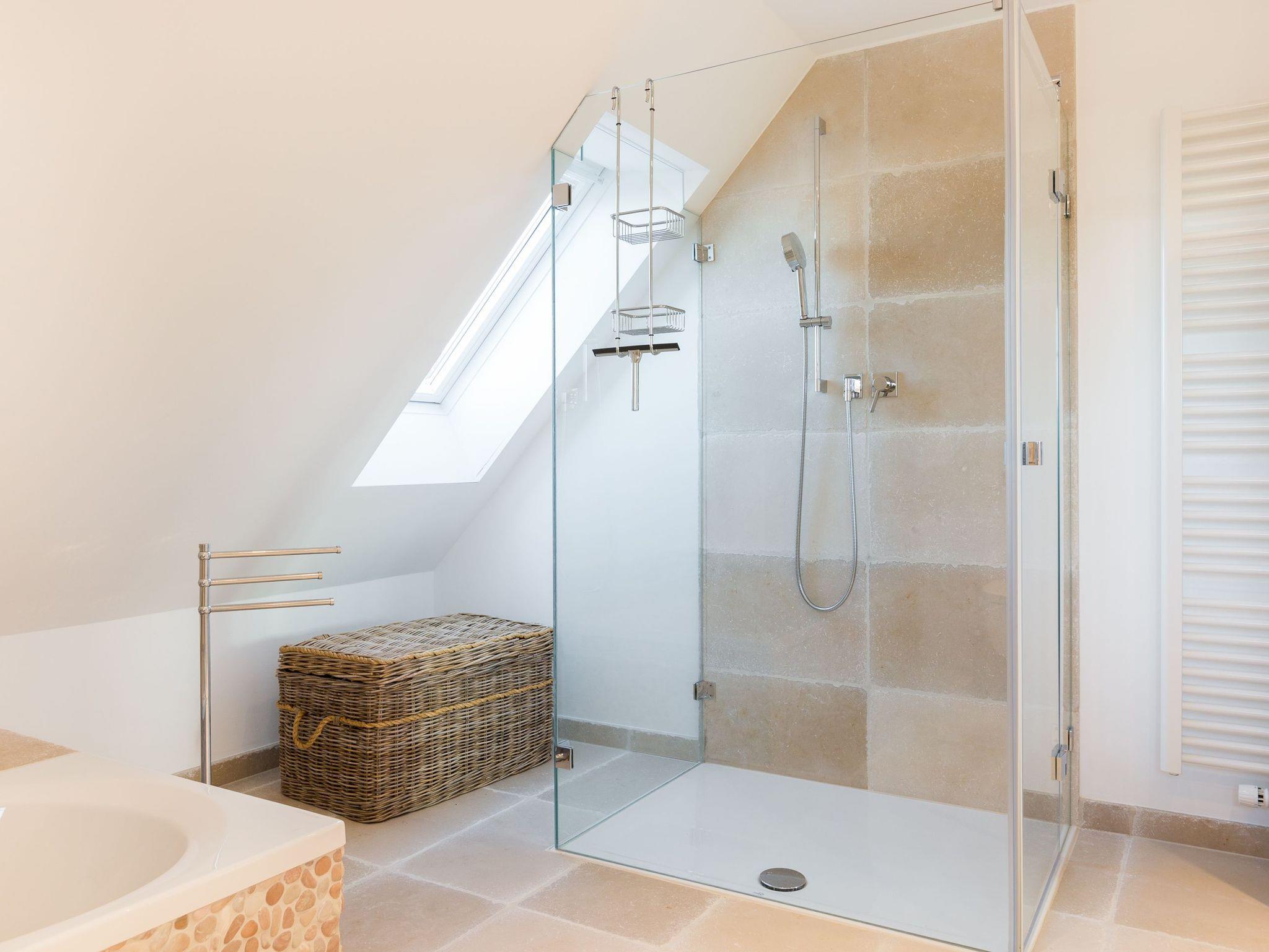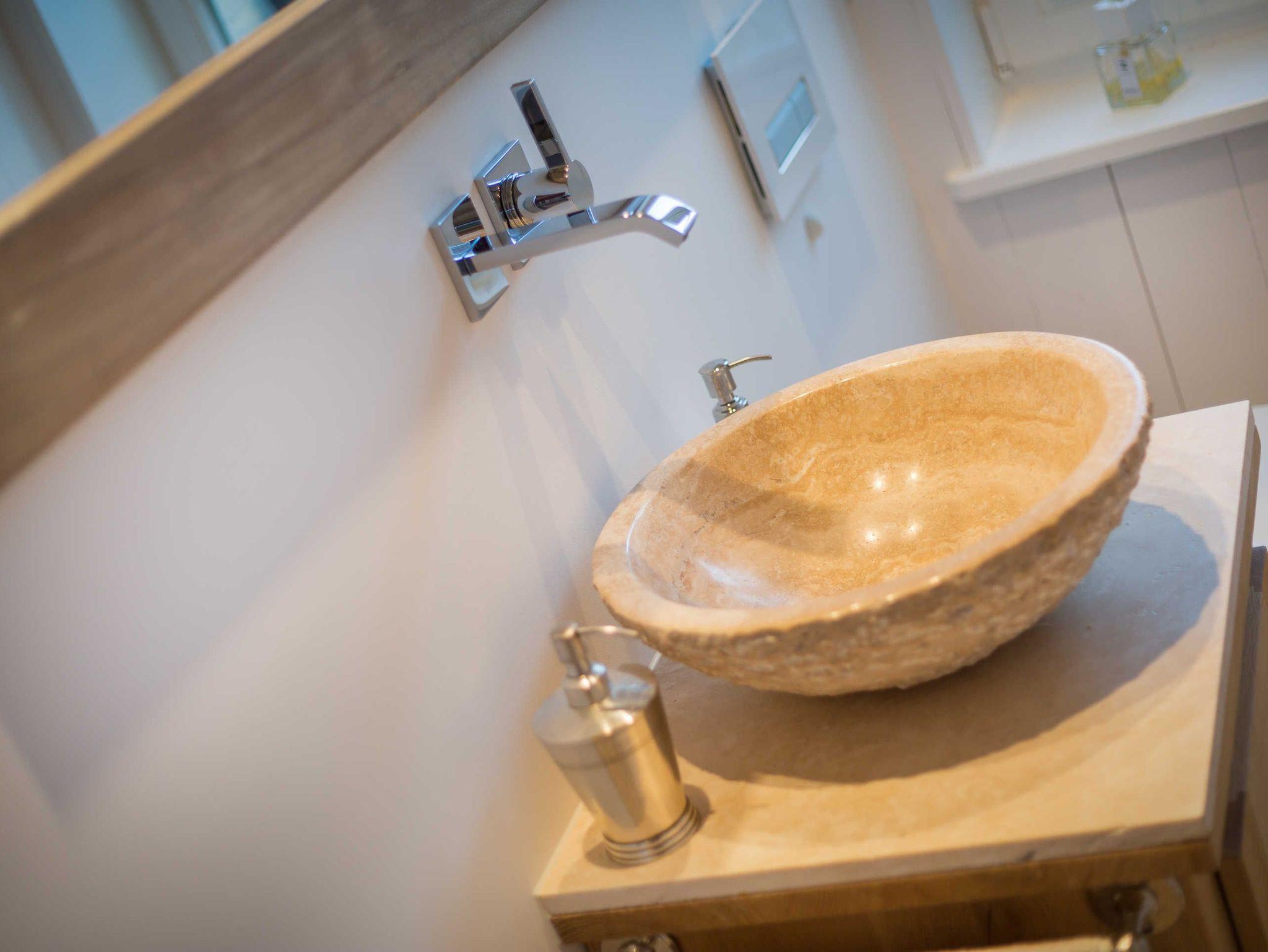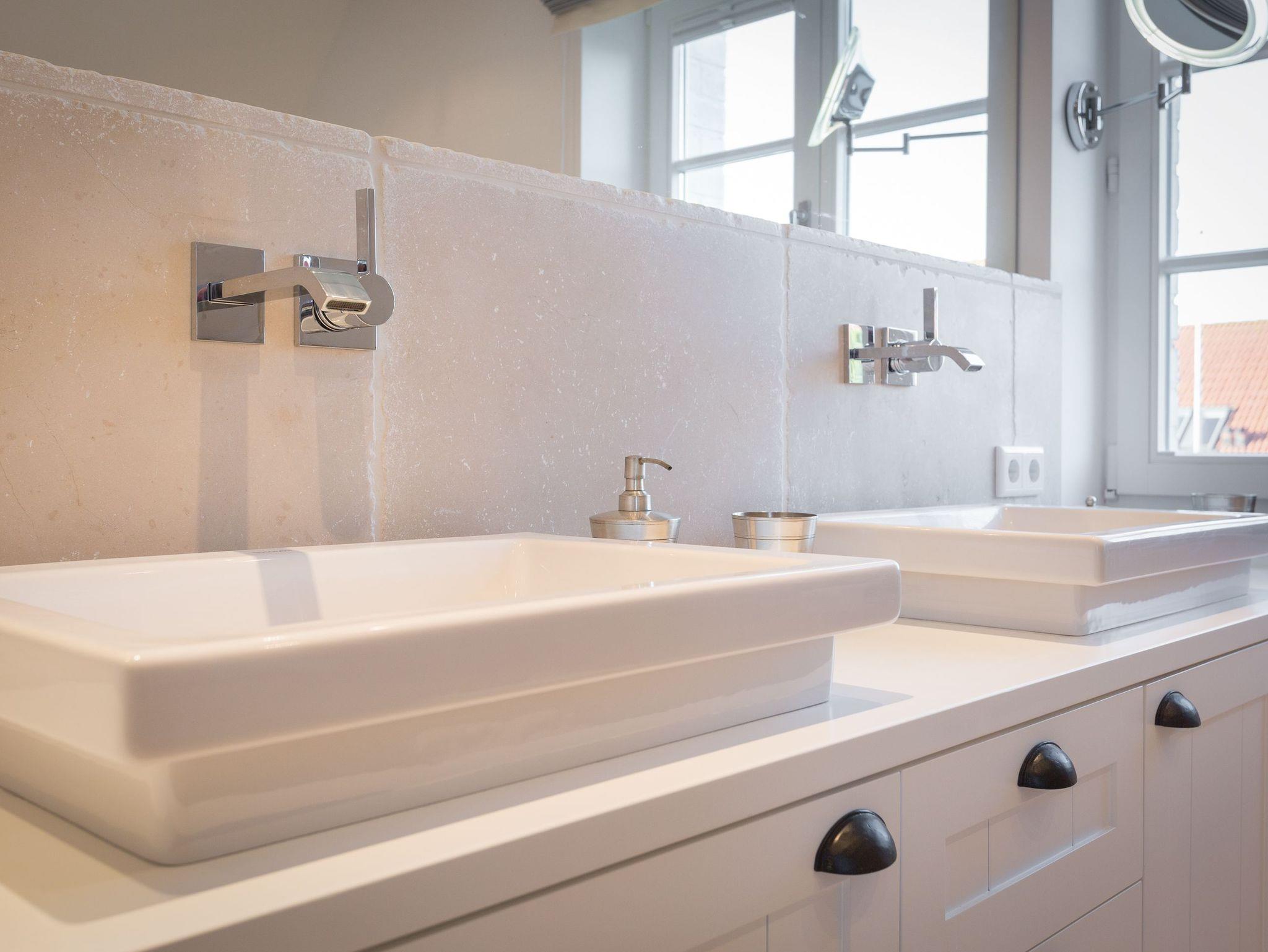 Das Obergeschoss bietet eine edle Optik mit weißer Holzvertäfelung. Oben befindet sich ein großes, helles Badezimmer mit Badewanne und geräumiger Duschkabine, zwei Waschbecken und WC. Im ersten Schlafzimmer findet sich ein 2 x 2 Meter großes Boxspringbett. Das zweite Schlafzimmer hat ein 1,60 x 2,00 Meter großes Doppelbett, einen kleinen Schreibtisch und ein eigenes Duschbad mit WC und separatem Waschraum mit Waschmaschine. Das dritte Schlafzimmer verfügt über ein ausziehbares Bett für ein bis zwei Personen, einen Schreibtisch und einen Fernseher. Alle Schlafzimmer sind mit Einbauschränken ausgestattet und bieten einen traumhaften Blick auf Meer und Natur.