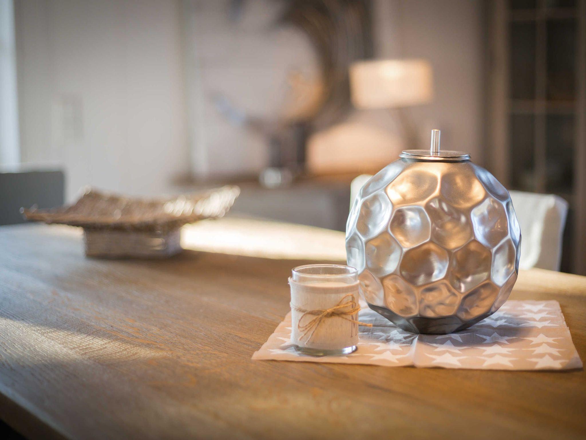 Im Erdgeschoss befindet sich ein geräumiges Wohnzimmer mit angeschlossenem Esszimmer und offener Wohnküche modernem Fernseher mit Satelliten-Empfang. Im Wohnzimmer sorgt der offene Kamin für romantische Stimmung. Die große Wohnküche ist vom geräumigen Esszimmer durch einen Frühstückstresen getrennt. Alle Annehmlichkeiten einer modernen Küche vom Herd bis hin zum Kühl- und Gefrierschrank und einer Spülmaschine sind vorhanden. Vom Wohnzimmer und Esszimmer kommen Sie auf die zwei Terrassen. Die Küche bietet einen weiteren Zugang zum Garten. Ebenfalls finden sich im Erdgeschoss ein Gäste-WC und ein Ankleidezimmer.