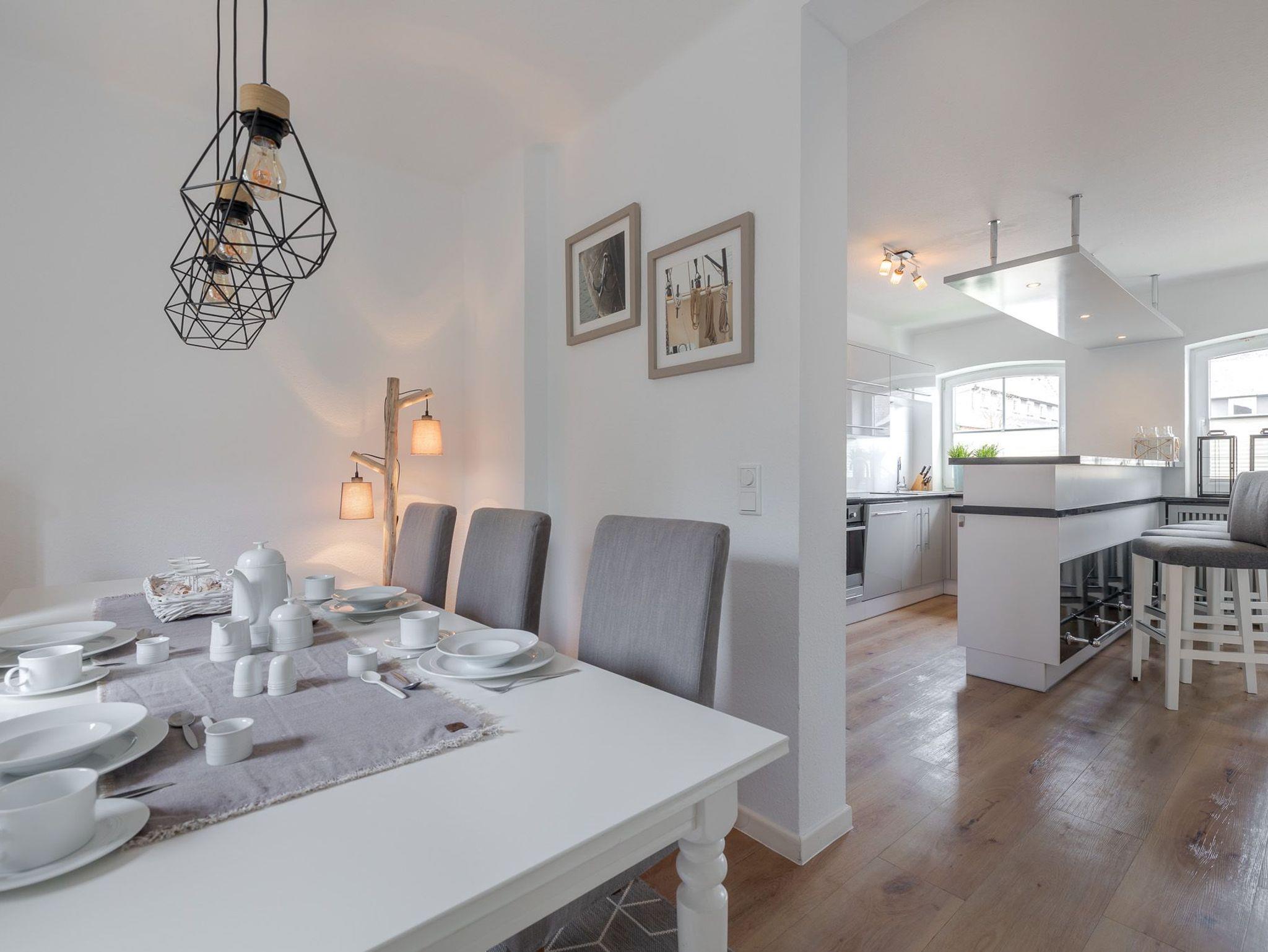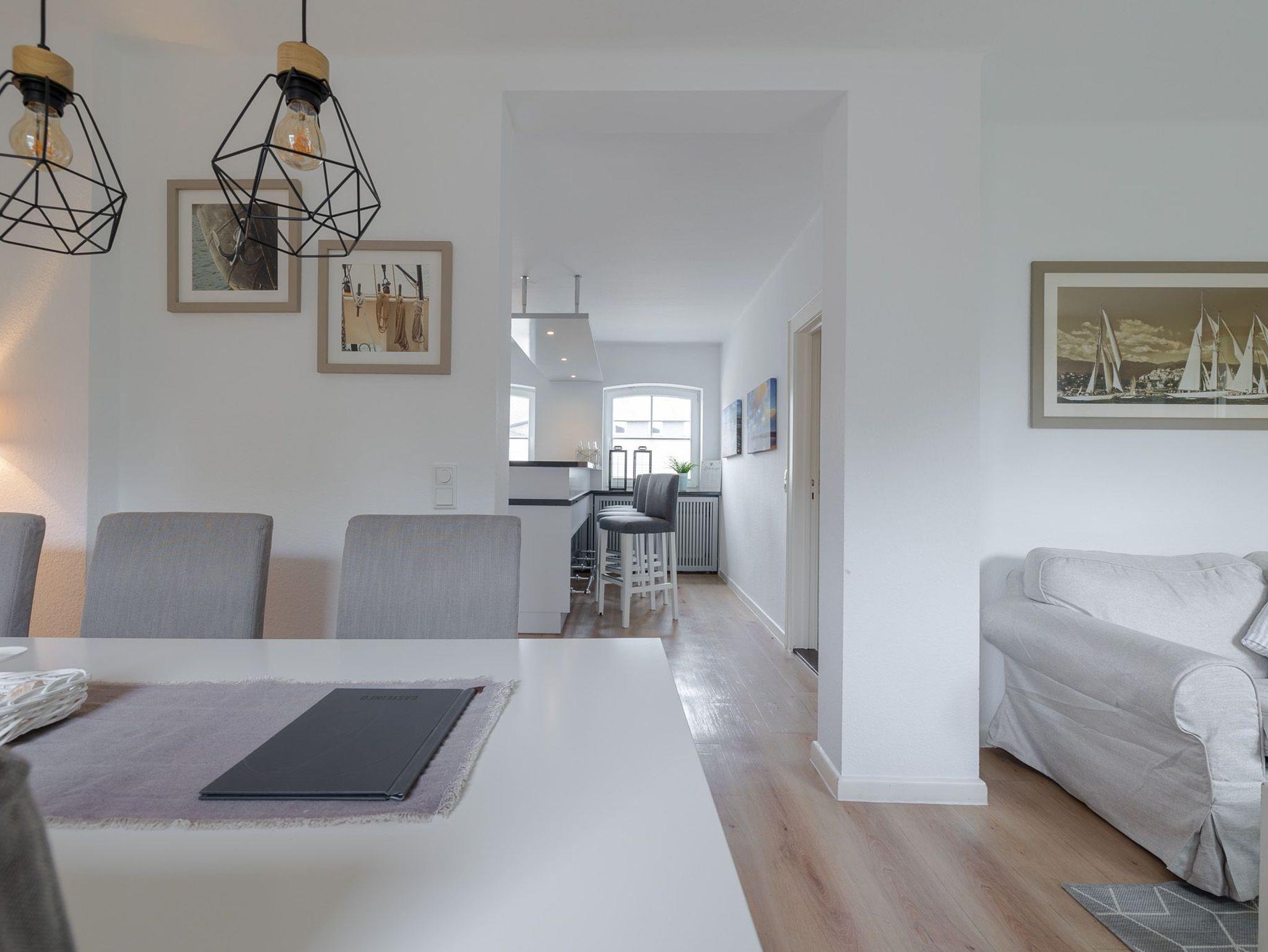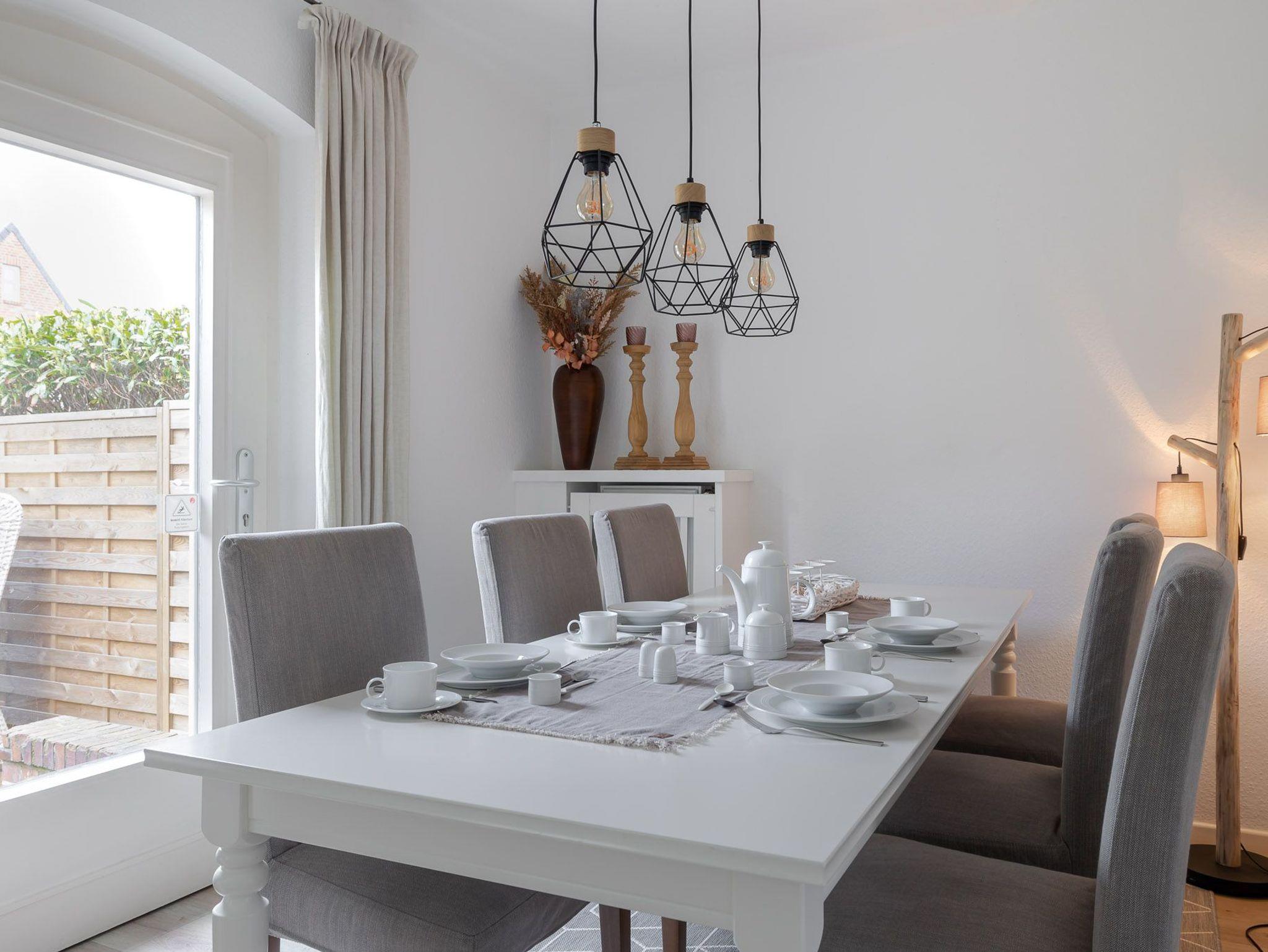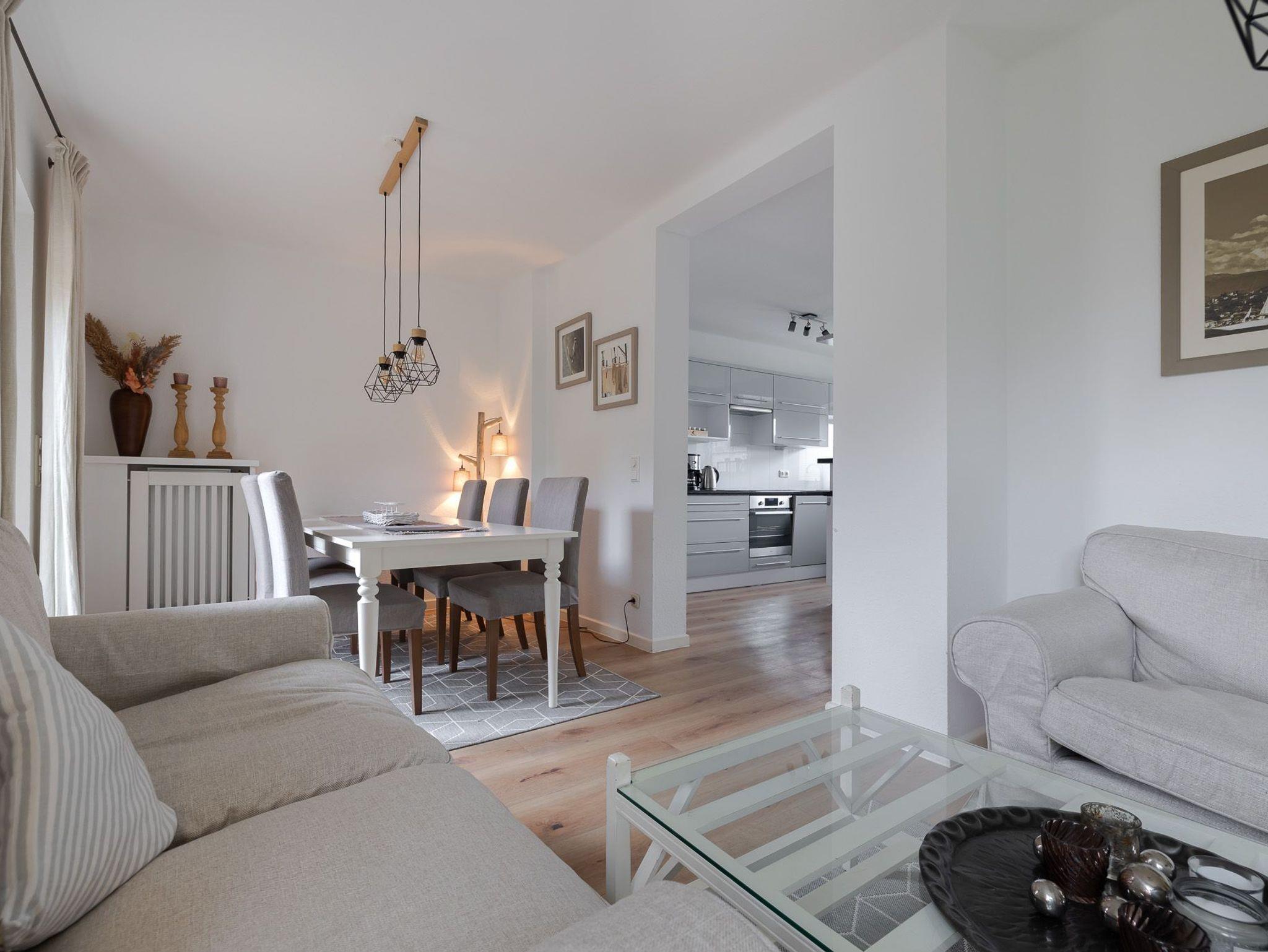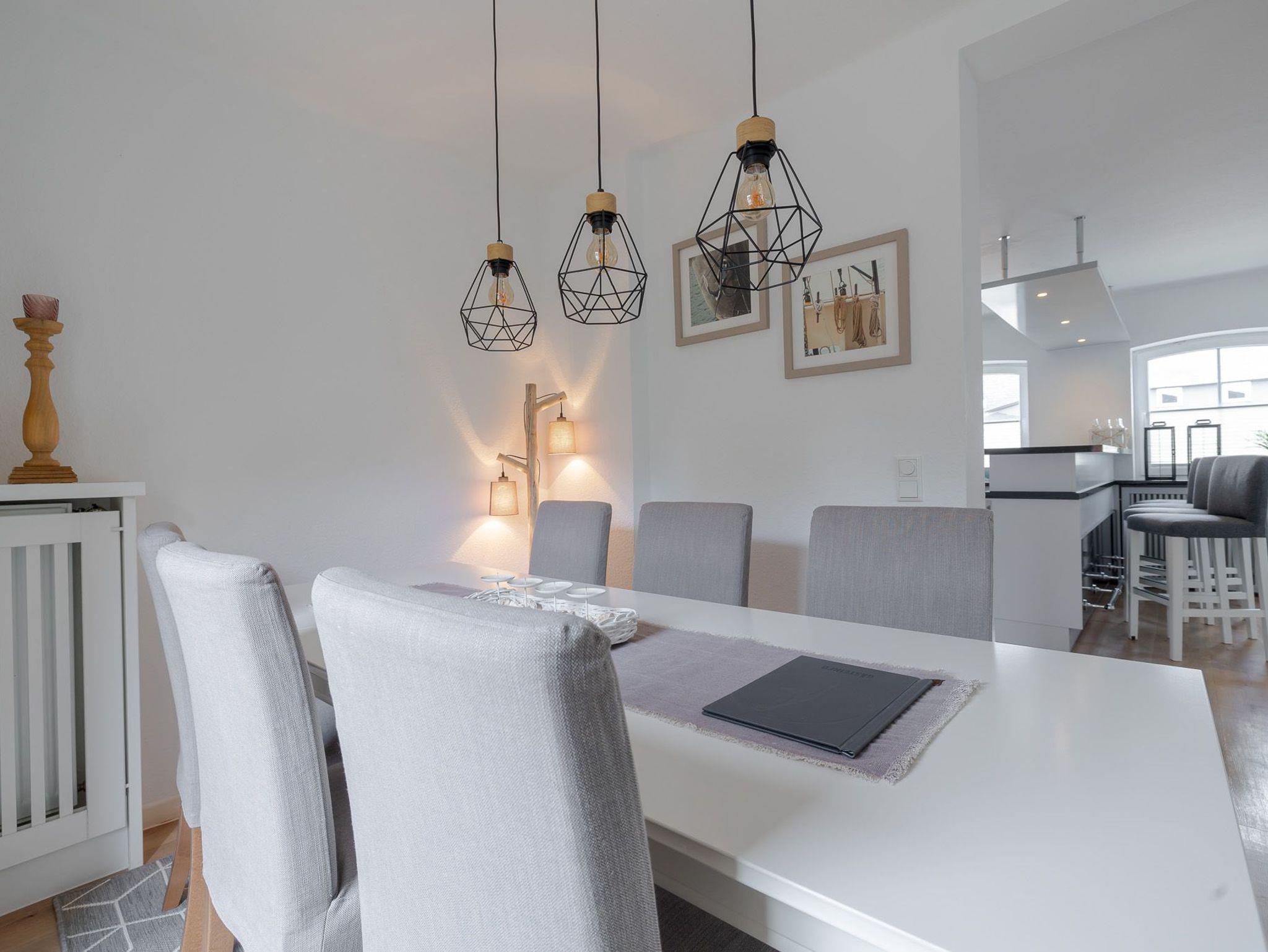 Gemütlicher Wohnbereich: Im Brünkhüs erwartet Sie ein modern eingerichtetes Wohnzimmer mit einem großzügigen Essbereich, perfekt für gemeinsame Mahlzeiten und gesellige Abende. Die integrierte Küche ist komplett ausgestattet und bietet Ihnen alles, was Sie für die Zubereitung Ihrer Lieblingsspeisen benötigen.