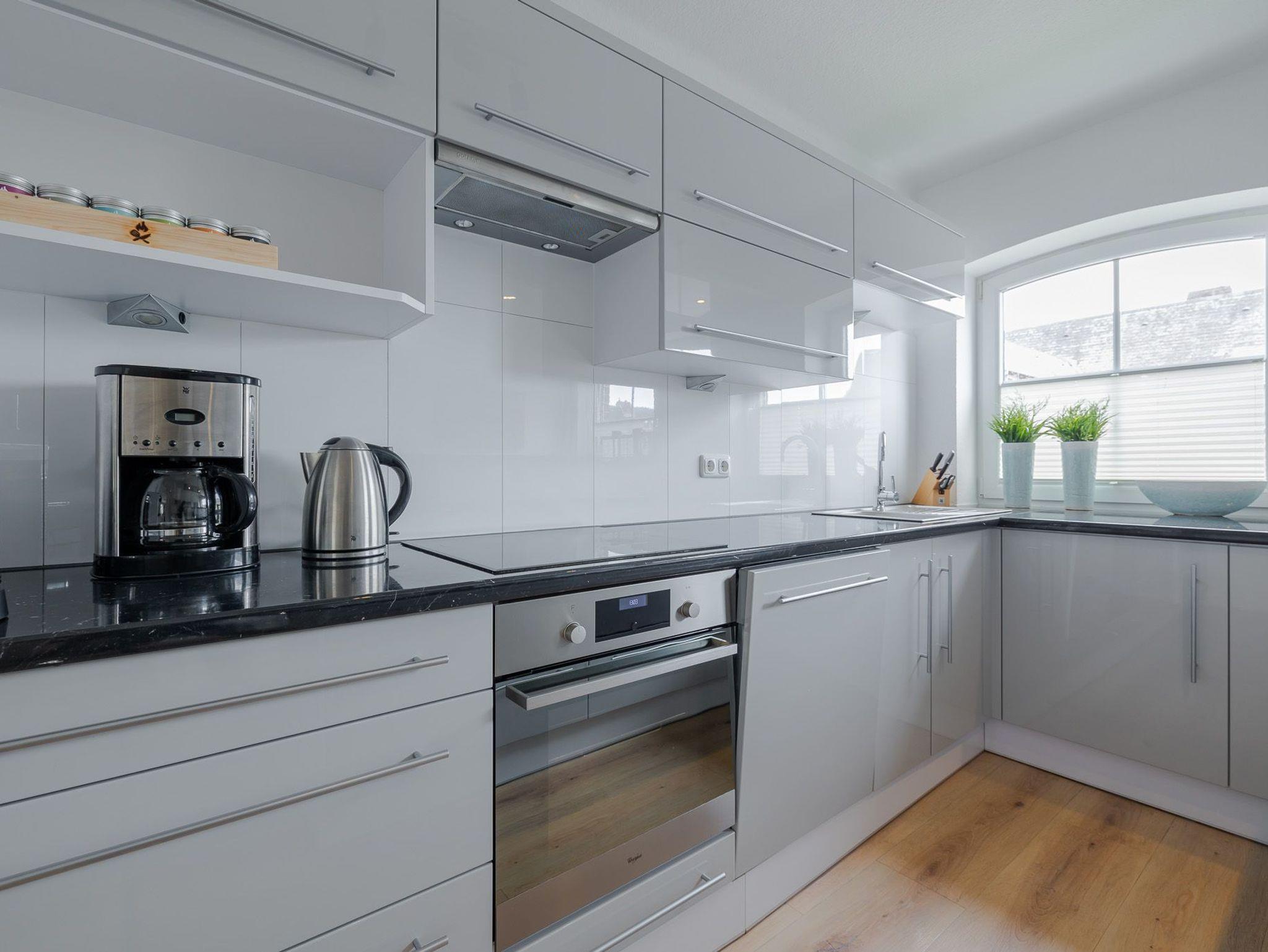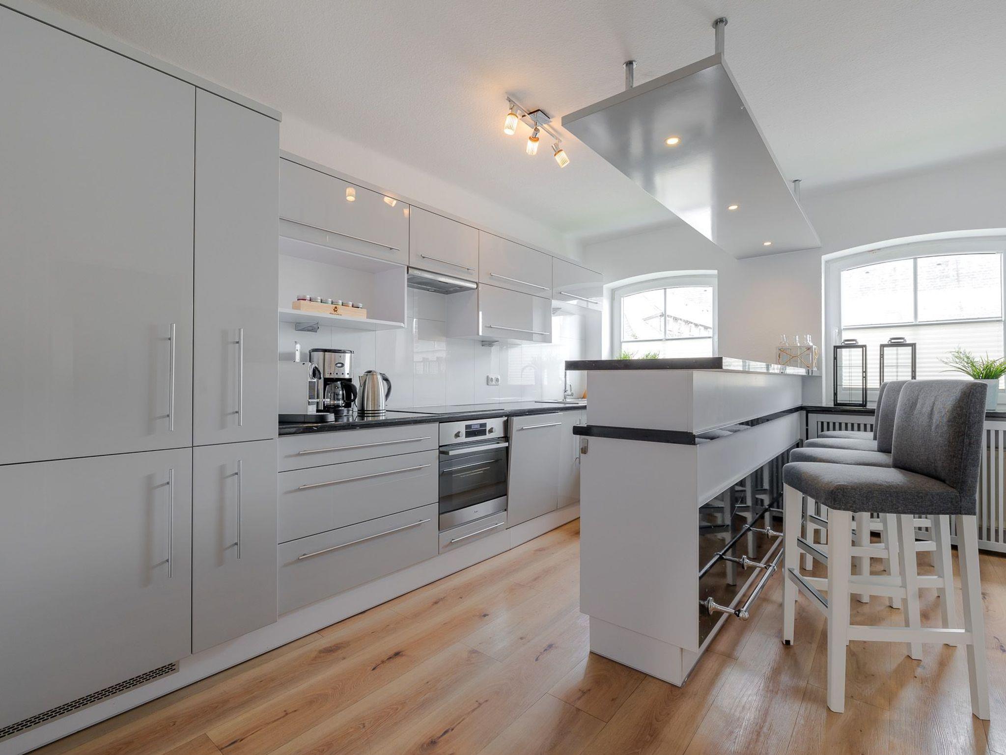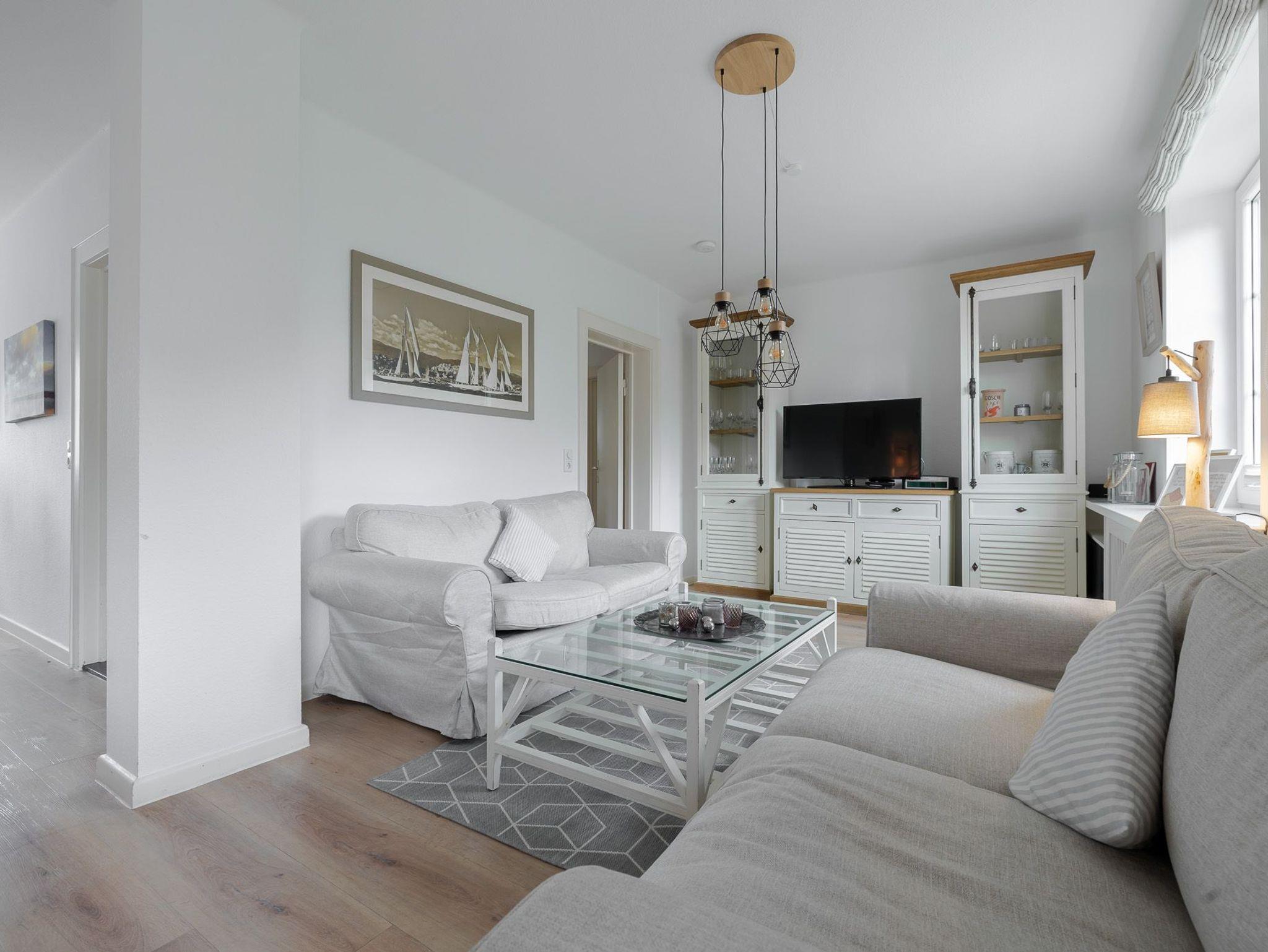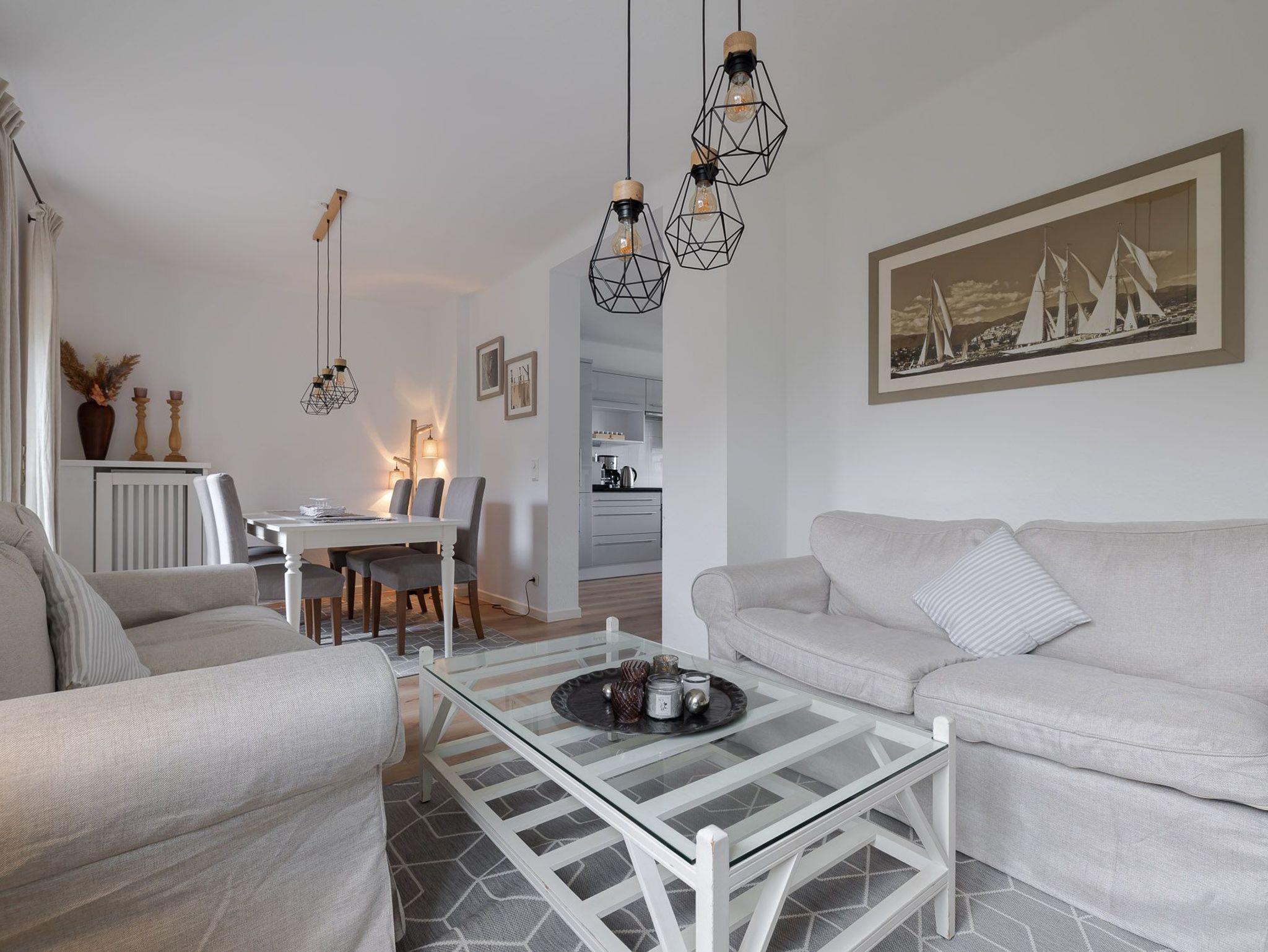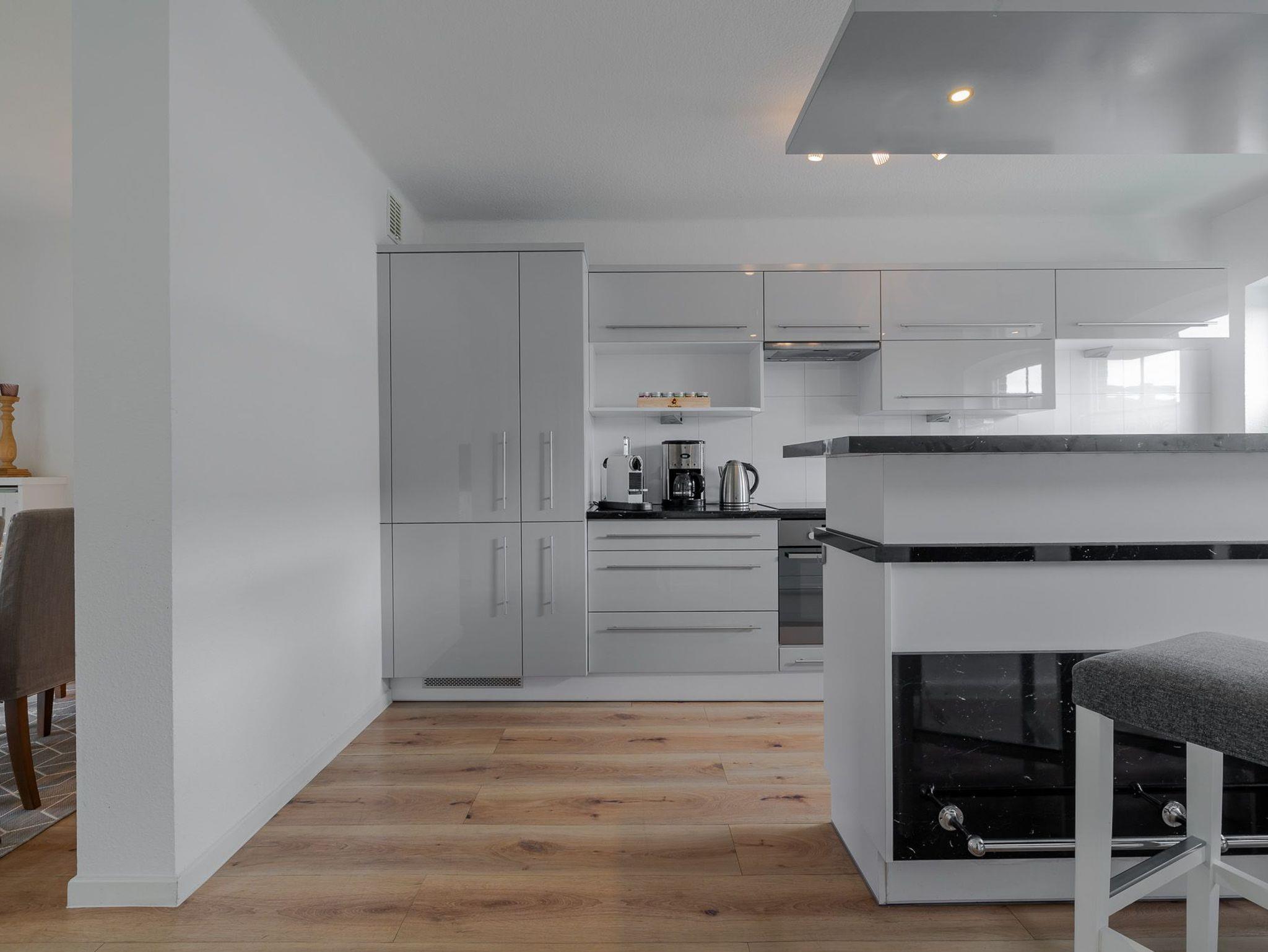 Gemütlicher Wohnbereich: Im Brünkhüs erwartet Sie ein modern eingerichtetes Wohnzimmer mit einem großzügigen Essbereich, perfekt für gemeinsame Mahlzeiten und gesellige Abende. Die integrierte Küche ist komplett ausgestattet und bietet Ihnen alles, was Sie für die Zubereitung Ihrer Lieblingsspeisen benötigen.