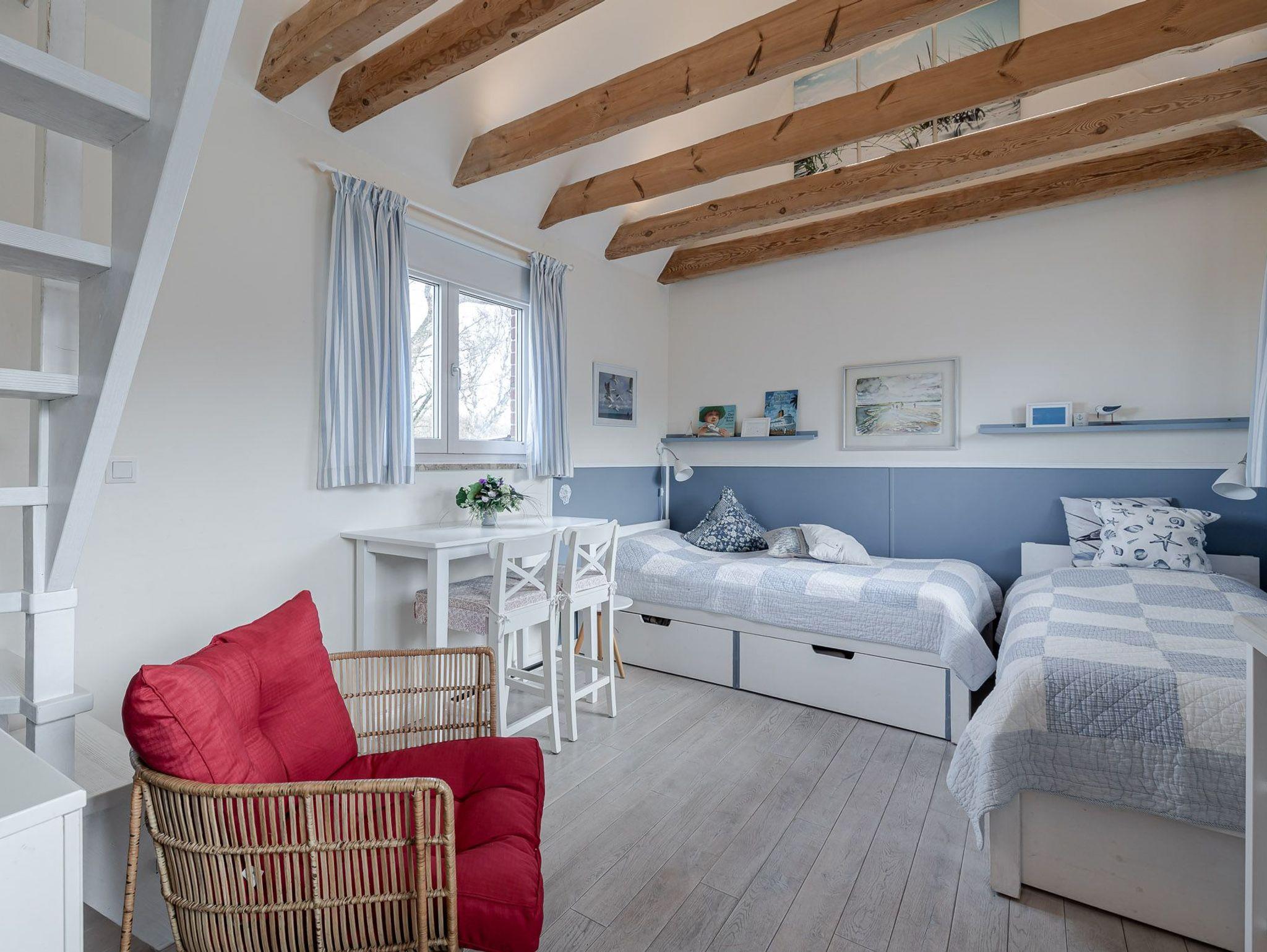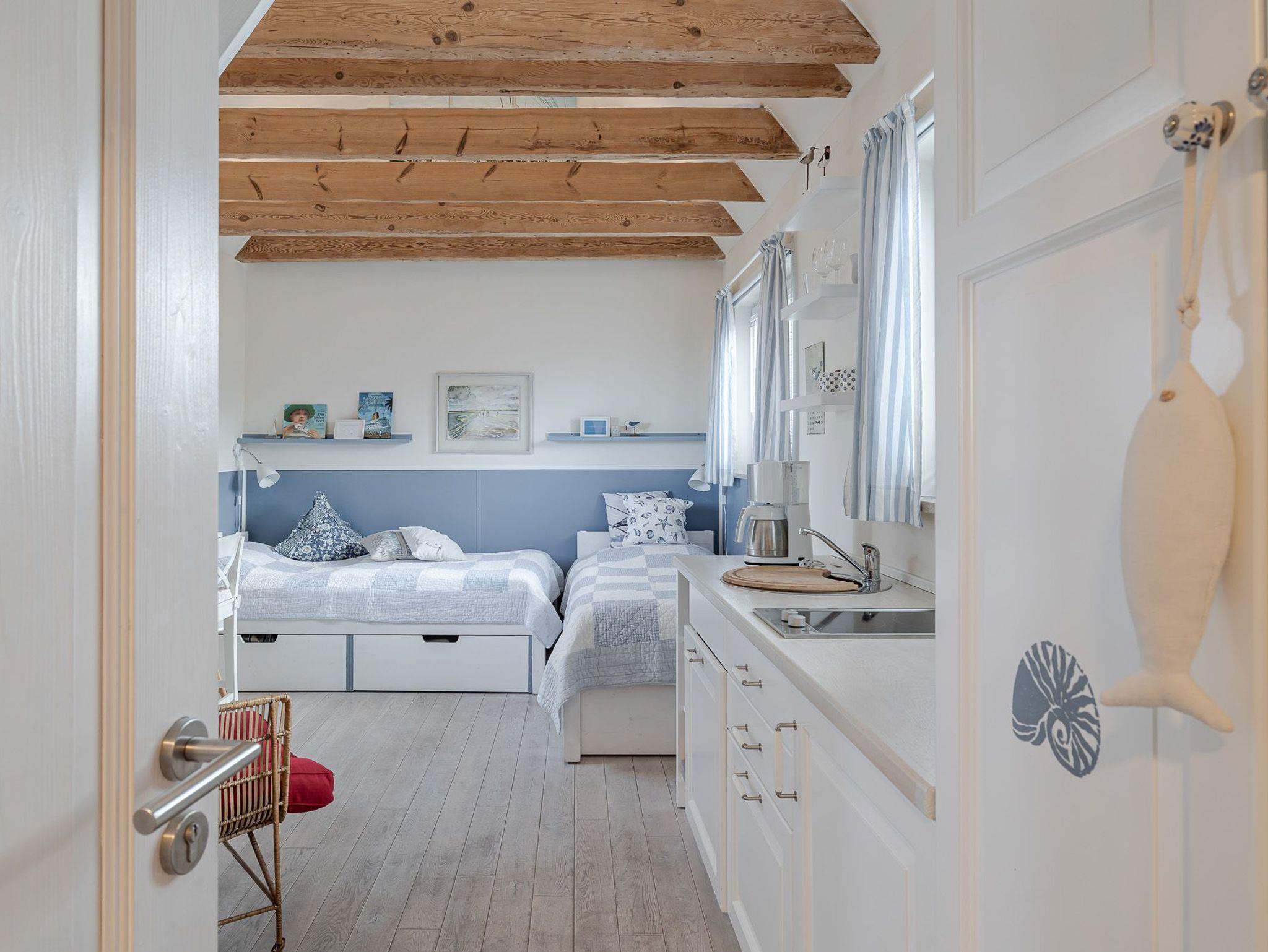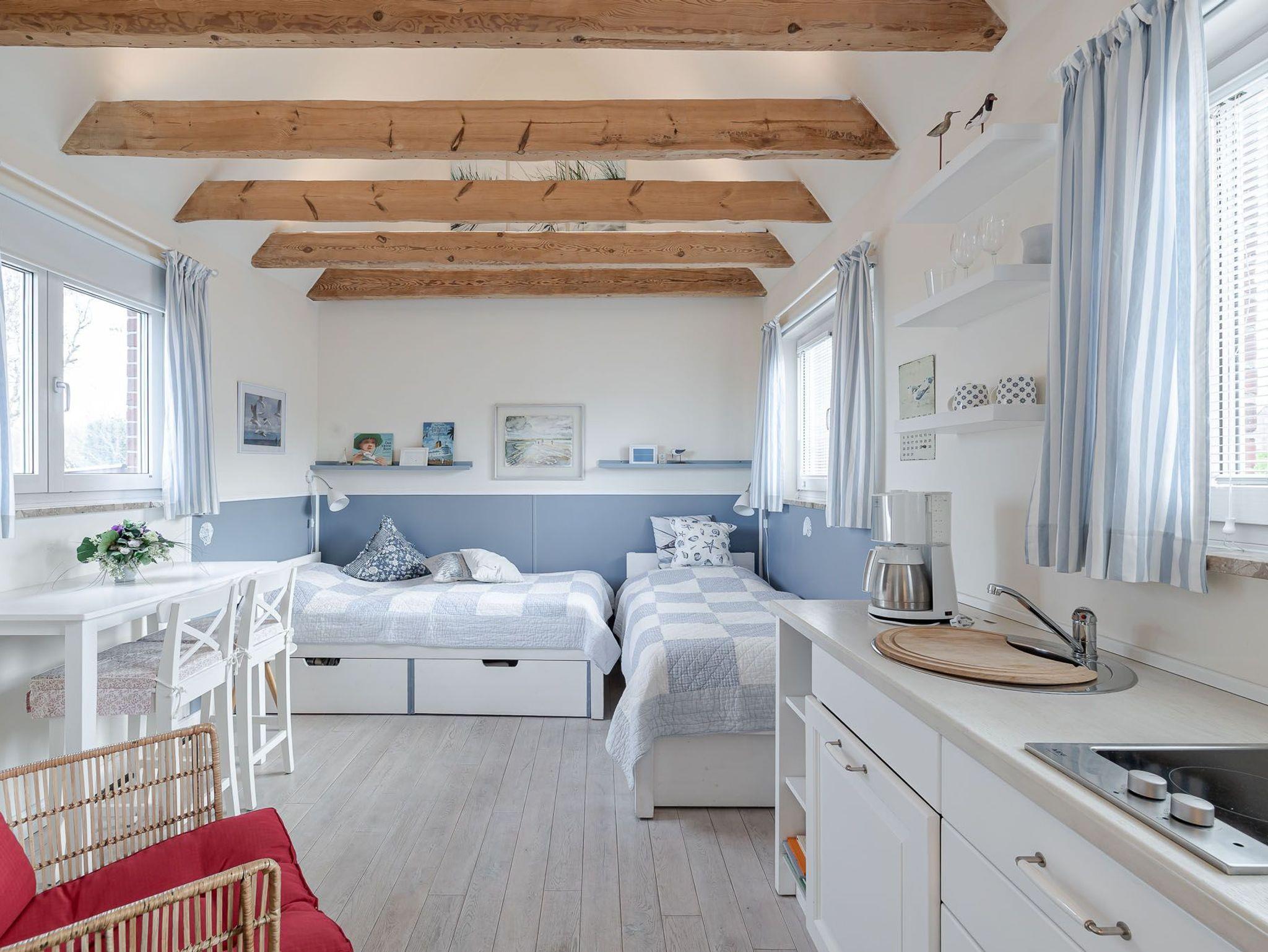 Das Haus ist für bis zu vier Personen ausgelegt und überzeugt durch eine durchdachte Raumaufteilung über zwei Ebenen. Der gemütliche Wohnbereich im Erdgeschoss mit Kamin schafft insbesondere in der kühleren Jahreszeit eine behagliche Atmosphäre und lädt zu entspannten Abenden ein.