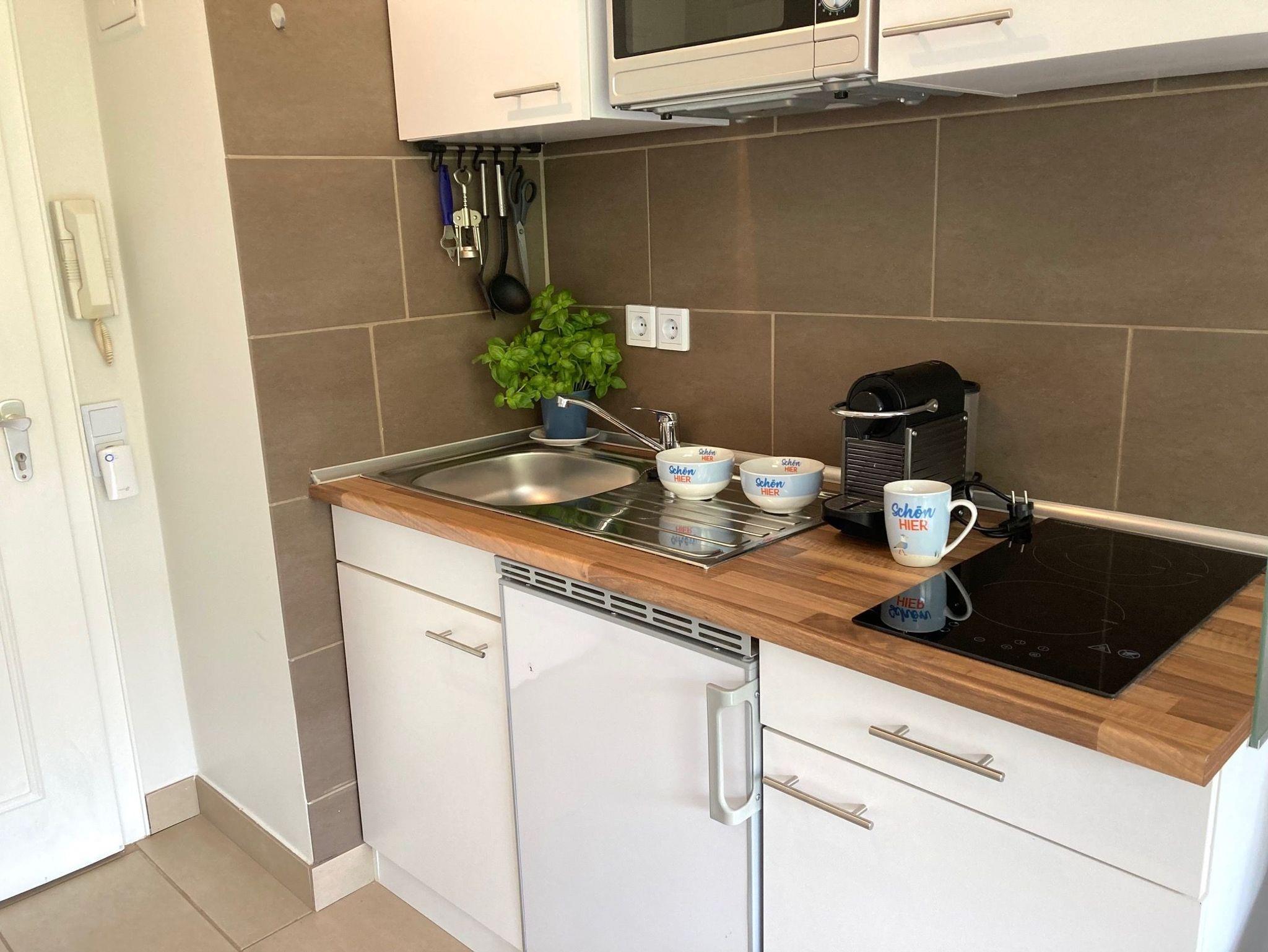 Voll ausgestattete Küchenzeile inkl. Mikrowelle, Kühlschrank, Kaffeemaschine, Kapselautomat und Toaster