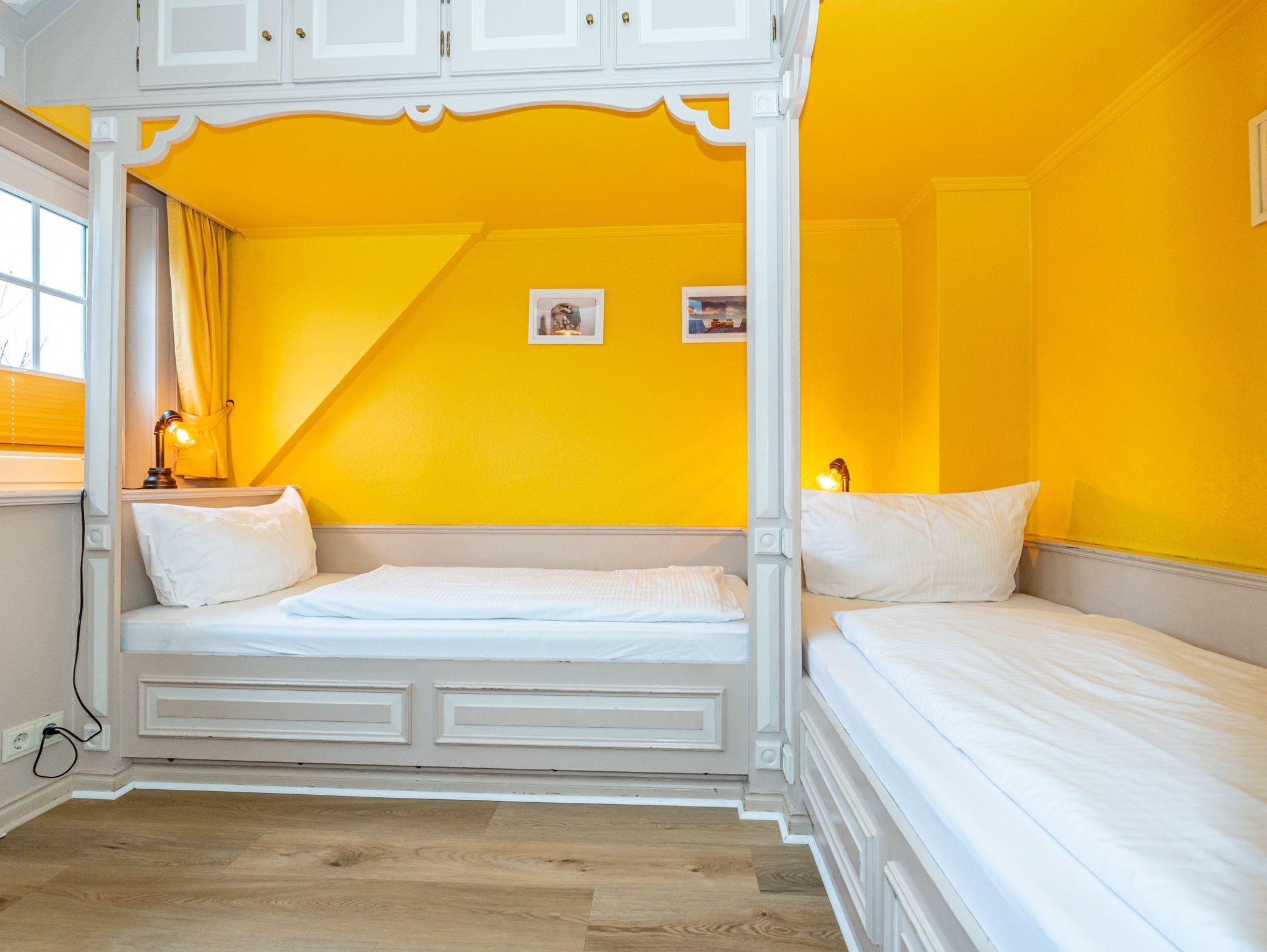 Das fünfte Apartment liegt im 1. Obergeschoss des Hauses und bietet auf 50 Quadratmeter Platz für 4 Personen. Im Wohn- und Essbereich befinden sich zwei gemütliche Alkovenbetten. Das abgetrennte Schlafzimmer verfügt über ein Doppelbett. Die separate Küche grenzt an den Wohnbereich. Bequeme Sitzmöglichkeiten runden das gemütliche Ambiente ab. Das Badezimmer ist ausgestattet mit Dusche, WC und Waschbecken.