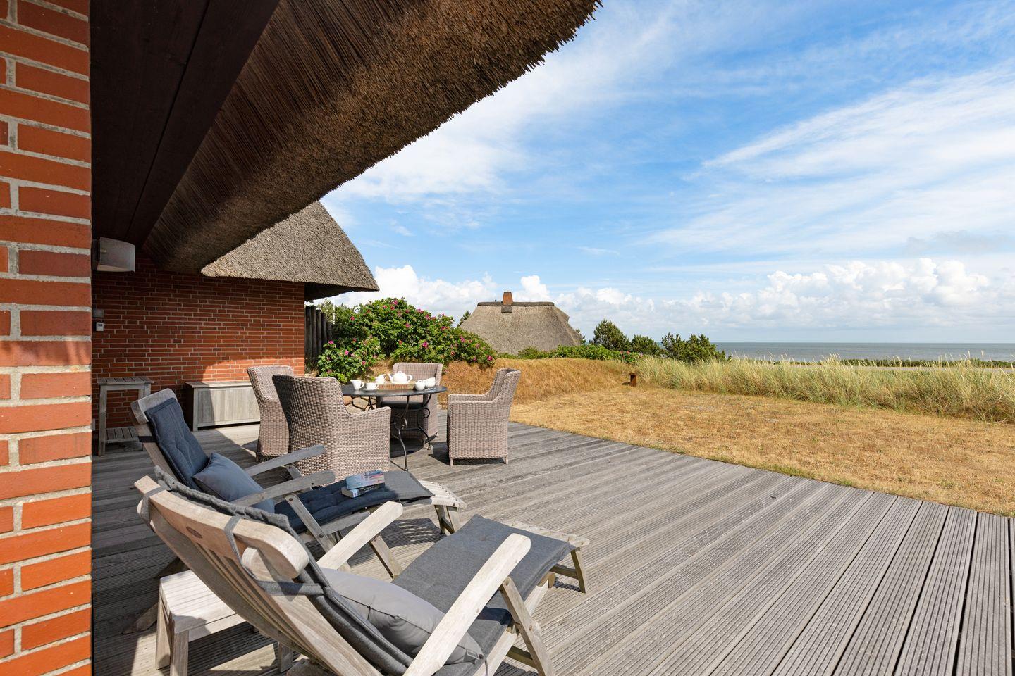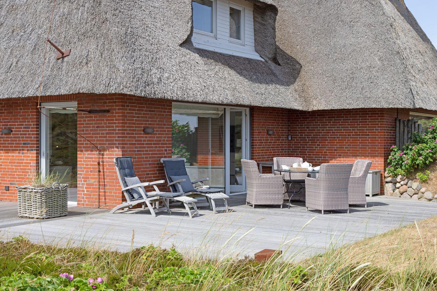 Das Haus verfügt über eine große Holzterrasse ausgestattet mit Strandkorb, Sonnenliegen und Gartenmöbeln.