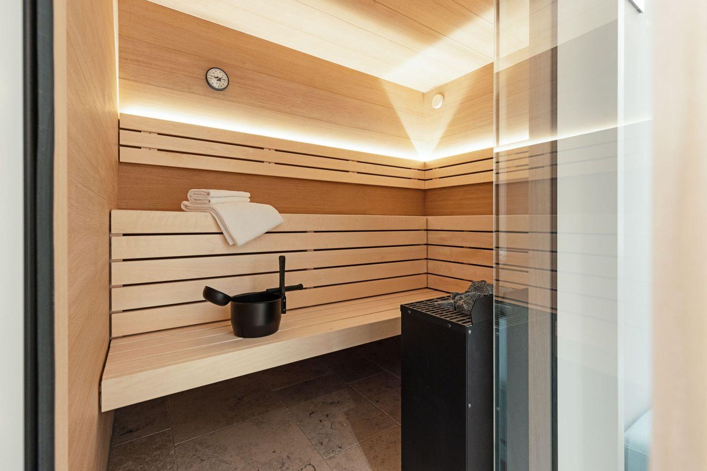 Der große Wellnessbereich mit Sauna, freistehender Badewanne und Sitzecke bietet Ihnen viele Möglichkeiten zum entspannen.