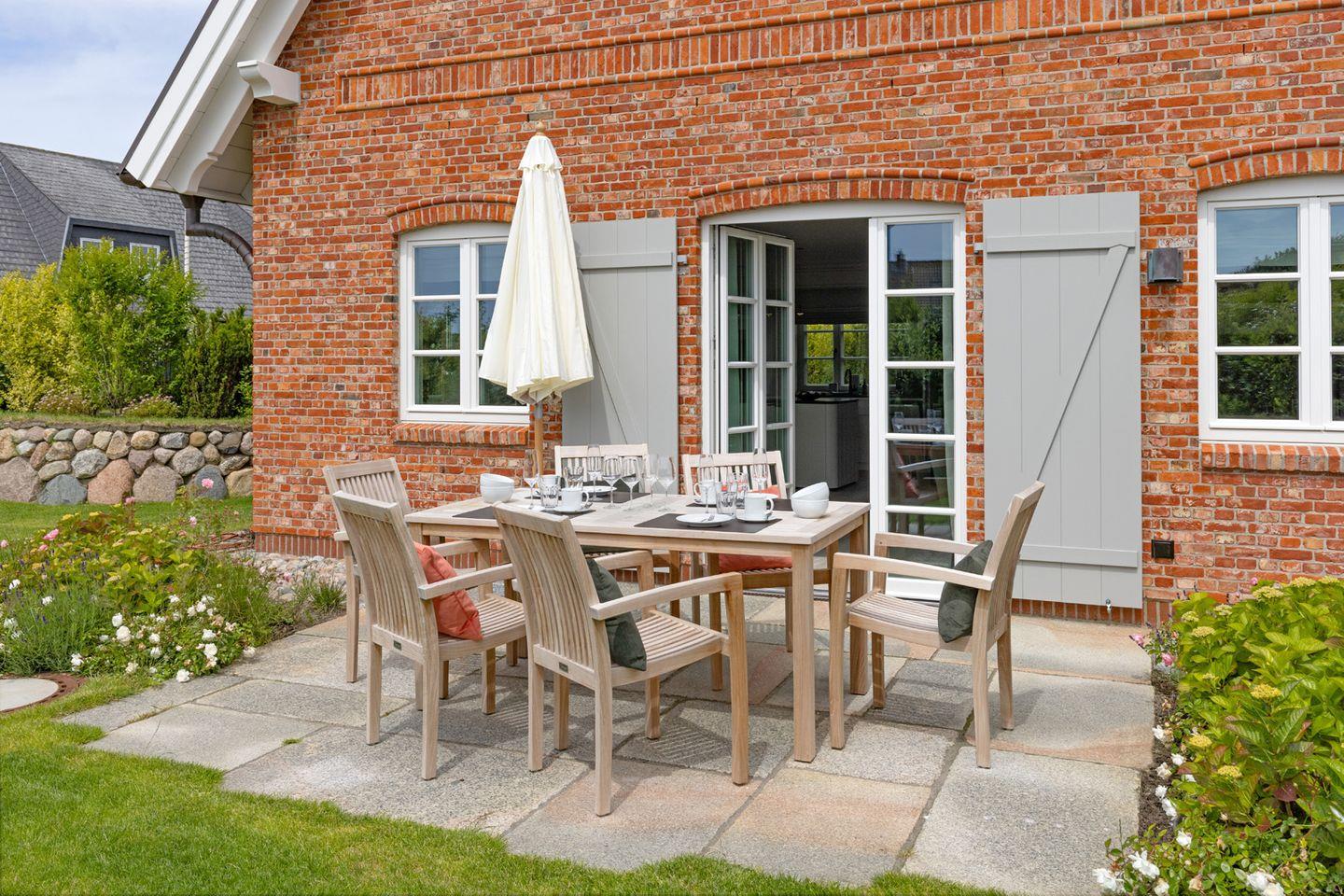 Zum Haus gehört ein großer Garten mit Terrasse und Gartenmöbeln.
