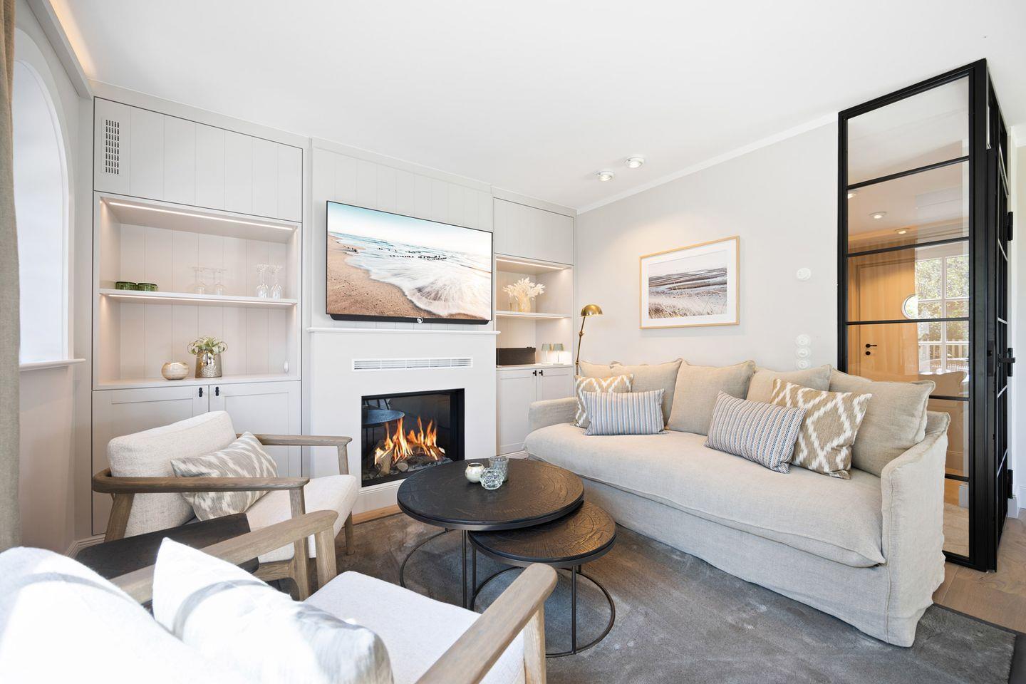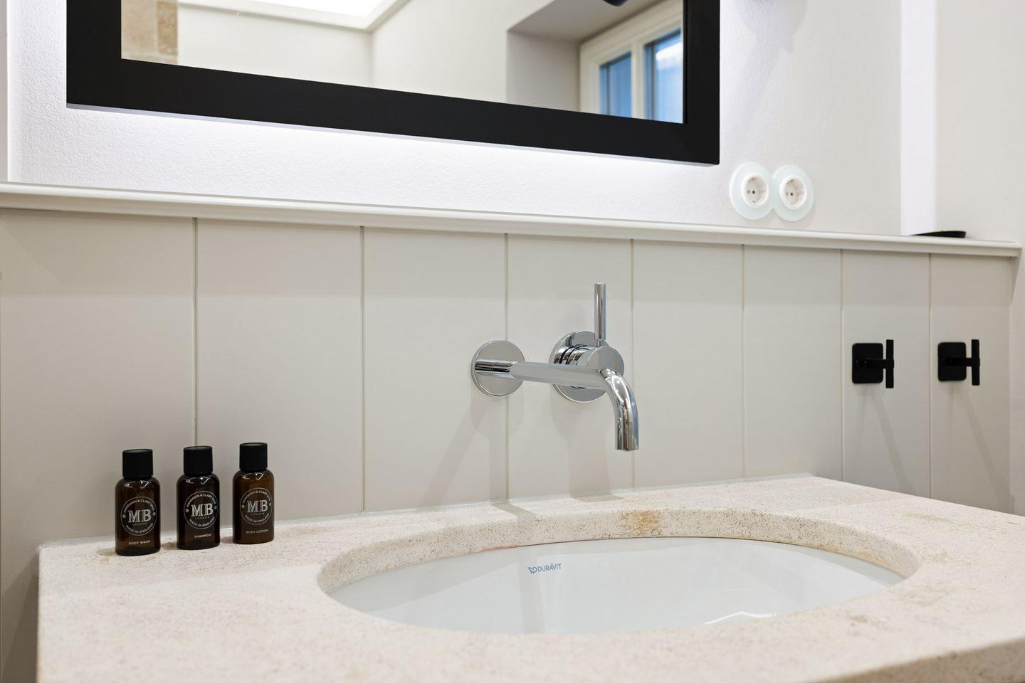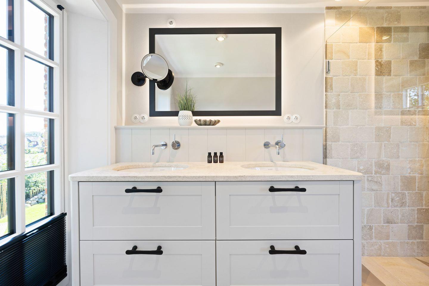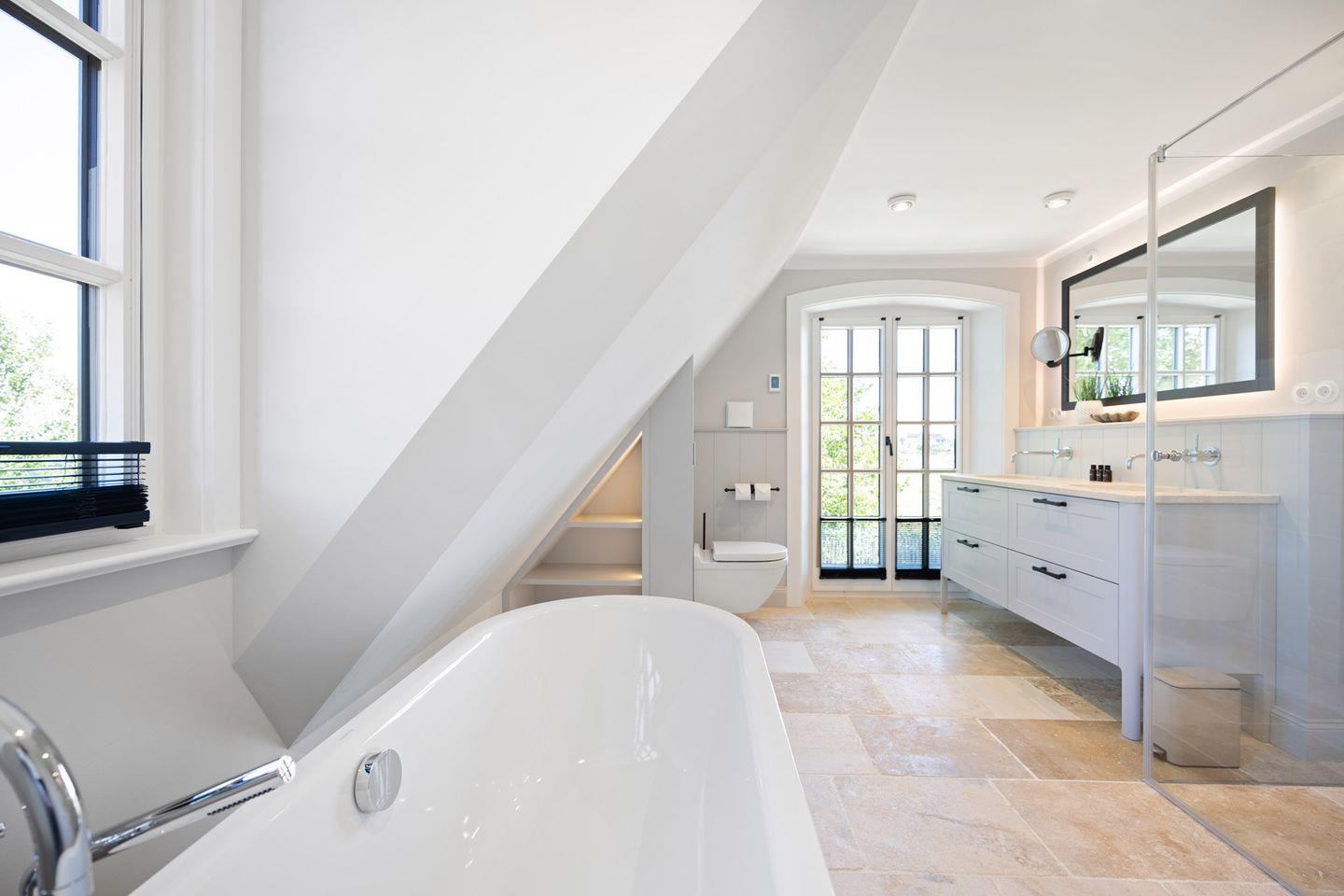 Die Doppelhaushälfte verfügt über zwei luxuriöse Badezimmer. Eines der Badezimmer ist mit einer bodengleichen Dusche, Tageslicht und einem Föhn ausgestattet. Das Wellnessbad besticht durch eine Sauna, eine freistehende Badewanne und eine bodengleiche Dusche – ideal für entspannte Stunden nach einem Tag auf der Insel. Ein separates Gäste-WC rundet das Angebot ab.