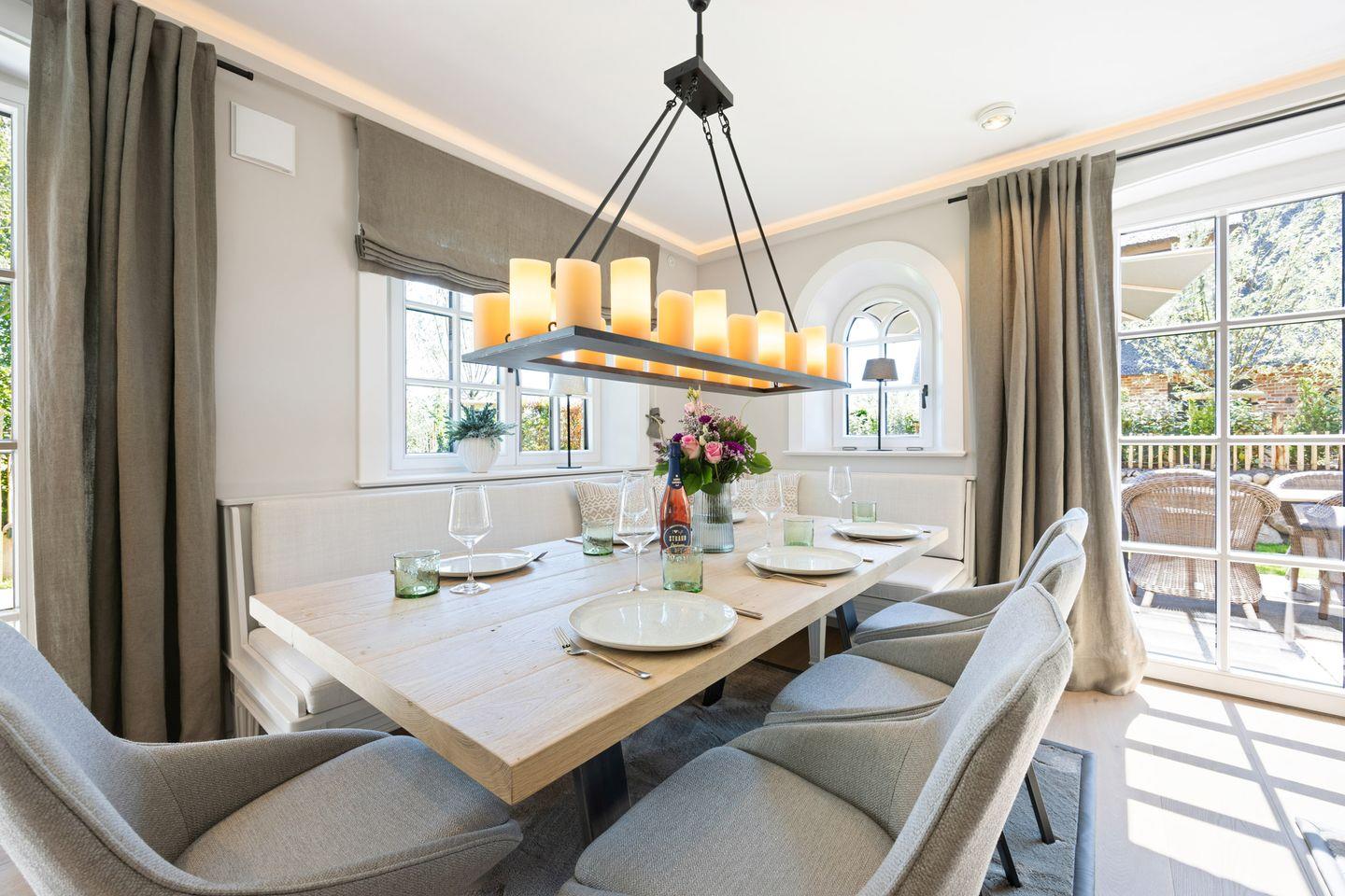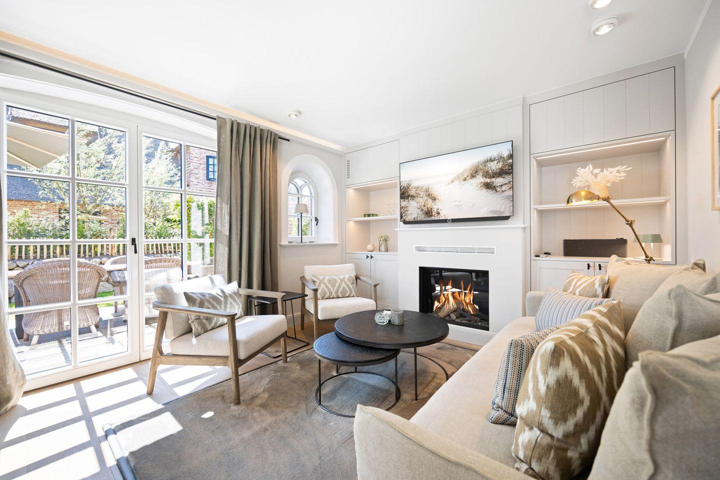 Der offene Wohn- und Essbereich bietet eine einladende Atmosphäre, in der Sie sich sofort wohlfühlen werden. Machen Sie es sich auf dem bequemen Sofa oder in den zwei Sesseln vor dem Kamin gemütlich, während Sie den Blick in den Garten genießen. Die zwei Freisitze in süd-östlicher Ausrichtung laden dazu ein, die frische Nordseeluft und den Sonnenschein zu genießen.