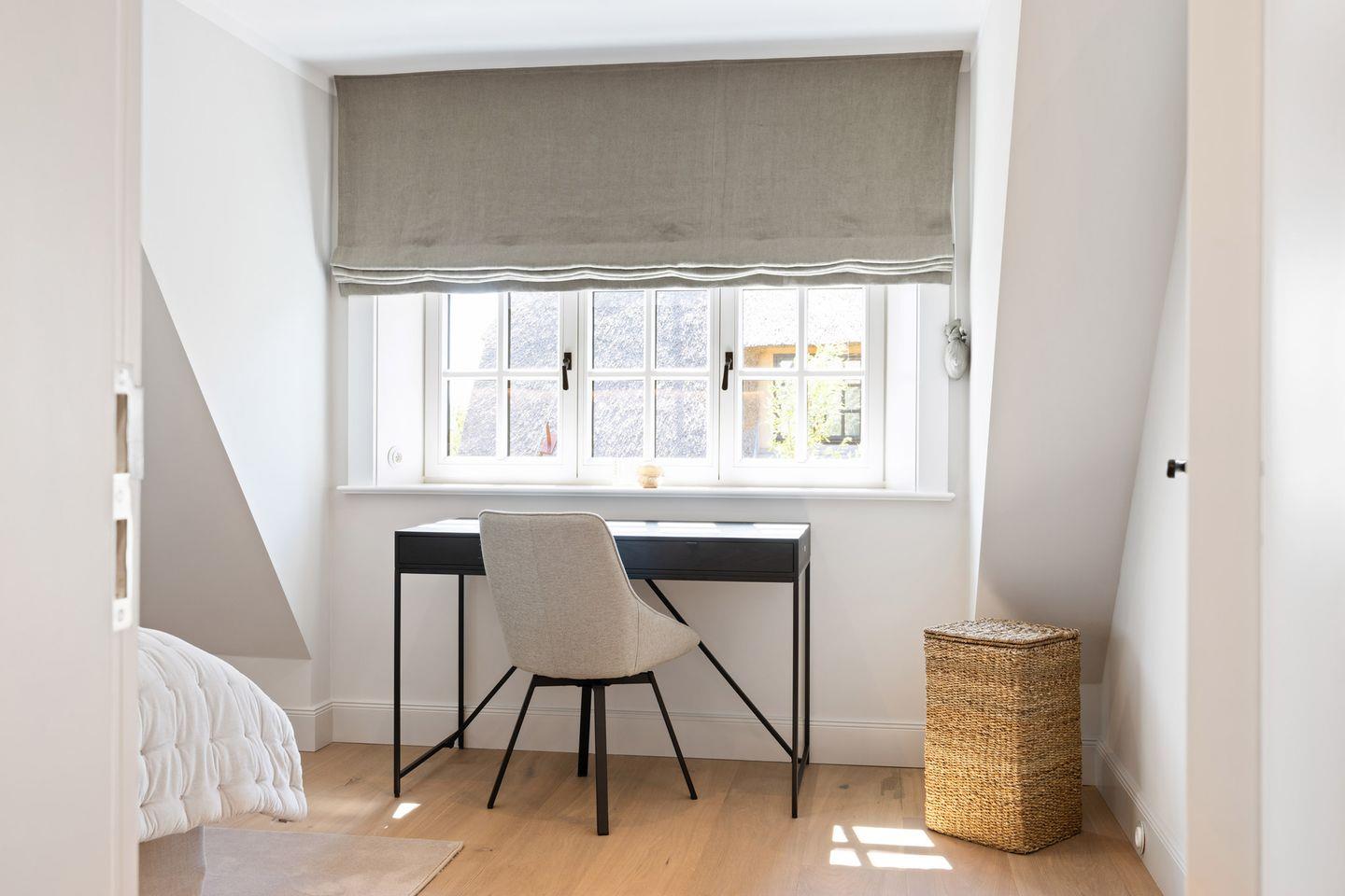 Die Doppelhaushälfte bietet ein stilvoll eingerichtetes Schlafzimmer: ausgestattet mit einem komfortablen Boxspringbett sowie einem eigenen Ankleideraum ausgestattet. So genießen Sie höchsten Komfort und erholsame Nächte.
