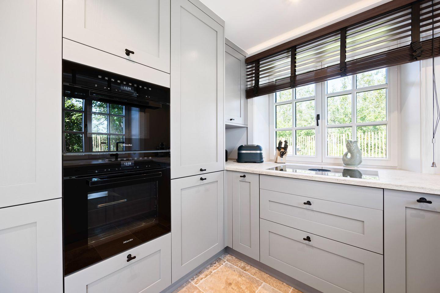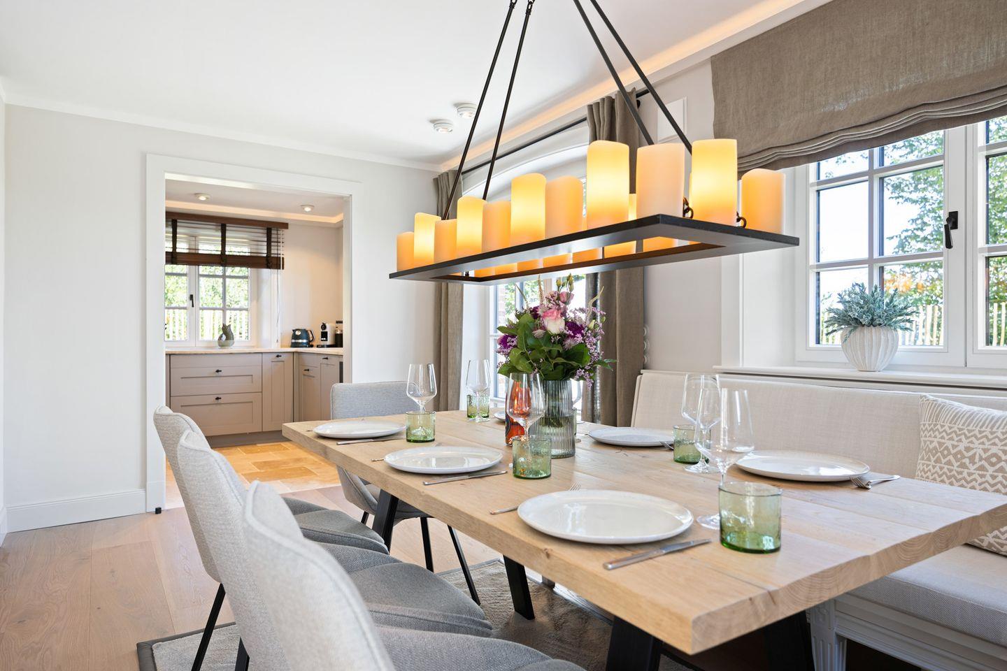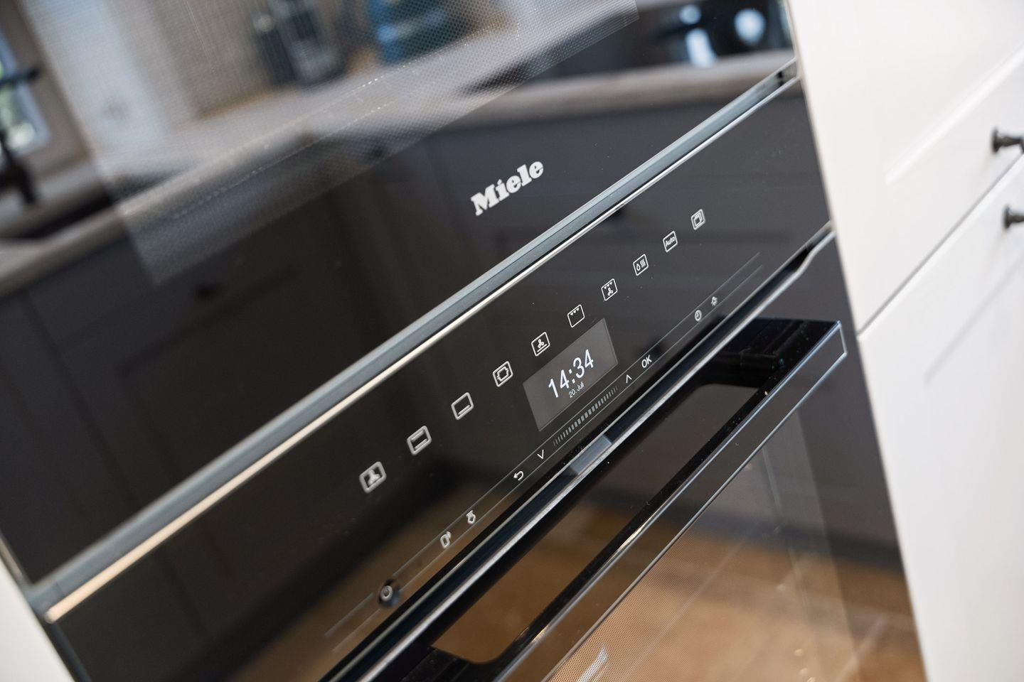 Die in den Wohnbereich integrierte, offene Küche ist mit hochwertigen Miele-Einbaugeräten und einem BORA Kochfeld ausgestattet. Weitere Highlights sind der Dampfgarer, der Weinkühlschrank und die Moccamaster Kaffeemaschine. Am großen Esstisch finden bis zu 6 Personen Platz – perfekt für gesellige Abende.