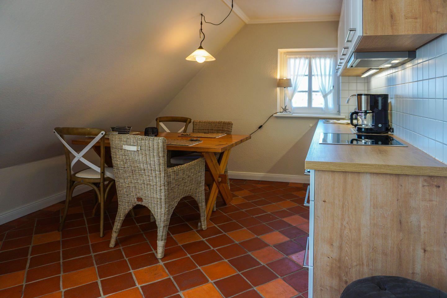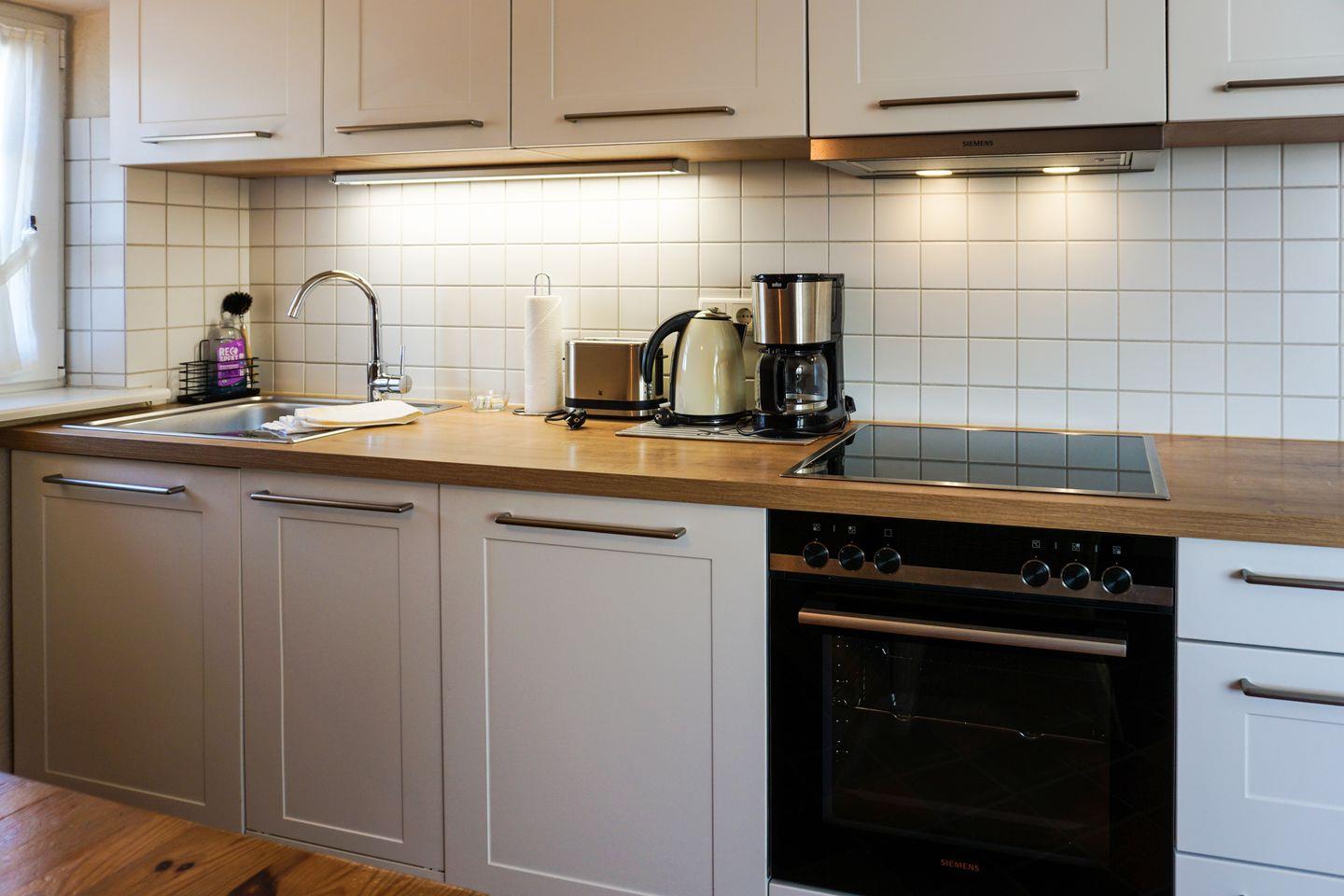 Die offene Küche ist funktional ausgestattet und grenzt direkt an das Wohnzimmer an. Zur Kücheneinrichtung gehören ein Kühlschrank mit Gefrierfach, ein Cerankochfeld, ein Elektro-Backofen, eine Spülmaschine sowie diverse Küchenutensilien, Geschirr, Besteck, Toaster, Kaffeemaschine, Wasserkocher und ein Mixer. So können Sie sich auch im Urlaub problemlos selbst versorgen und Ihre Lieblingsgerichte zubereiten. Ein Esstisch mit Sitzgelegenheiten bietet Platz für gemeinsame Mahlzeiten.