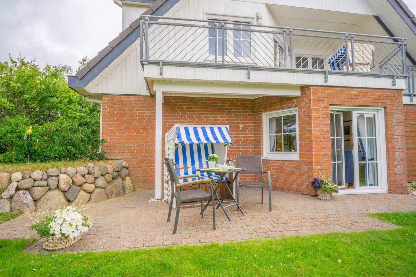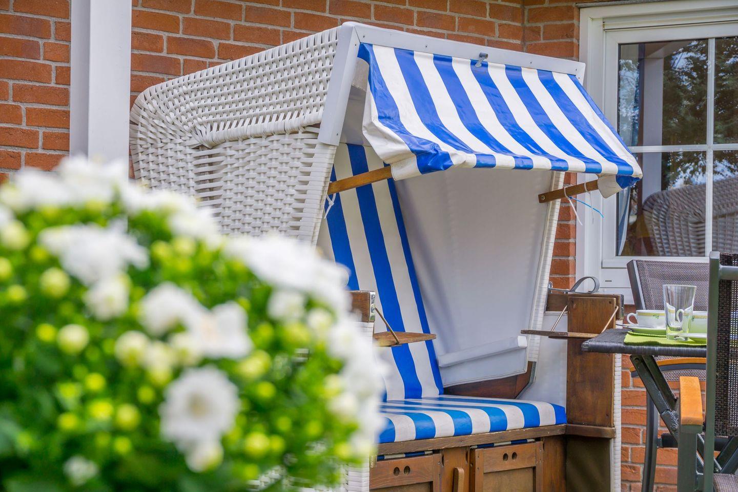 Im Außenbereich lädt die mit Gartenmöbeln ausgestattete Terrasse zum Verweilen ein. Von hier genießen Sie den Blick auf den grünen Garten und können im hauseigenen Strandkorb entspannen. Der gepflegte Garten erweitert Ihren Freiraum und schafft einen Rückzugsort an der frischen Seeluft von Sylt.