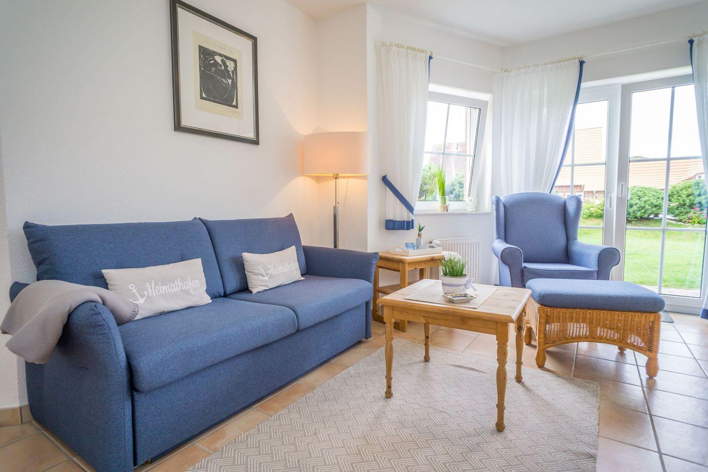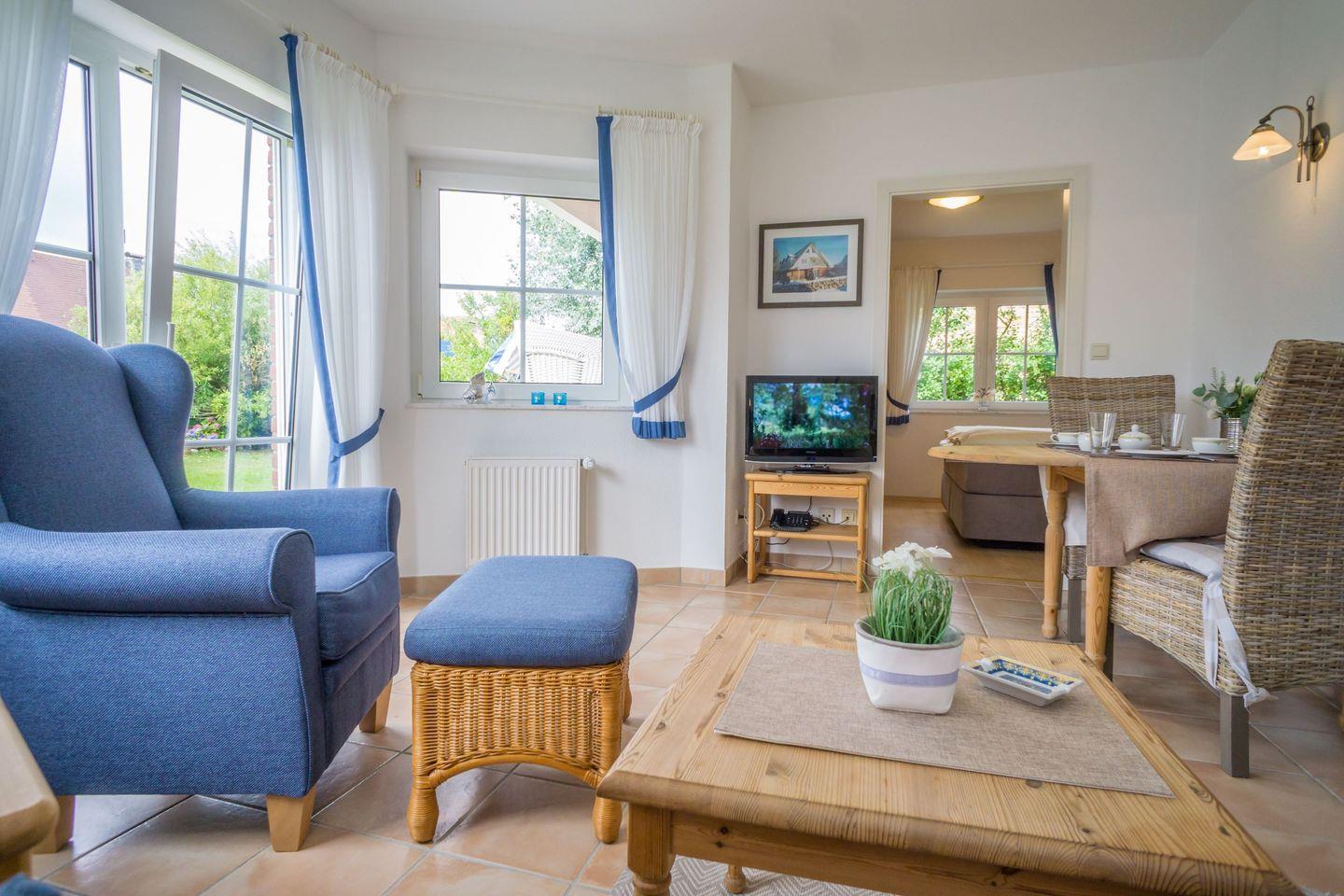 Das helle Wohnzimmer ist mit Fliesenboden ausgestattet und bietet eine gemütliche Sofaecke mit zusätzlichem Sessel, Esstisch sowie Satelliten-TV (25–34 Zoll). Hier können Sie entspannen, lesen oder sich bei einem Filmabend erholen. Für Unterhaltung sorgen auch bereitgestellte Bücher. Die moderne Heizung sorgt zu jeder Jahreszeit für angenehme Temperaturen. Große Fenster lassen viel Tageslicht herein und geben Ihnen einen schönen Blick in den privaten Garten.