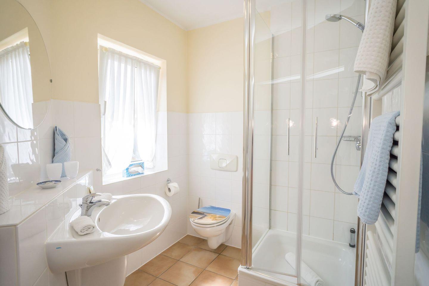 Das Badezimmer ist modern gestaltet und verfügt über eine Dusche, Waschbecken, WC sowie Spiegel und Kosmetikspiegel. Ein Haartrockner ist ebenfalls vorhanden, sodass Sie Ihr Reisegepäck entlasten können. Ein Rauchmelder sorgt für zusätzliche Sicherheit.