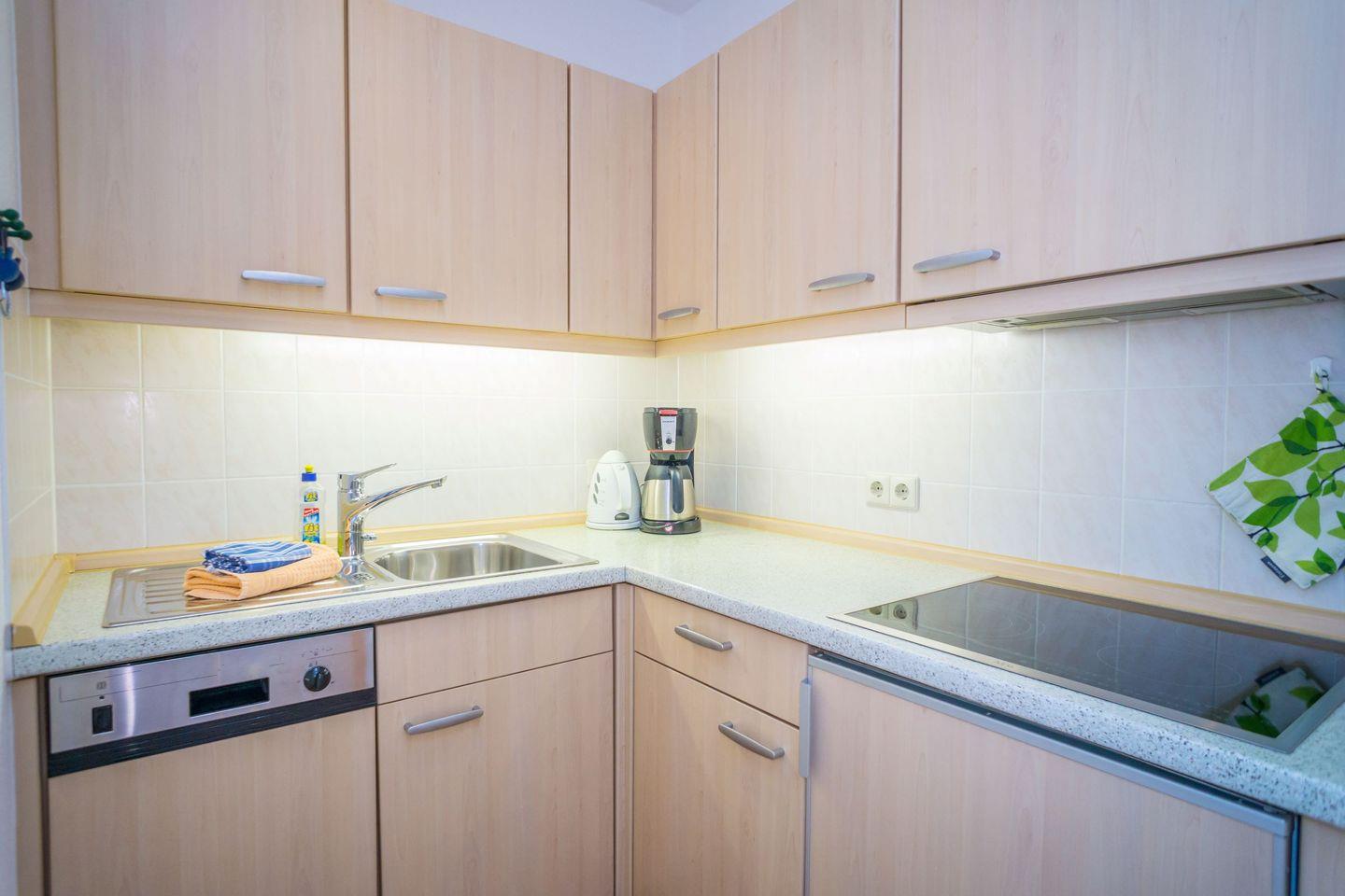Die abgeschlossene Küche ist voll ausgestattet und lässt für Selbstversorger keine Wünsche offen: Ein moderner Ceranherd, Kühlschrank, Spülmaschine, Gefrierfach (im Kühlschrank integriert), Kaffeemaschine, Wasserkocher, Toaster sowie umfangreiches Küchenzubehör und Geschirr stehen zur Verfügung. Warme Mahlzeiten können ohne Aufwand zubereitet werden, und dank des eigenen Essbereichs genießen Sie Ihre Speisen in einer angenehmen Atmosphäre.
