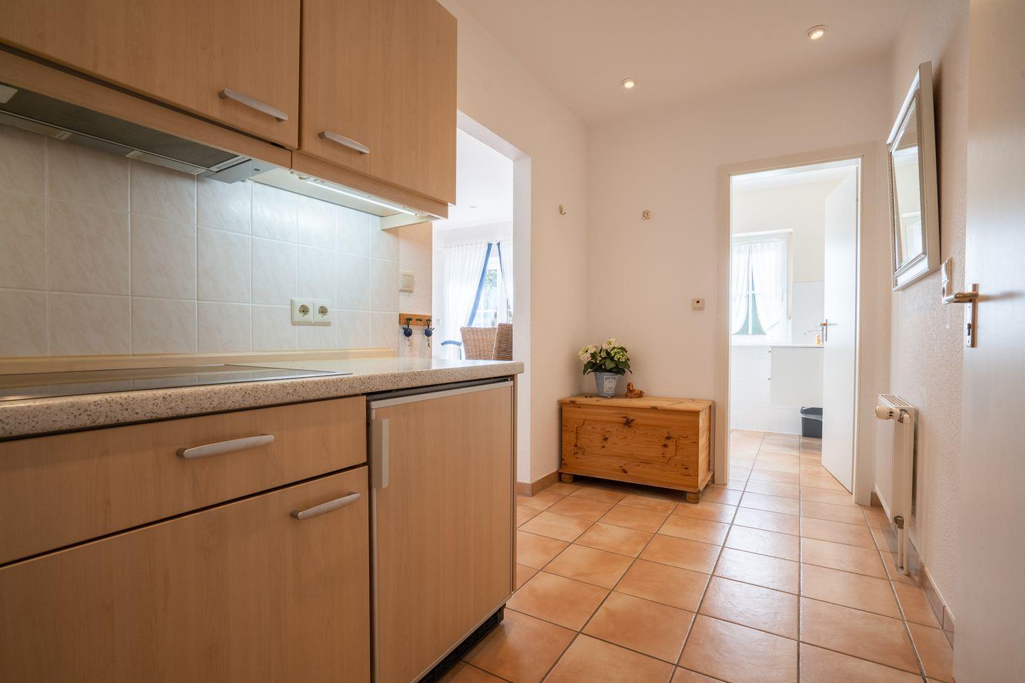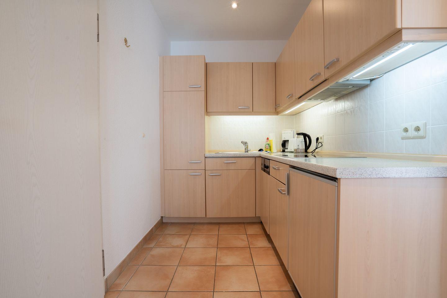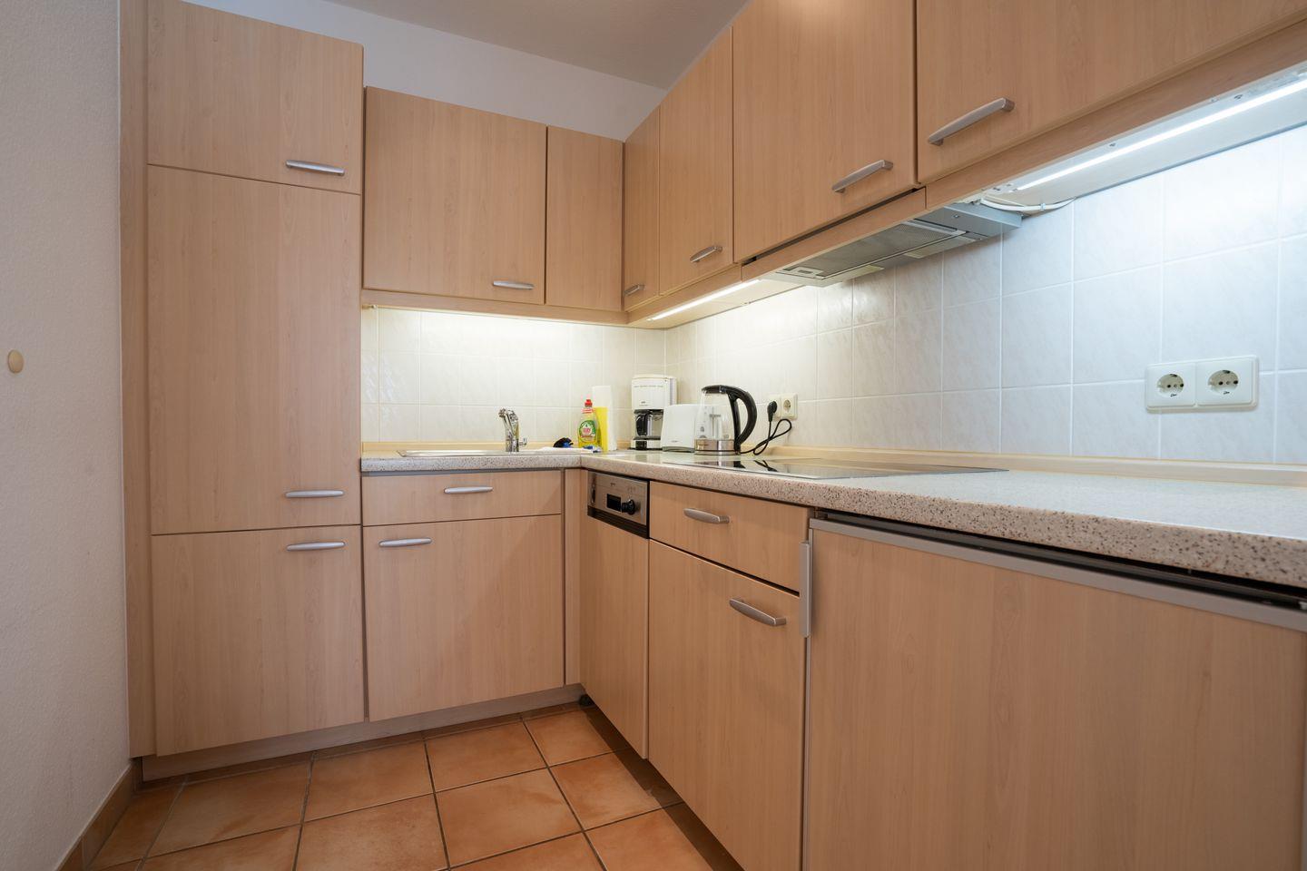 Die Küche ist geschlossen, funktional und komplett ausgestattet. Sie verfügt über ein Cerankochfeld, einen Kühlschrank mit integriertem Gefrierfach, eine Spülmaschine, Kaffeemaschine, Toaster, Wasserkocher sowie ausreichend Geschirr, Besteck und Küchenutensilien. Hier können Sie sich ganz flexibel selbst versorgen – vom schnellen Frühstück bis zum gemütlichen Abendessen. Der Essbereich mit Tisch schafft einen angenehmen Platz für gemeinsame Mahlzeiten oder Spieleabende.