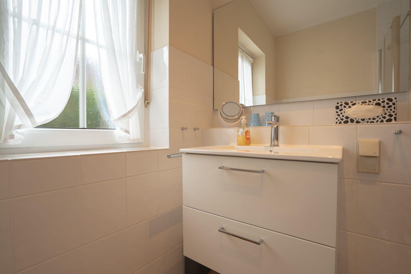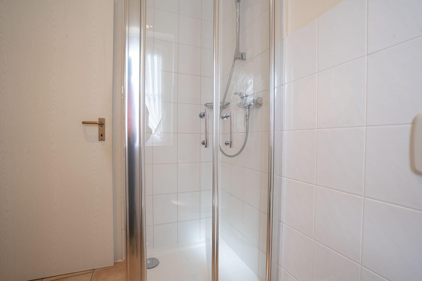 Das Badezimmer ist hell und zweckmäßig eingerichtet. Es bietet eine bodengleiche Dusche, ein Waschbecken, WC, einen Haartrockner, einen Kosmetikspiegel sowie ein Fenster für Tageslicht und gute Belüftung. Ein Wäscheständer steht in der Wohnung zur Verfügung. Bügeleisen, Bügelbrett und Staubsauger finden Sie zur gemeinschaftlichen Nutzung im Flur des Hauses – praktisch, auch für längere Aufenthalte.