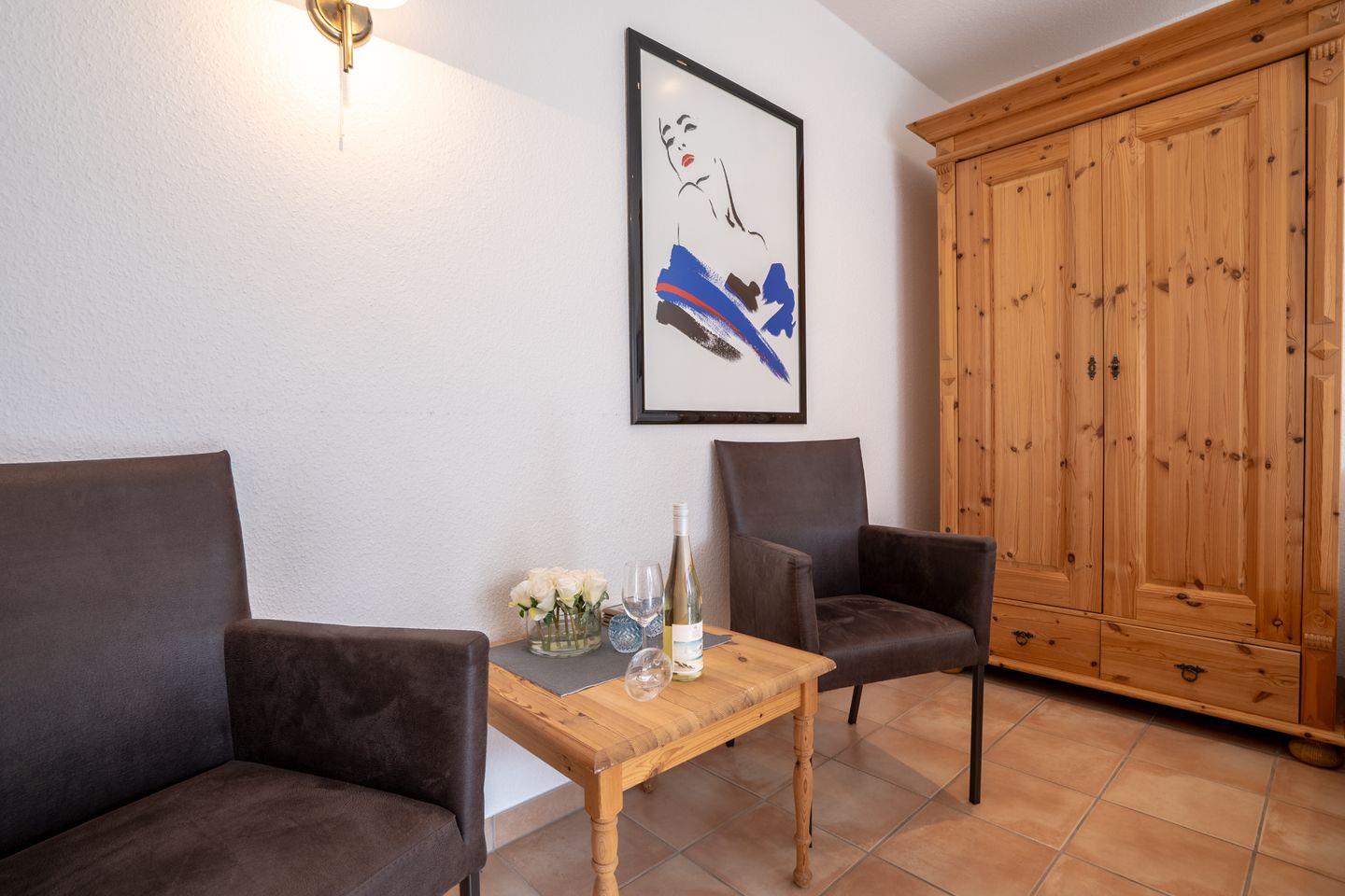 Der kombinierte Wohn- und Schlafbereich ist mit modernen Fliesenböden ausgestattet, die nicht nur pflegeleicht, sondern auch optisch ansprechend und angenehm kühl im Sommer sind. Zwei Schlafplätze sorgen für erholsame Nächte. Ein Satelliten-TV (25–34 Zoll) sowie kostenloses WLAN bieten Unterhaltung und Komfort. Wer gerne schmökert, findet im Flur des Hauses eine kleine Auswahl an Büchern zur gemeinschaftlichen Nutzung – ideal für entspannte Lesestunden.