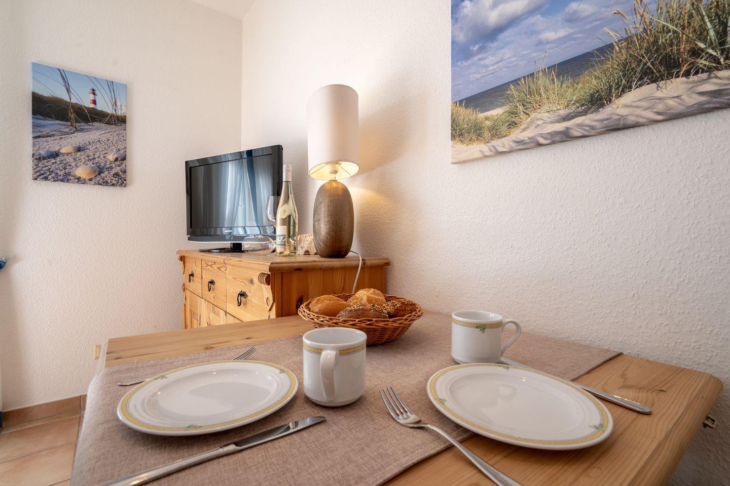 "Pauls Nest" in List bietet Ihnen auf 32 m² eine komfortable Unterkunft für zwei Personen, ausgestattet mit einem Schlafzimmer, moderner geschlossener Küche mit Spülmaschine, WLAN, TV, Terrasse und Strandkorb.