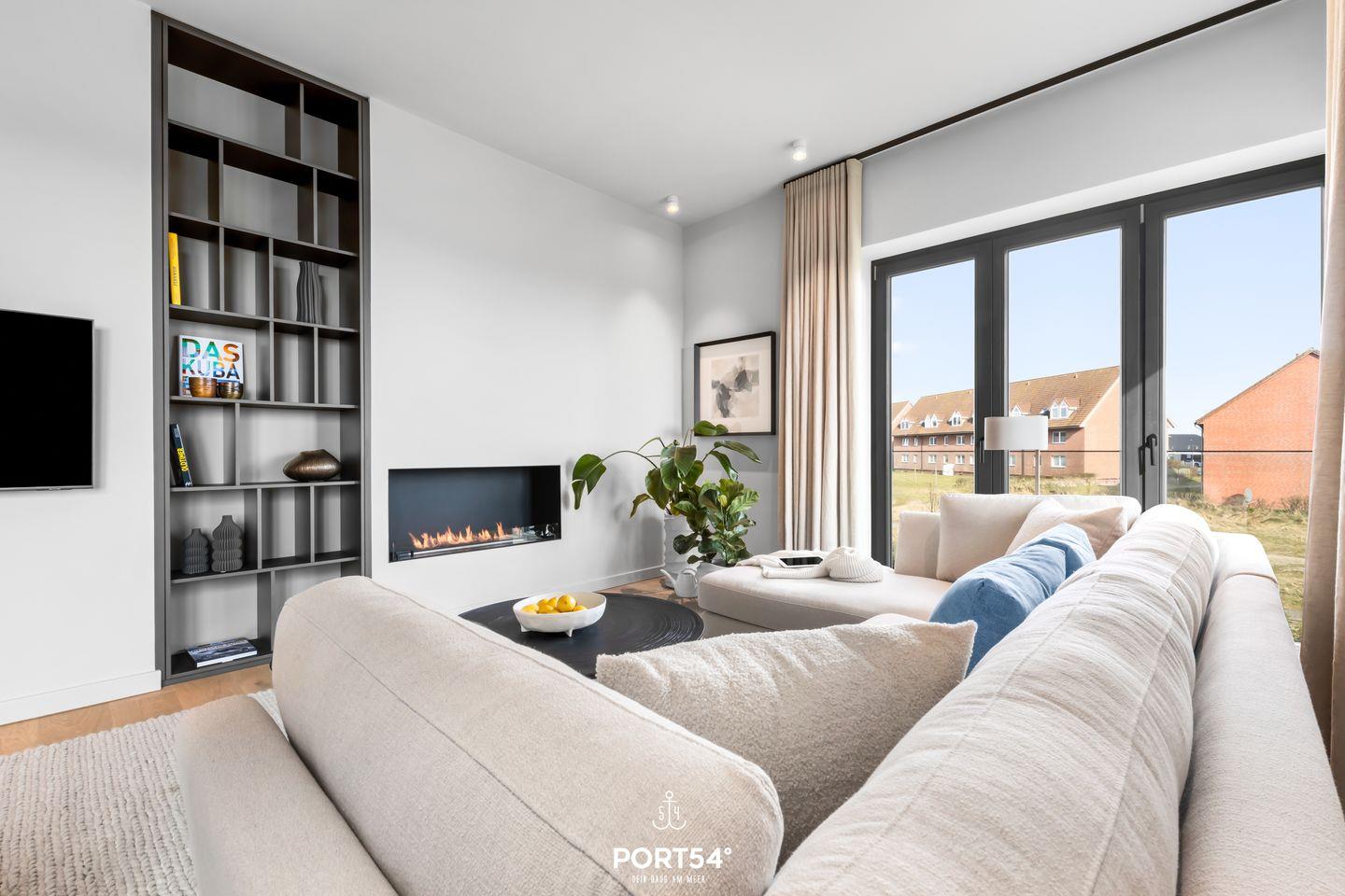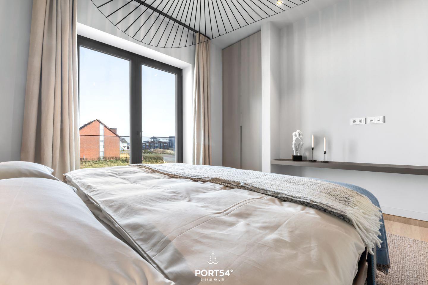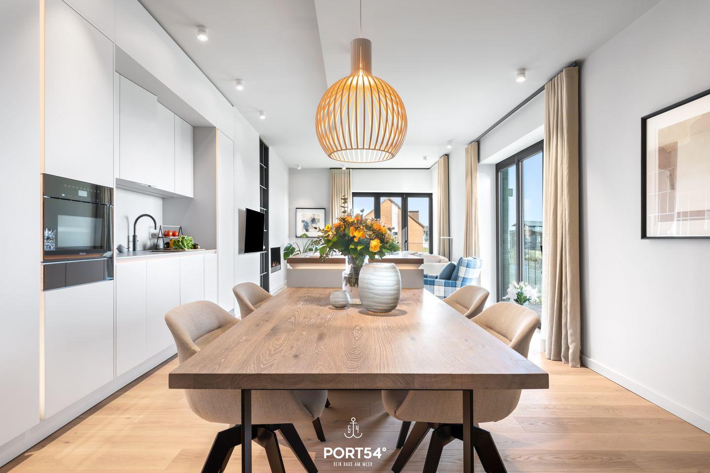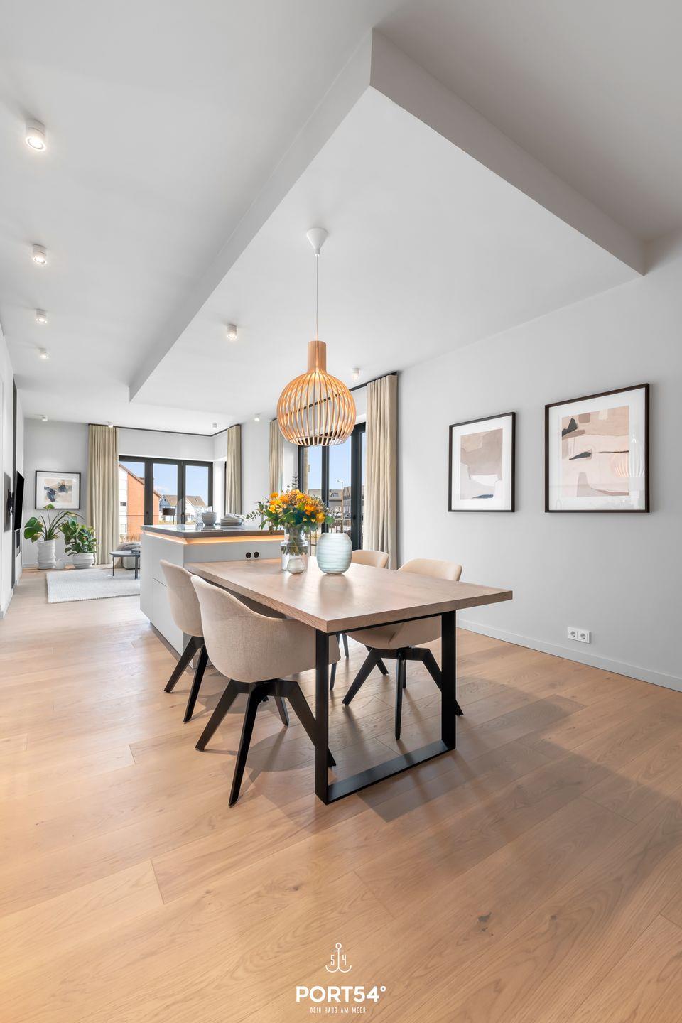 Ein offener Wohnbereich mit großzügiger Sofaecke, Ethanol-Kamin und Esstisch lädt zum Verweilen ein und bietet einen perfekten Ort für gesellige Abende. Die voll ausgestattete offene Küche von SieMatic punktet mit modernen Geräten wie einem Induktionsherd, Backofen, Kühlschrank, Spülmaschine und einem Weinkühlschrank. Hier kannst du kreative Gerichte zubereiten oder einfach das Frühstück auf dem Balkon genießen, während du die frische Meeresbrise einatmest. Außerdem findest du in der Küche einen Quooker, mit dem sich problemlos heißes Wasser sowie Sprudelwasser erzeugen lässt.