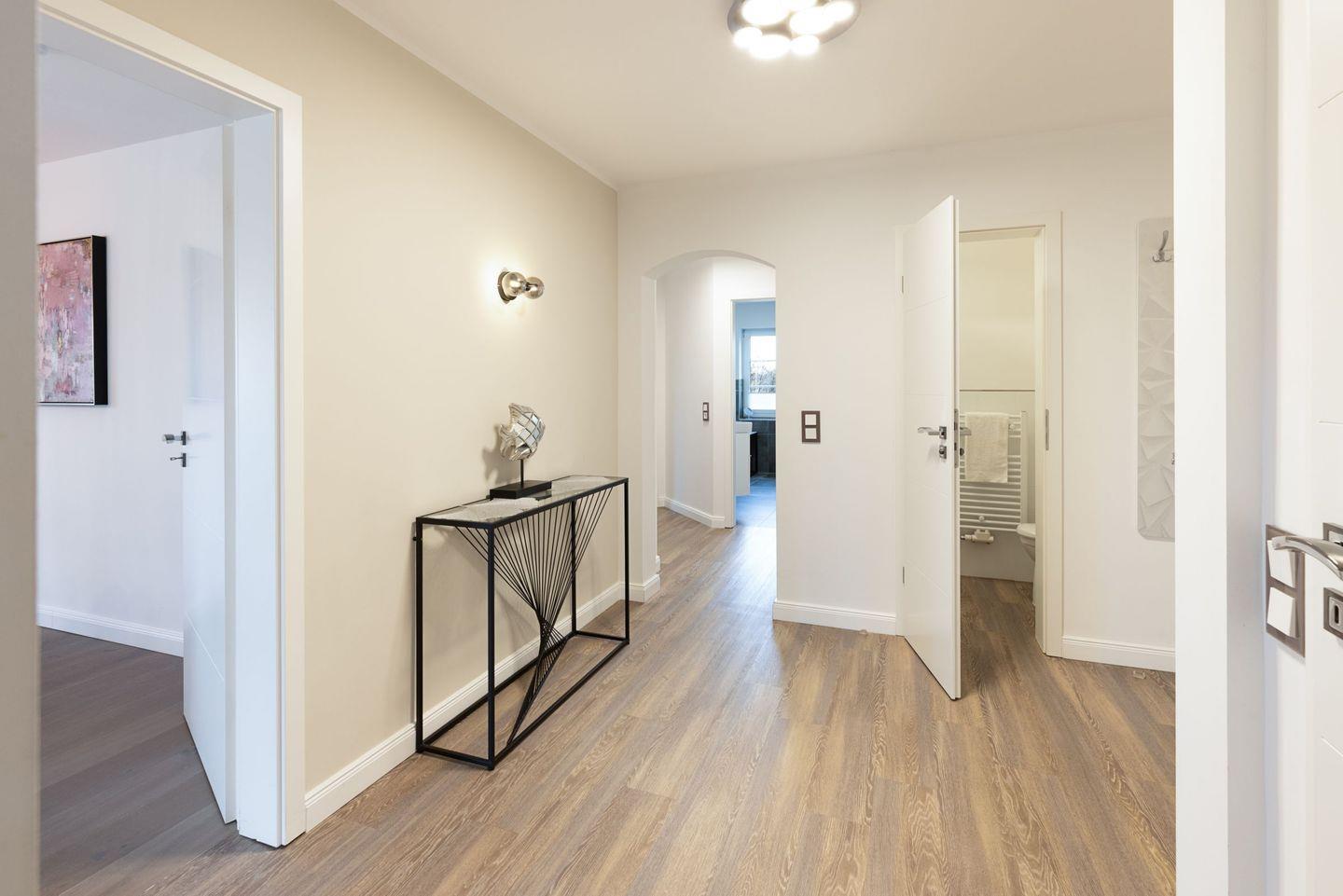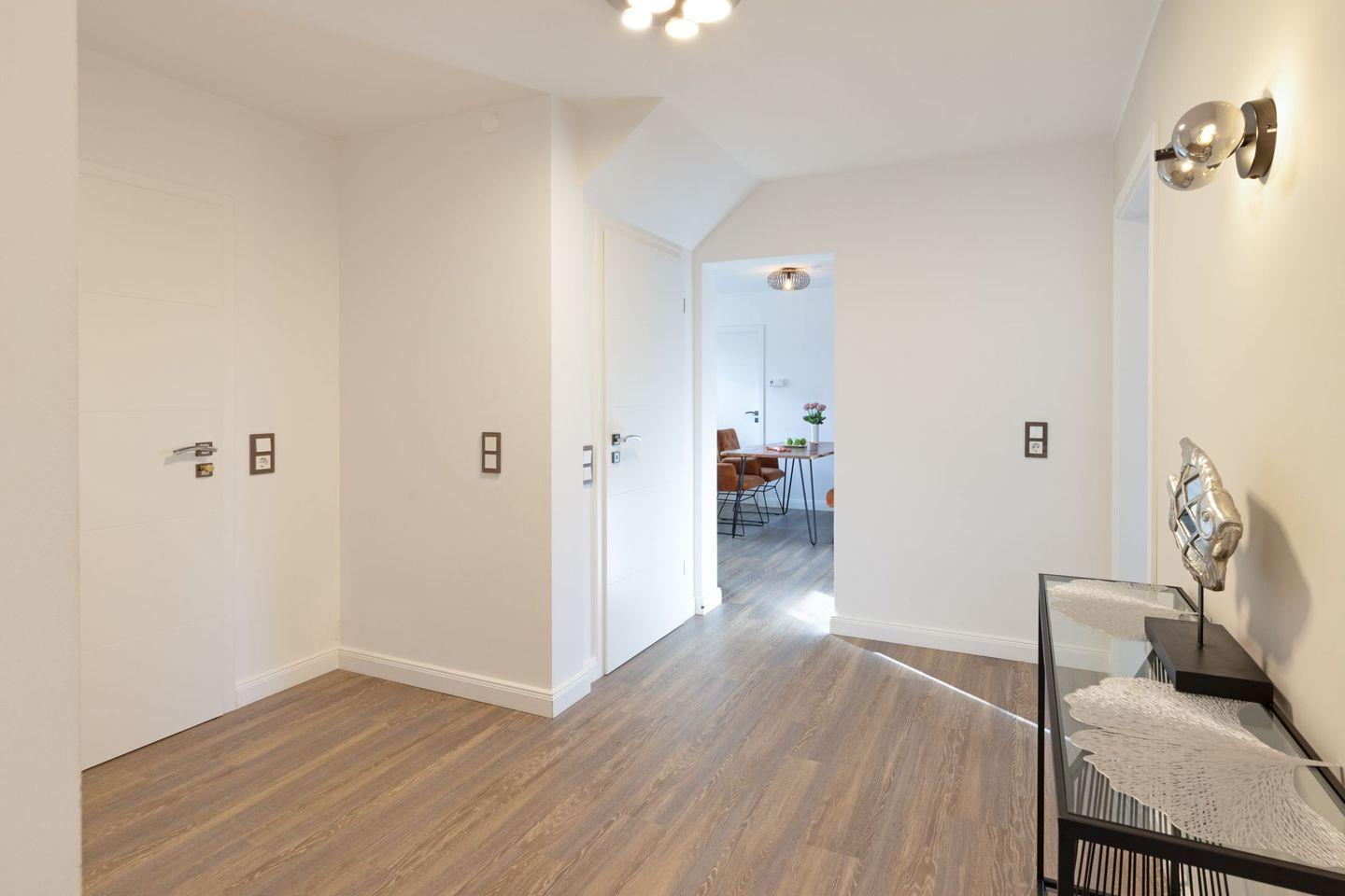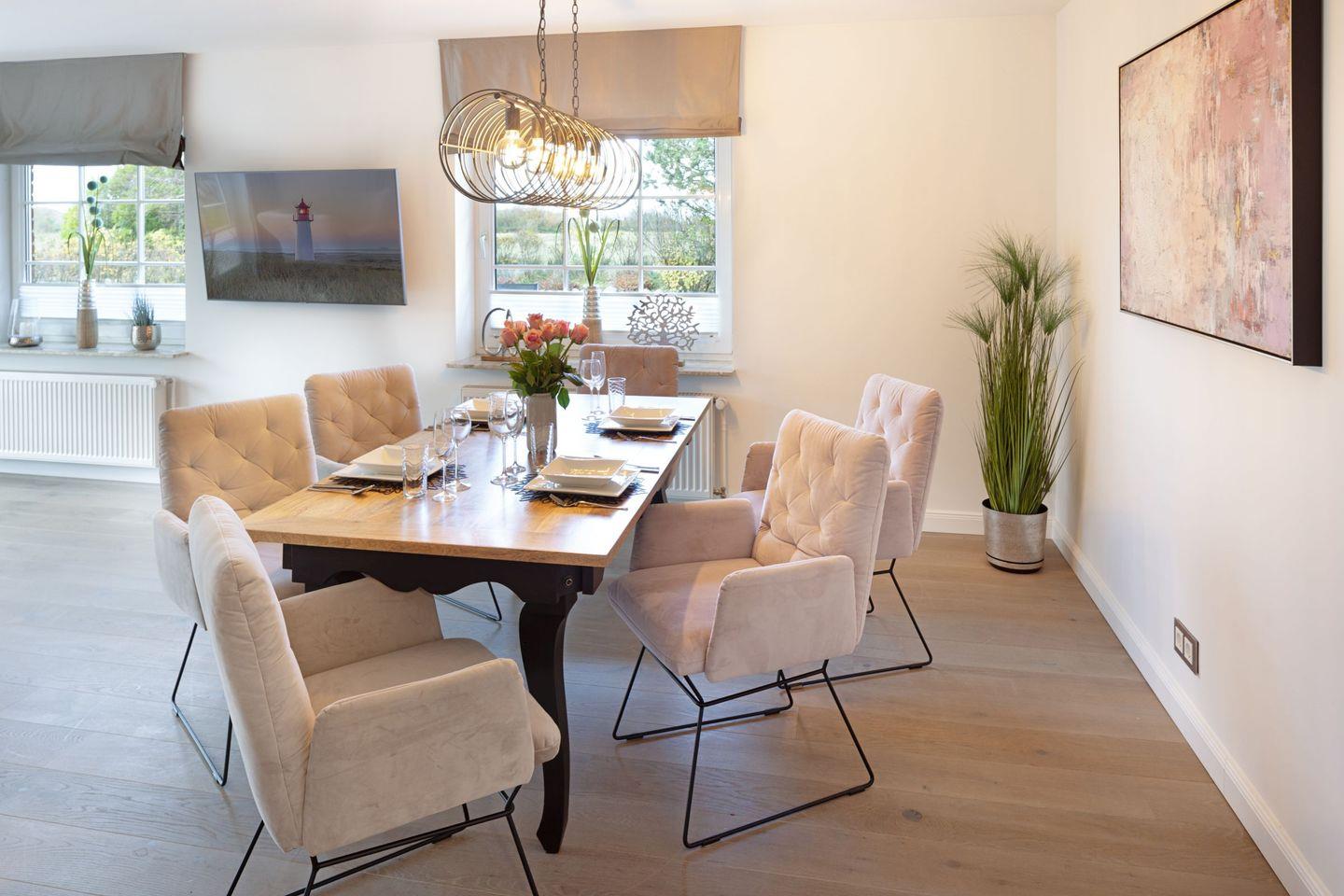 Genießen Sie einen großzügigen, lichtdurchfluteten Wohn- und Essbereich mit Kamin, Echtholzboden und einem atemberaubenden Blick über die Heidelandschaft ein Ambiente, das seinesgleichen sucht. Direkt angrenzend befindet sich die moderne Küche, die keine Wünsche offenlässt. Vom Wohnbereich aus gelangen Sie direkt auf die West-Terrasse und in den Garten, ausgestattet mit saisonal verfügbaren Gartenmöbeln perfekt für entspannte Stunden im Freien.