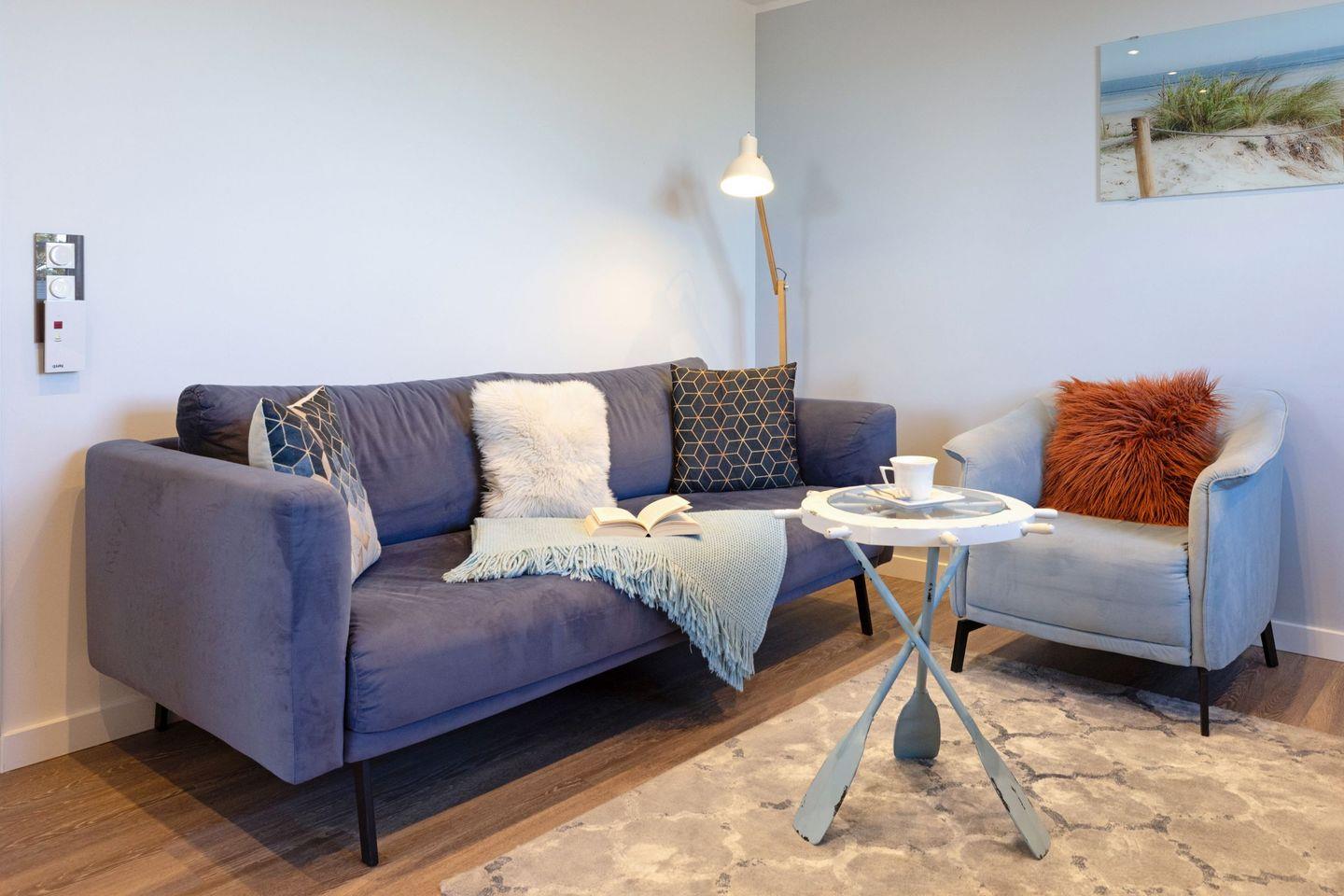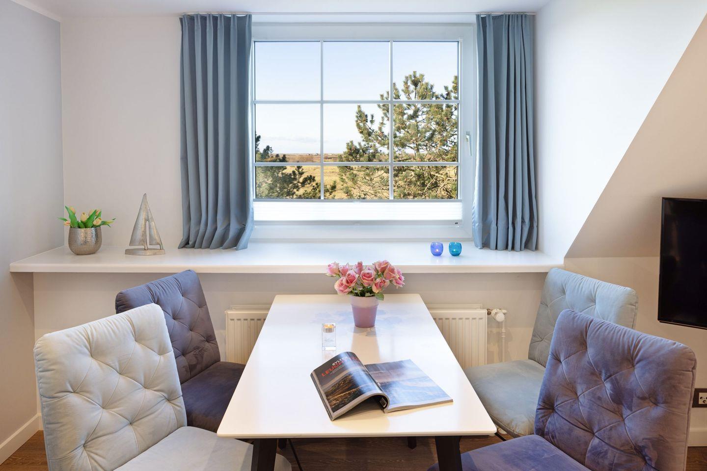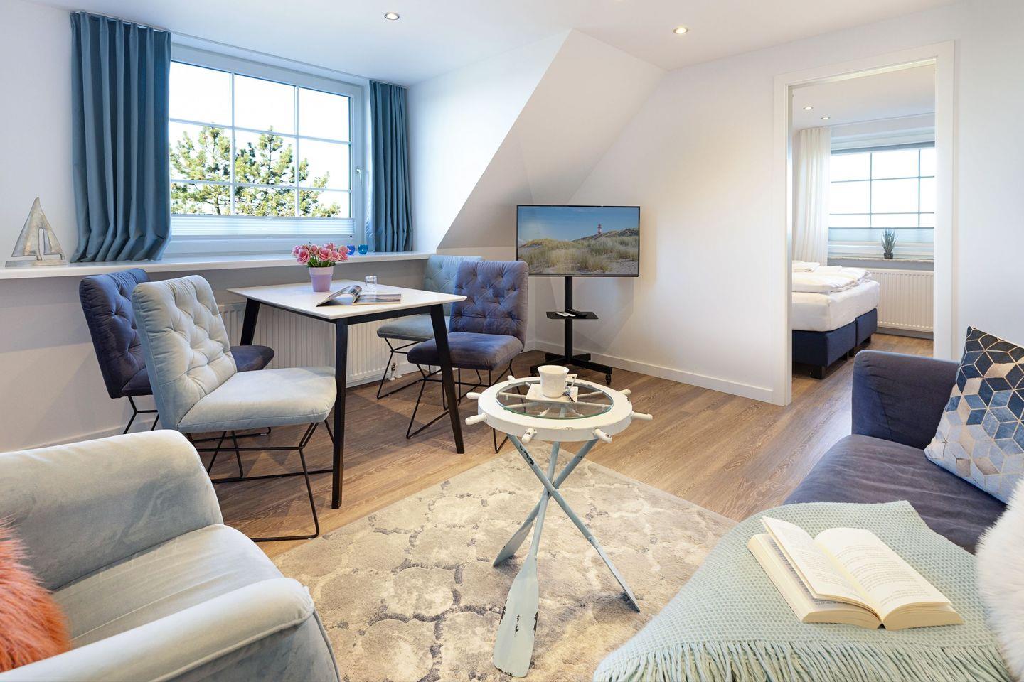 Das Appartement Oceanview in List auf Sylt vereint Komfort und Erholung an der Nordsee. Nur 300?Meter vom Strand entfernt, bietet der Wohnbereich einen schönen Ausblick auf Dünen und Meer.