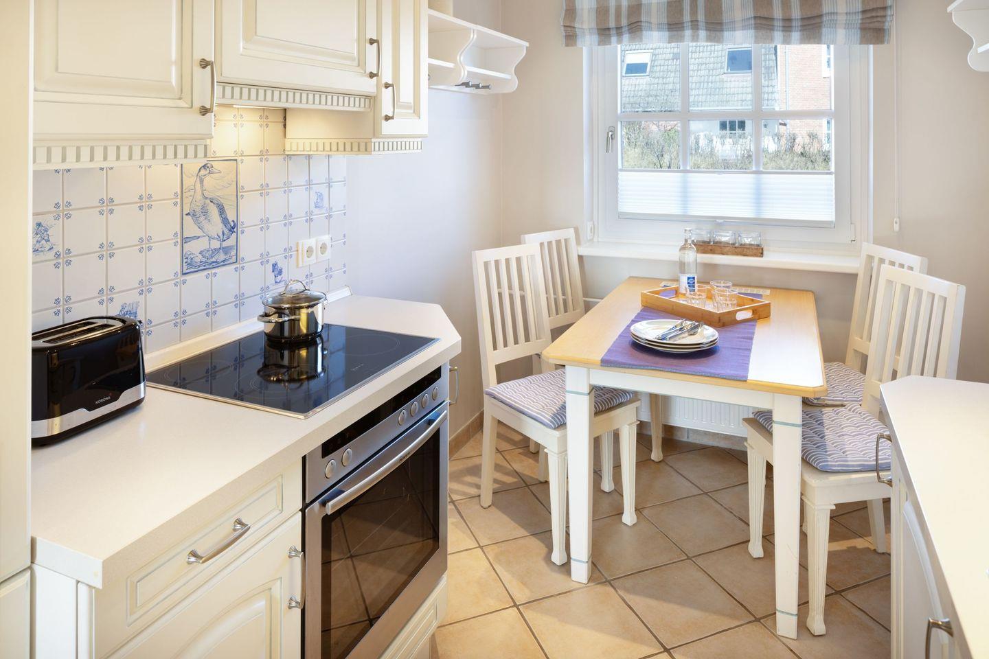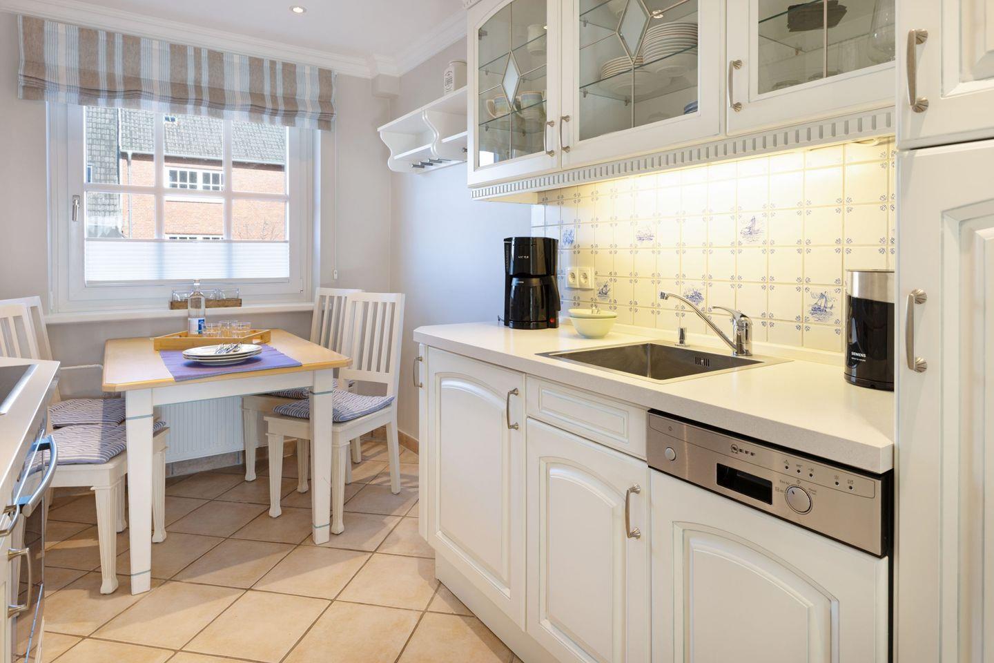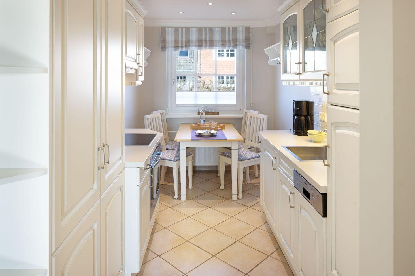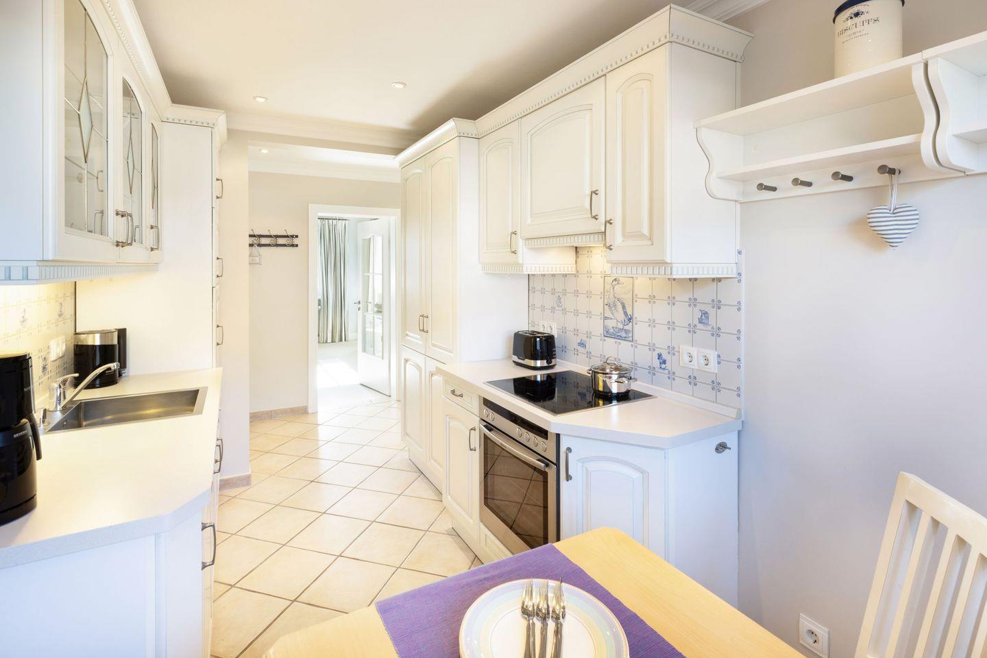 Geschlossene Küche mit Cerankochfeld, Backofen, Kühlschrank, Spülmaschine, Kaffeemaschine und Nespresso-Maschine