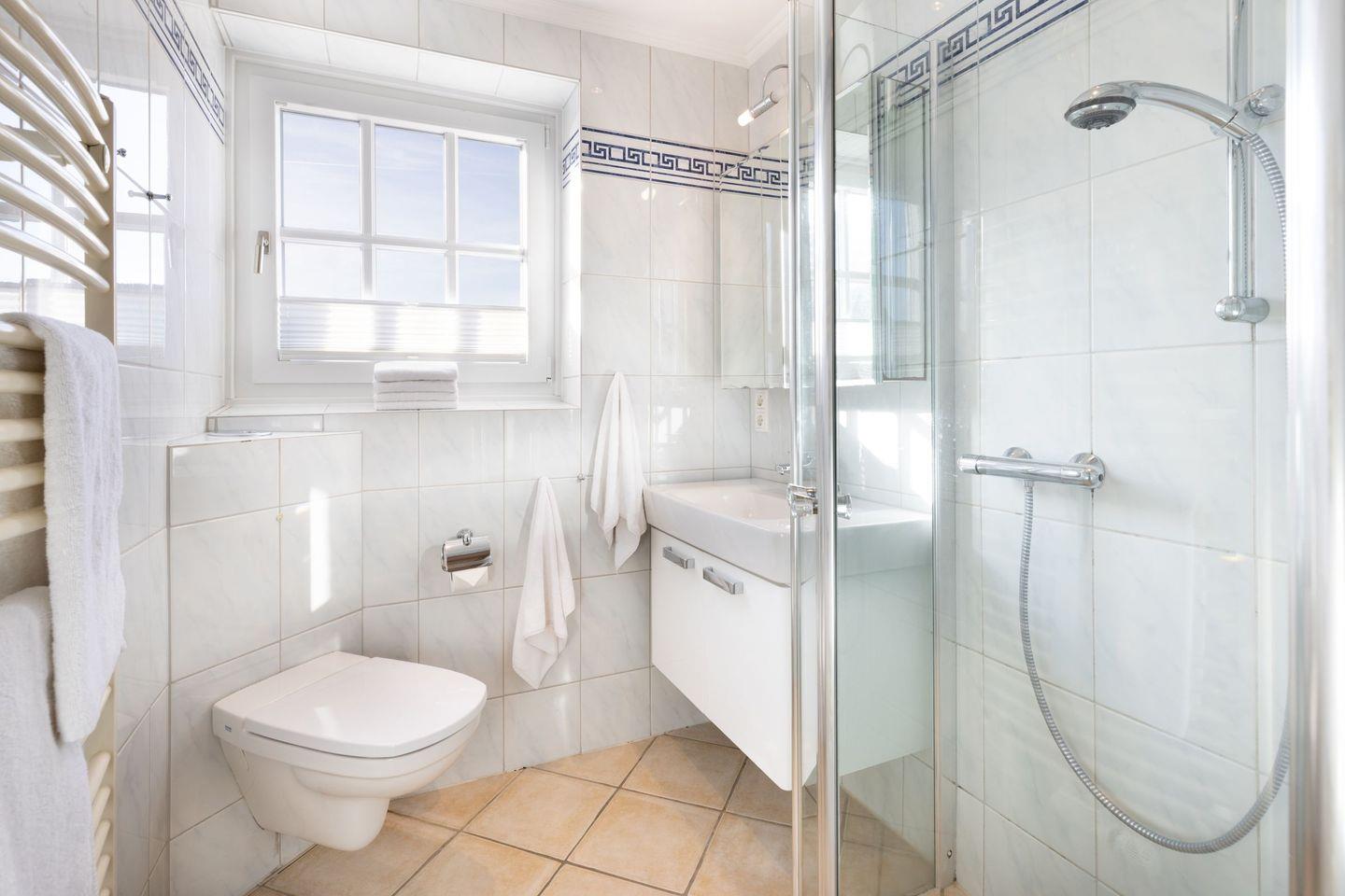 Modernes Badezimmer mit bodengleicher Dusche, WC und Haartrockner