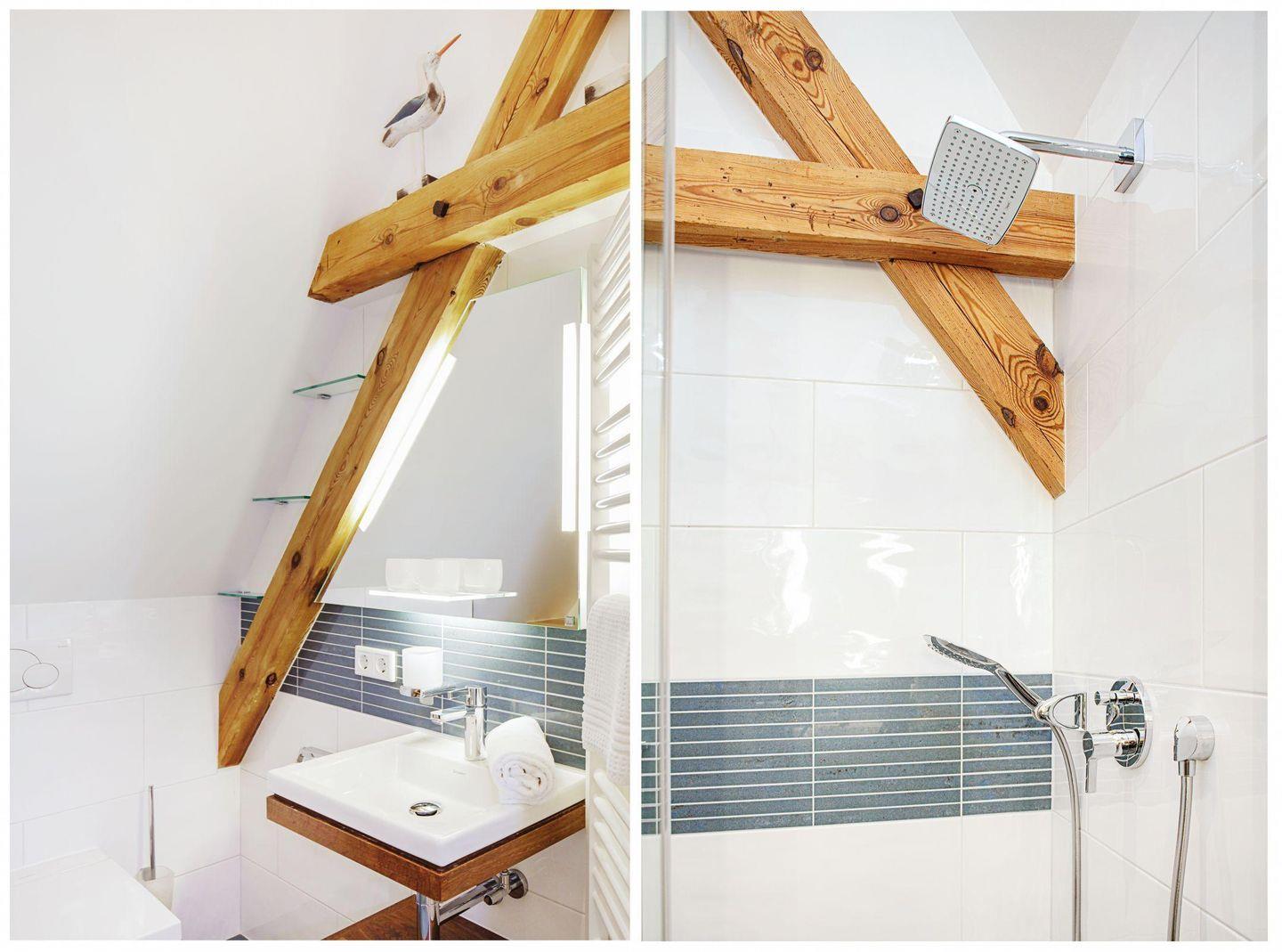 In den oberen Etagen befinden sich drei Schlafräume. Ein mit Doppelbetten, eines mit zwei Einzelbetten. Im DG befindet sich noch ein Doppelbett.