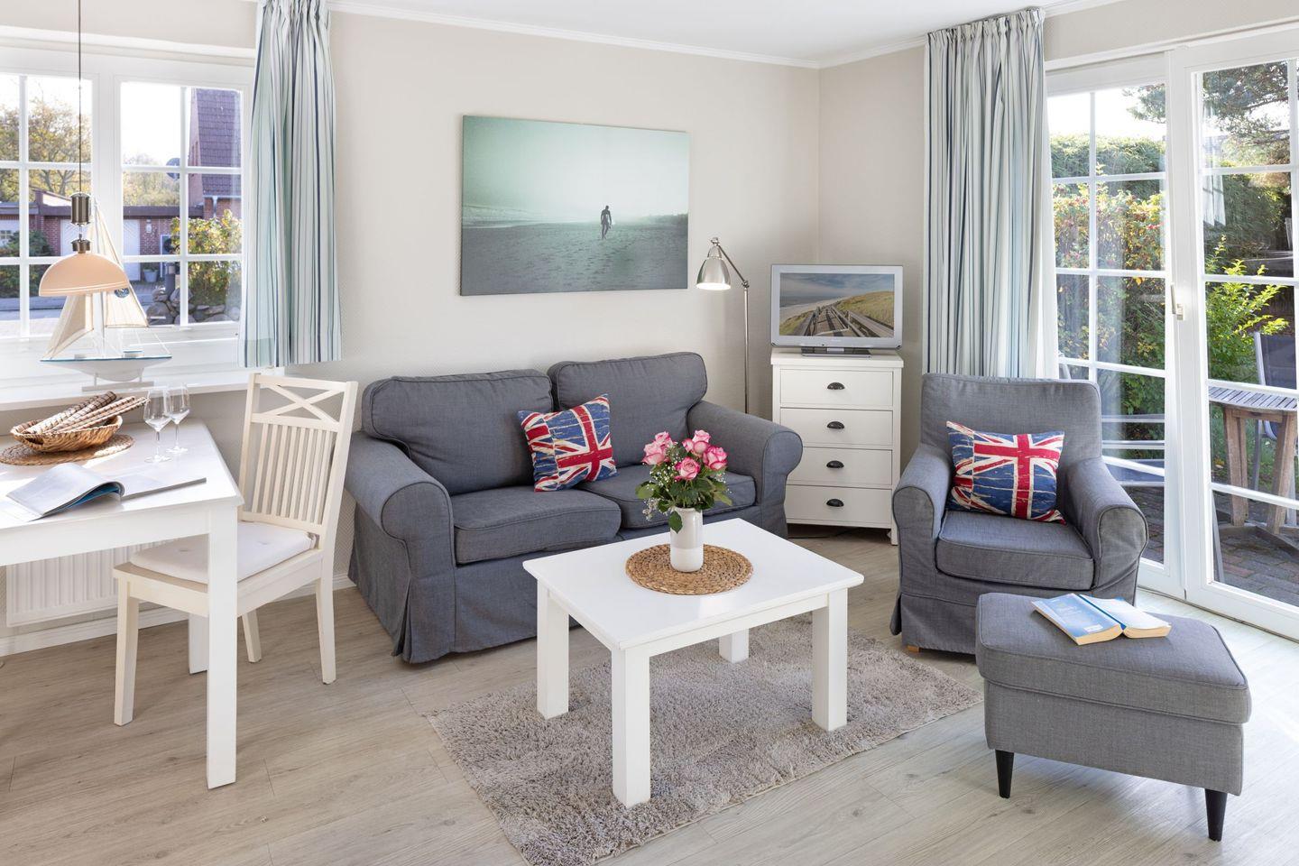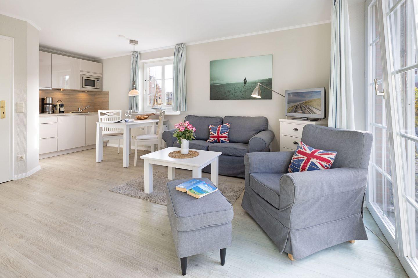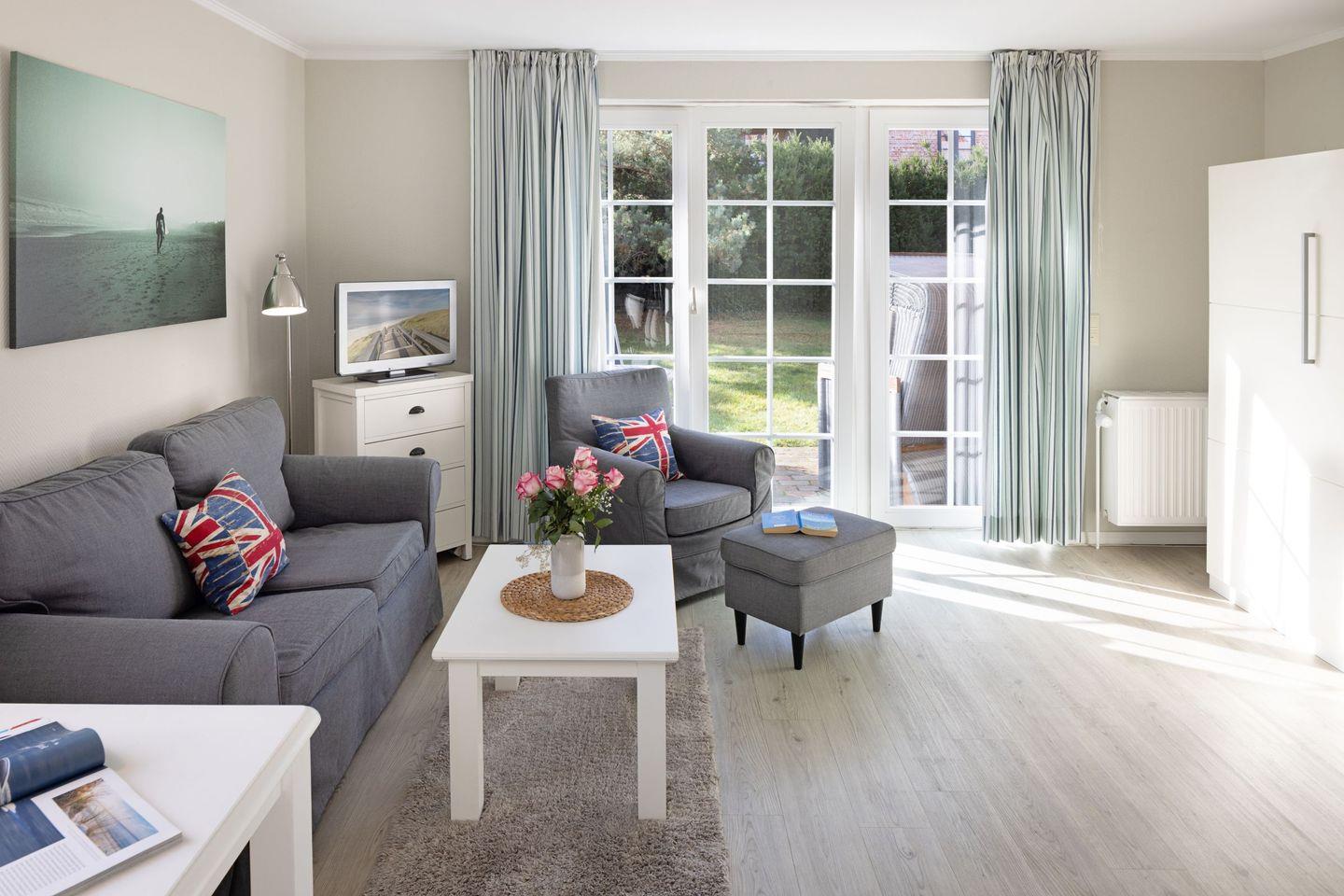 Eine große Besonderheit dieser Wohnung ist die private Terrasse, die mit Gartenmöbeln ausgestattet ist. Genießen Sie hier die frische Luft und die entspannende Atmosphäre, perfekt für ein Frühstück im Freien oder eine Tasse Kaffee am Nachmittag. Der Strand ist nur 1000 Meter entfernt, sodass Sie in kürzester Zeit die Sandstrände von Sylt erreichen können! Auf der Terrasse finden Sie auch einen Strandkorb – ideal, um die Sonne zu genießen und sich zurückzulehnen.