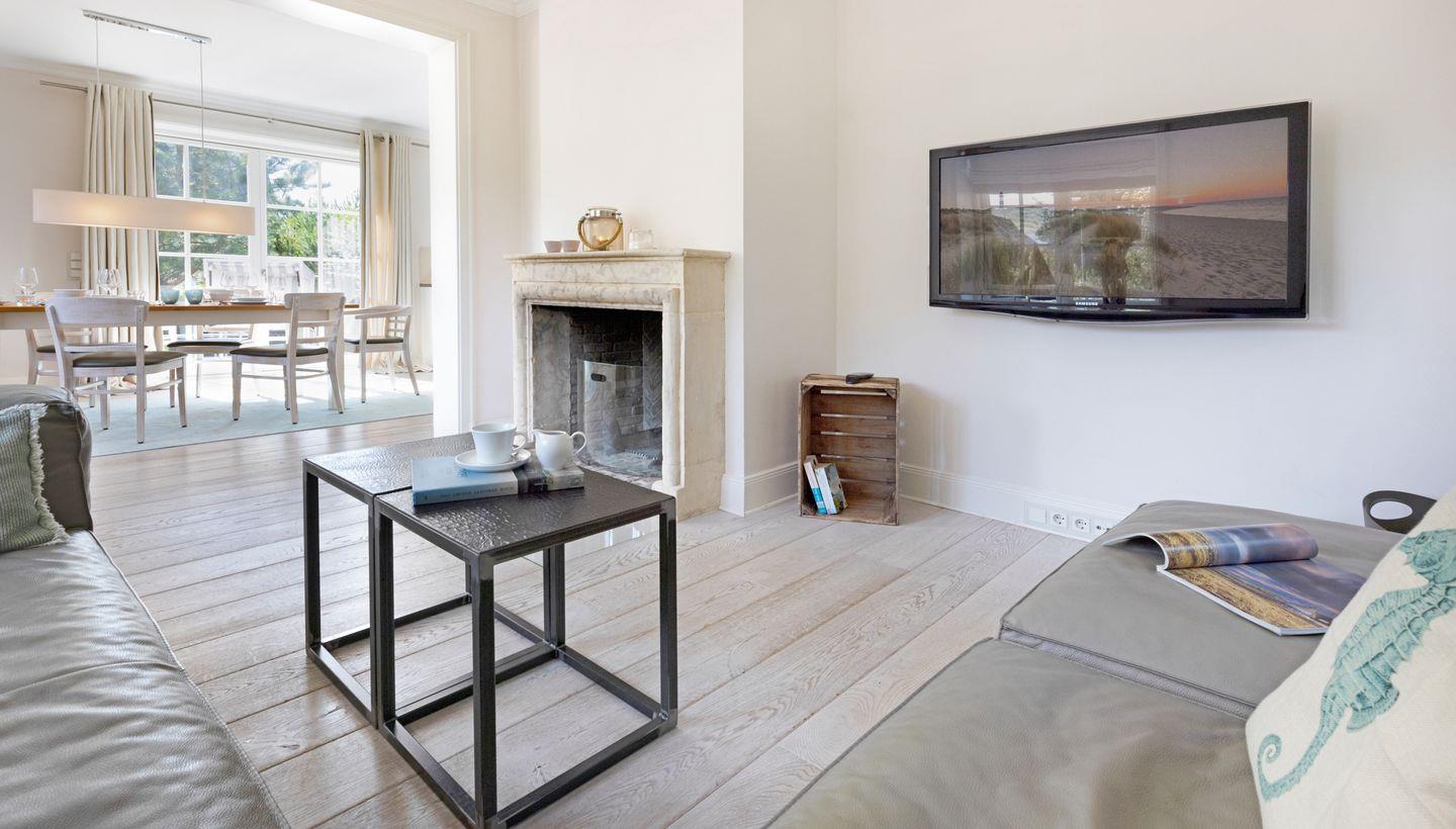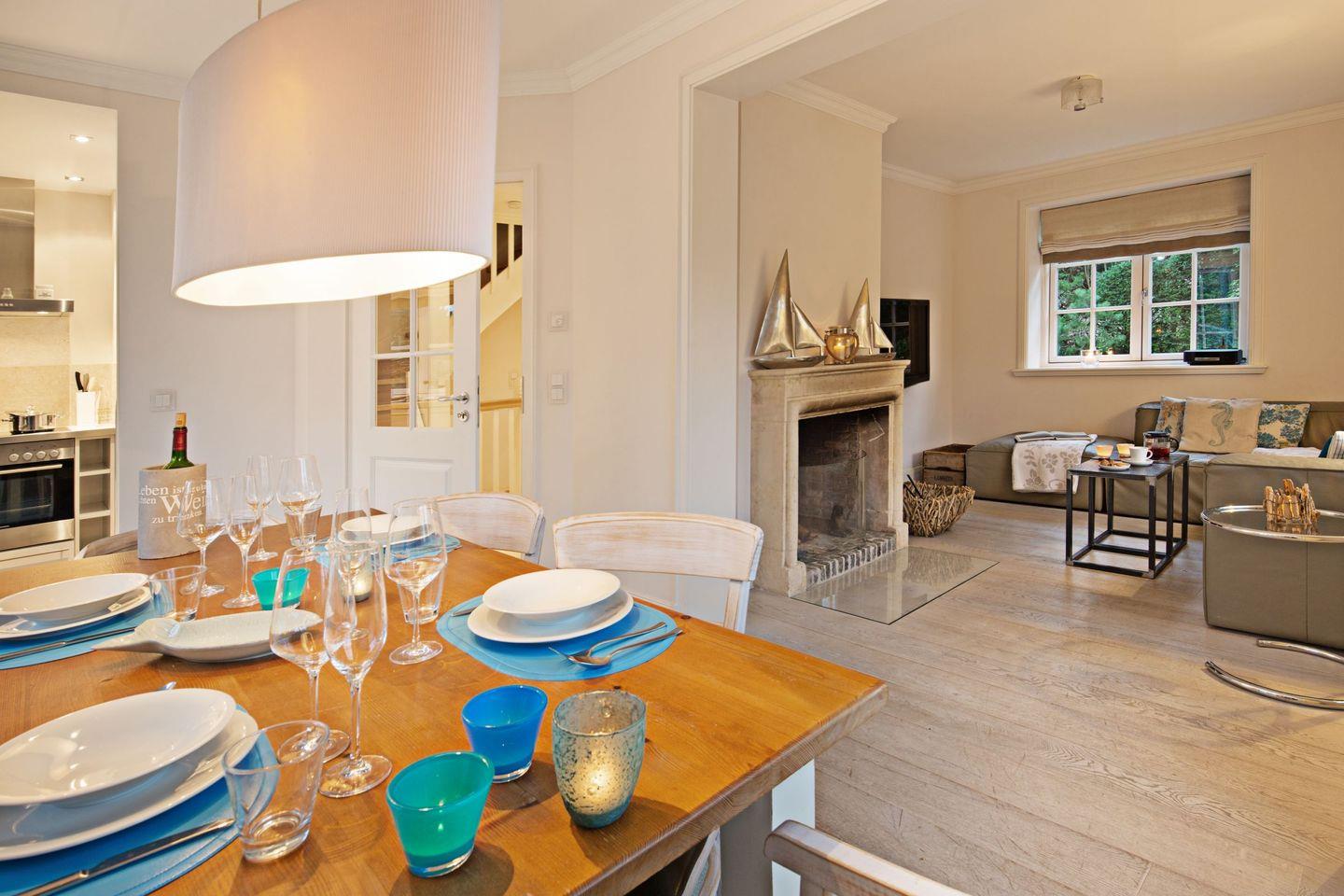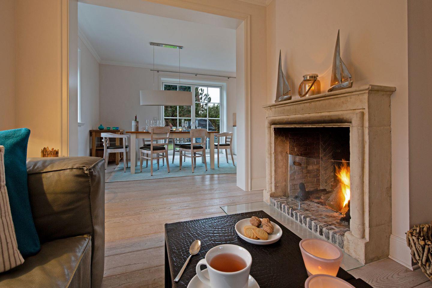 Luxuriöses familienfreundliches Traumdoppelhaus für bis zu vier Personen mit Sauna, offenem Kamin, Garten und Terrasse in Strandnähe.